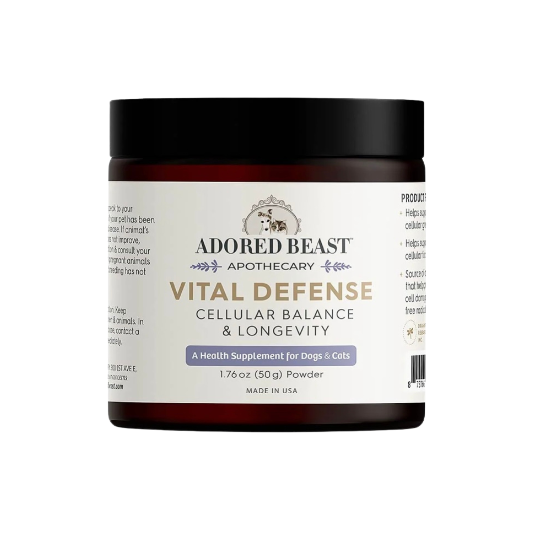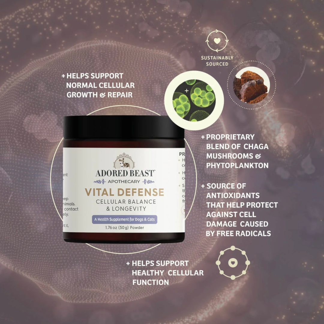 Every day, your dog’s body works hard to defend against hidden stressors—like toxins, inflammation, and oxidative damage—that chip away at cellular health. Adored Beast Vital Defense brings together some of the most powerful antioxidant-rich superfoods in the natural world—including triple-extracted Chaga, marine phytoplankton, chlorella, and spirulina—to help protect your dog’s cells, support the immune system, and nourish the body from the inside out.