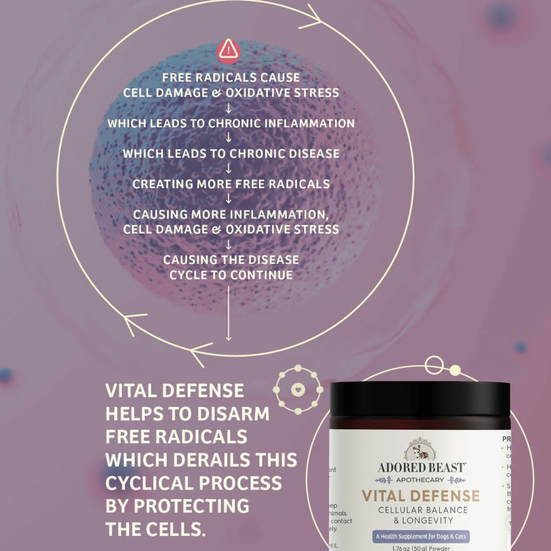 Many chronic health issues—like cancer, autoimmunity, and degenerative disease—start with cellular damage and immune dysregulation. Vital Defense is formulated to protect and repair at the root, helping the body respond to oxidative stress, regulate inflammation, and detox harmful compounds that contribute to disease.
