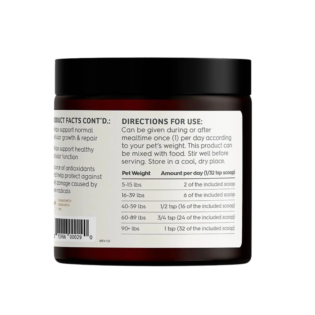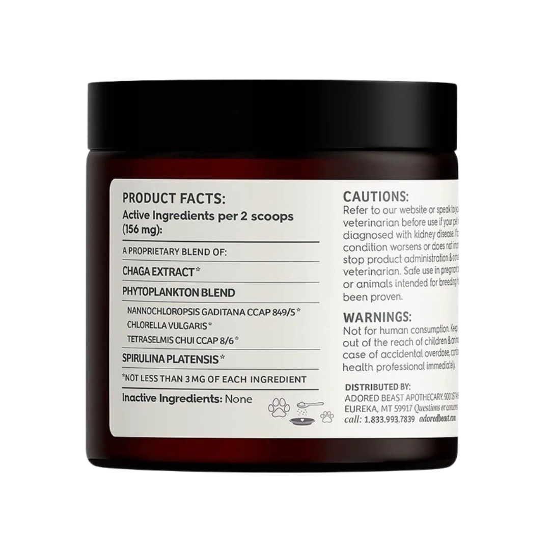 The Chaga mushroom in this formula offers immune-modulating beta-glucans, powerful antioxidants like polyphenols, and melanin, which protects and regenerates tissue. It’s paired with a marine phytoplankton blend that provides essential fatty acids, amino acids, trace minerals, and antioxidant enzymes—all in a whole-food form that’s incredibly easy for the body to use. Chlorella and spirulina add further detox support and anti-inflammatory benefits, making this formula an ideal daily wellness tool for dogs facing illness or just needing a deeper layer of protection.