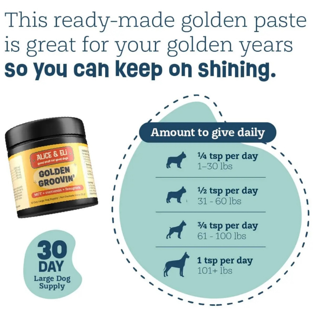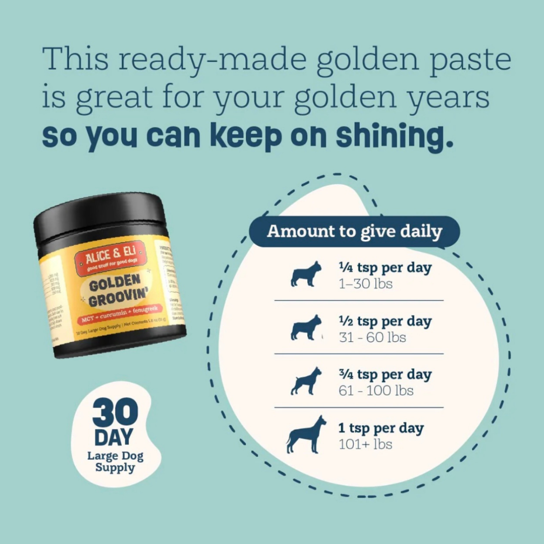 I recently started my senior dog on Alice & Eli Golden Groovin', and I couldn't be happier with the results. His mobility has improved, and he seems much more comfortable during our walks. The bioavailable curcumin formula is a game-changer, especially for his joint health. I've also noticed his coat looks shinier and healthier. It's easy to mix with his food, and he loves the taste. I highly recommend this product to any dog owner looking to support their pet's joint health and overall wellbeing. 5 stars!