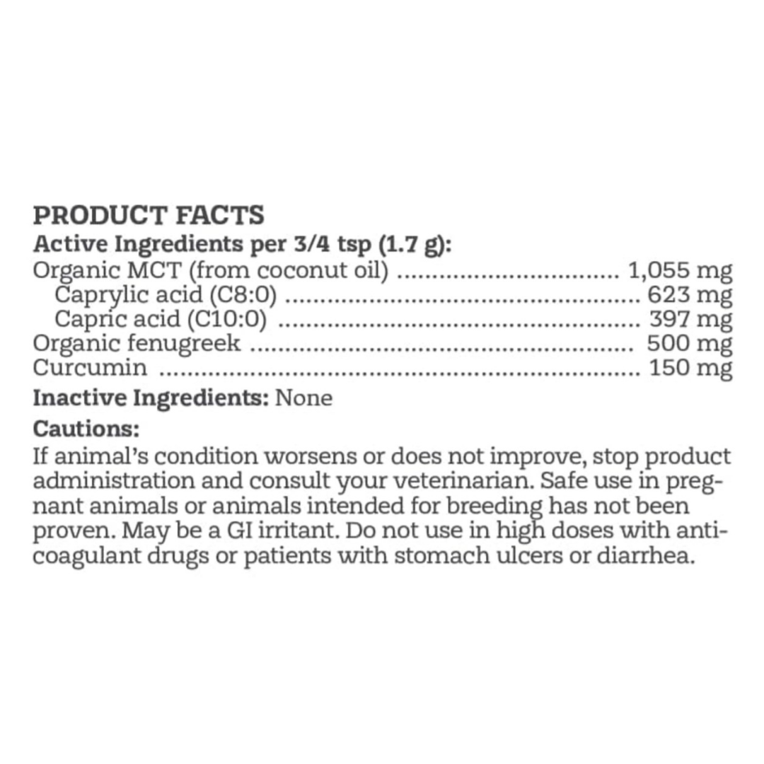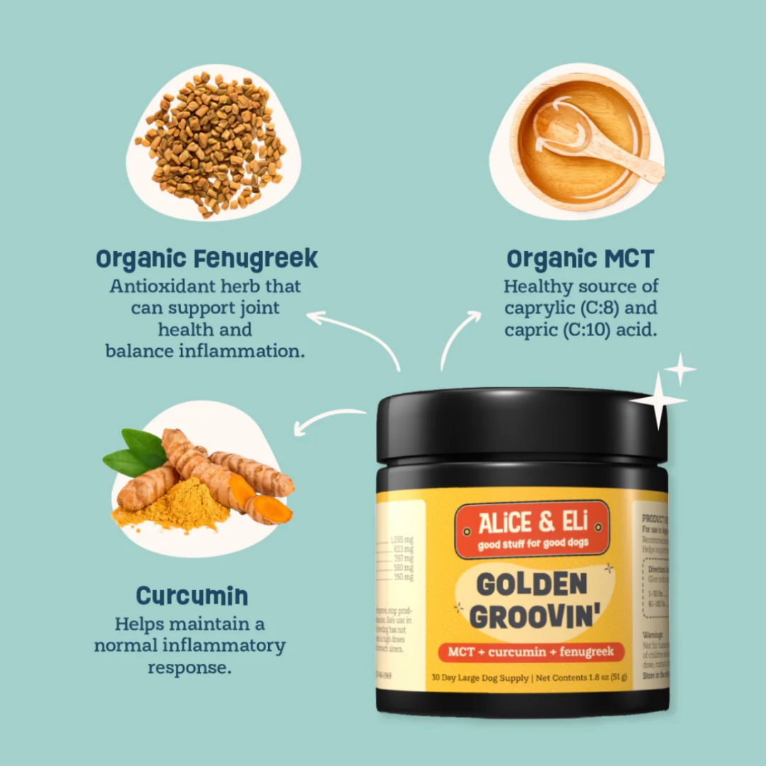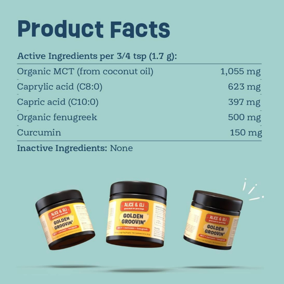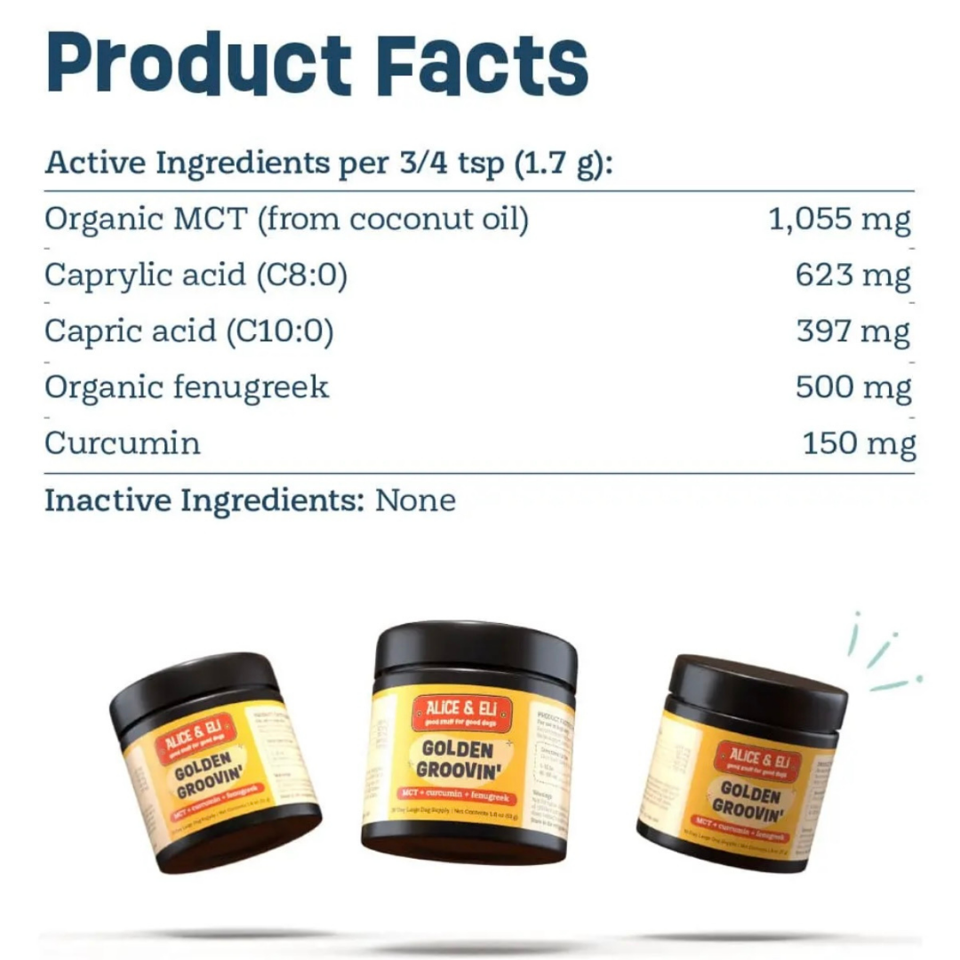 Golden Groovin’ is designed to target inflammation and energy production at the cellular level. Medium-chain triglycerides (MCTs), especially C8 and C10 fatty acids, provide quick fuel for the brain and body while supporting healthy mitochondrial function. Curcumin, a powerful plant-based antioxidant, helps regulate inflammation, while fenugreek offers natural joint and metabolic support. Together, these ingredients create a well-rounded formula that supports your dog’s mobility, brain health, and overall vitality.