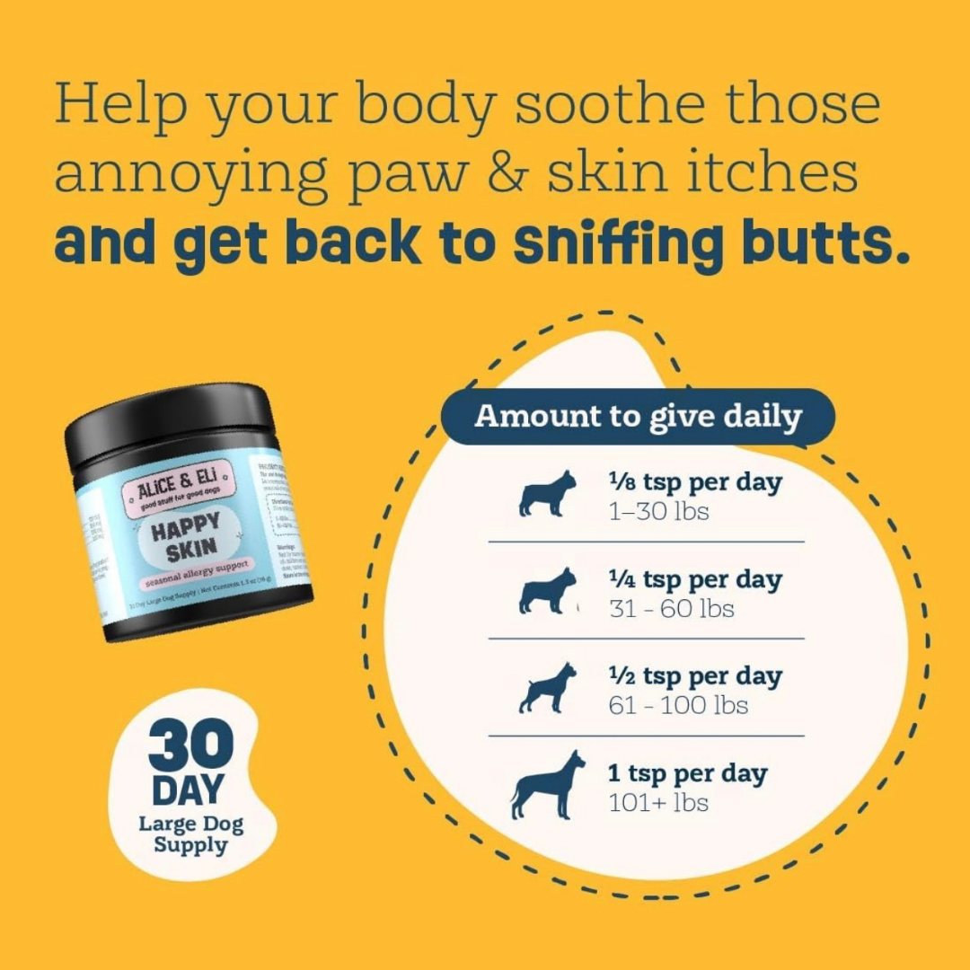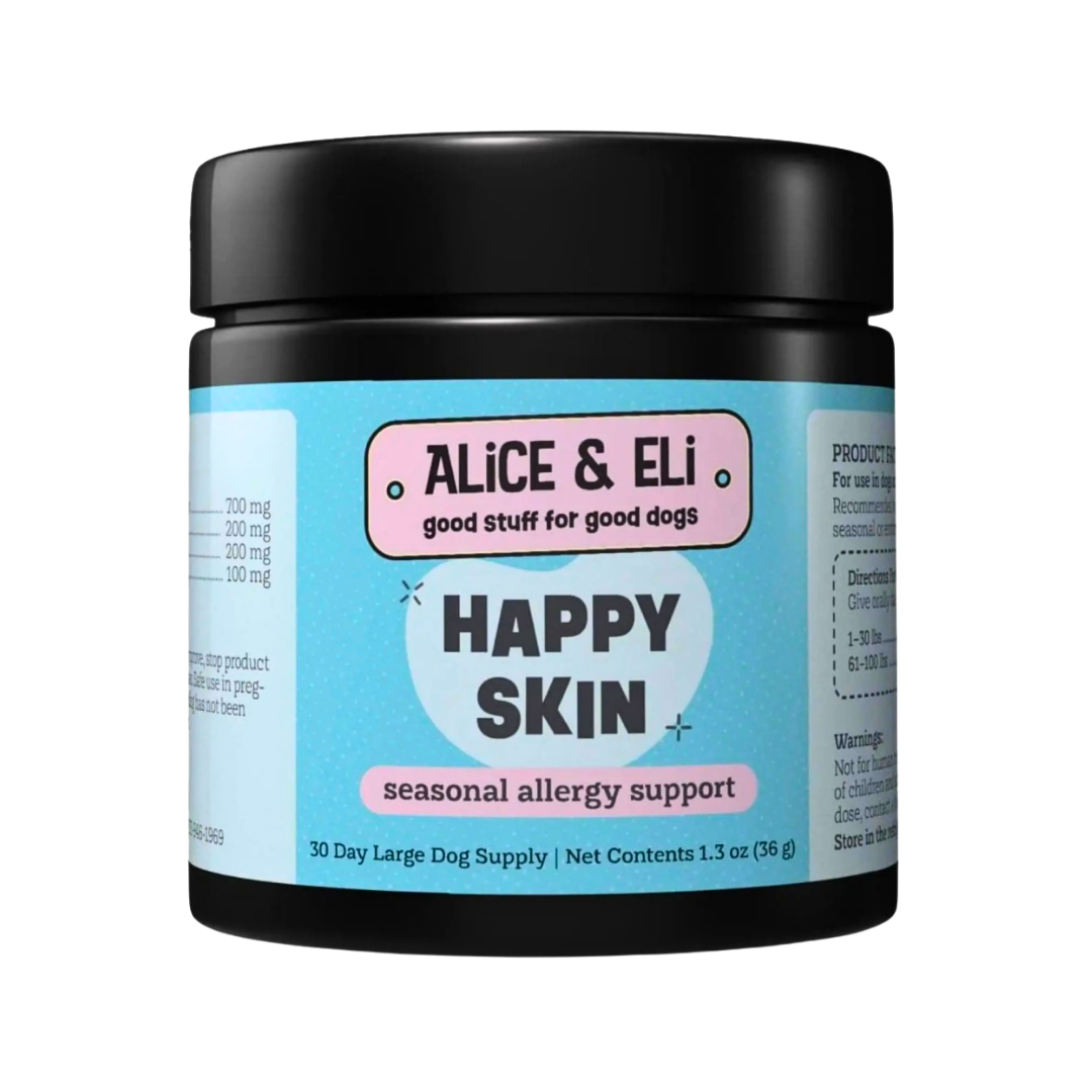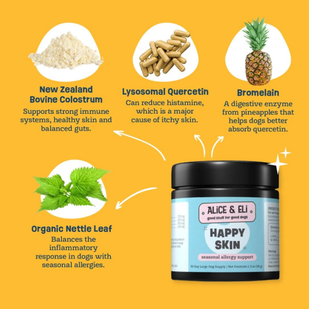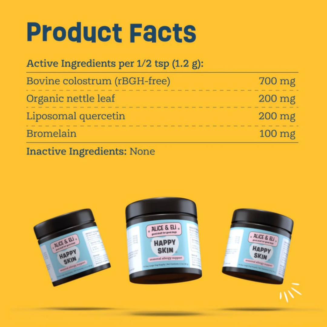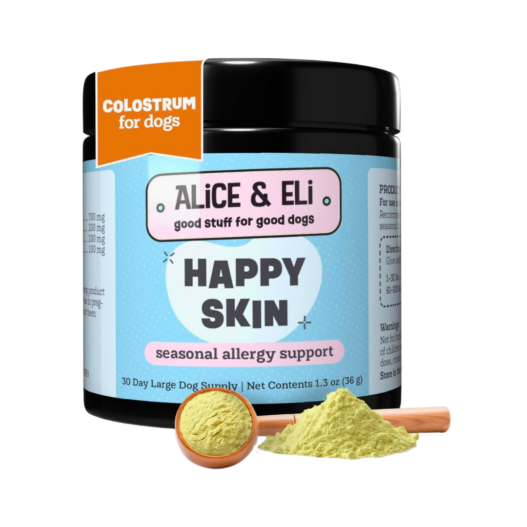 I couldn't be happier with the results of Alice & Eli Happy Skin! My dog has struggled with seasonal allergies for years, leading to uncomfortable, itchy skin that no amount of grooming could soothe. After trying numerous products with little success, we decided to give Happy Skin a shot. The difference has been night and day. Packed with natural ingredients like bovine colostrum and organic nettle leaf, this product not only eased the itching but has made my dog's coat look healthier and shinier. It's such a relief to see him comfortable and playful again, without the constant scratching. Highly recommend for any pet owner dealing with similar issues!