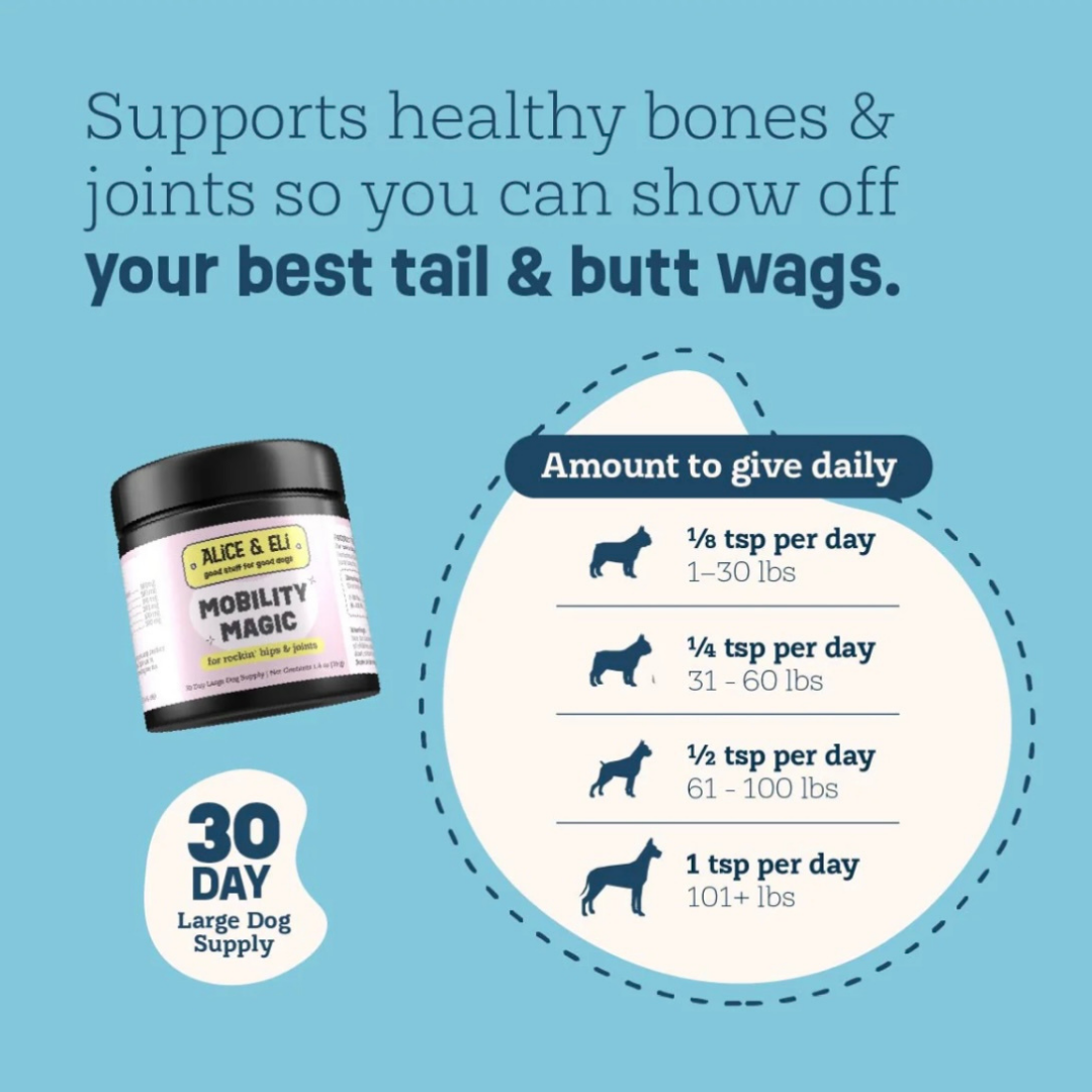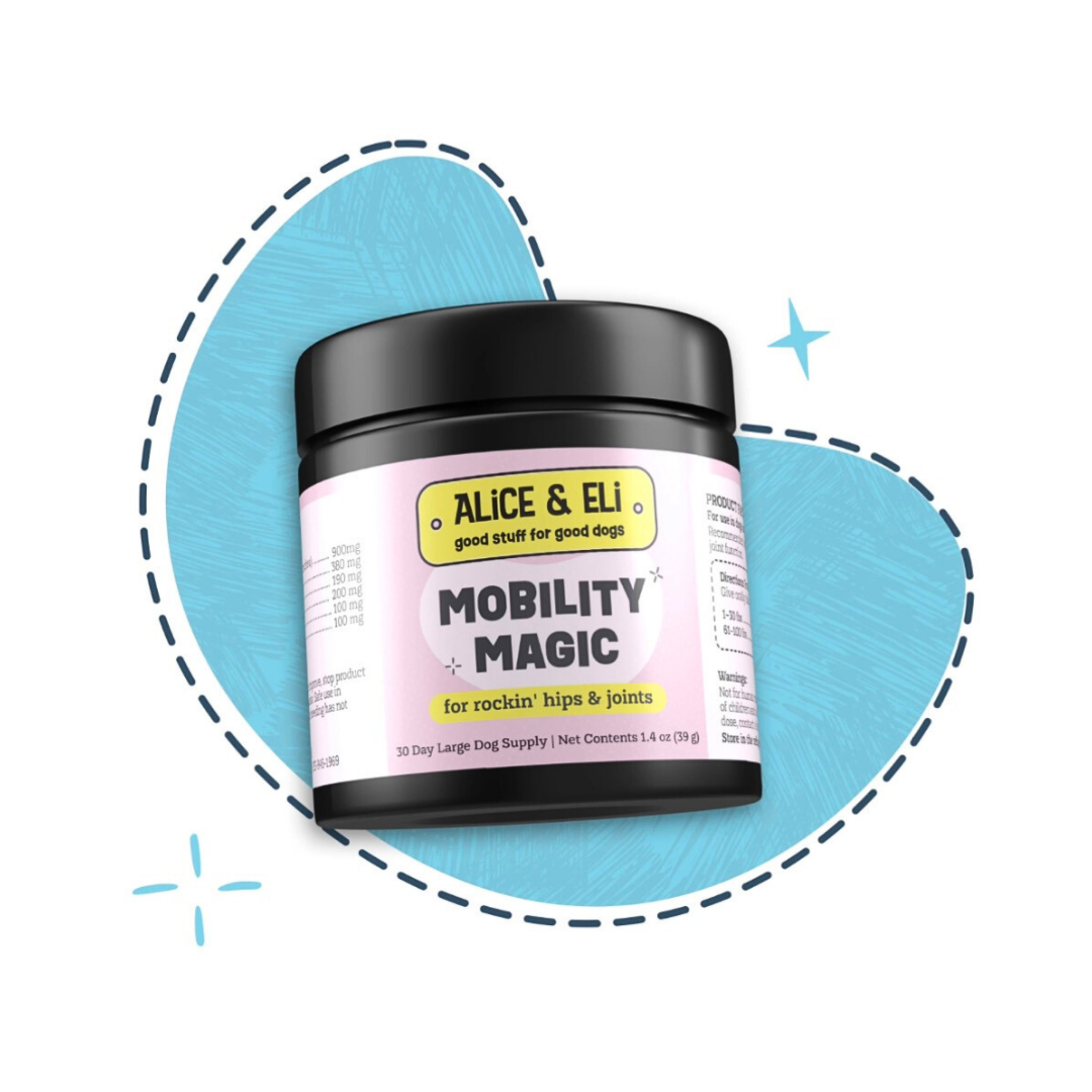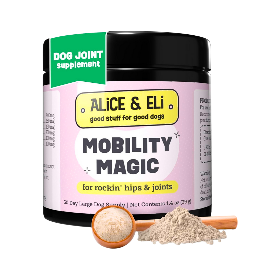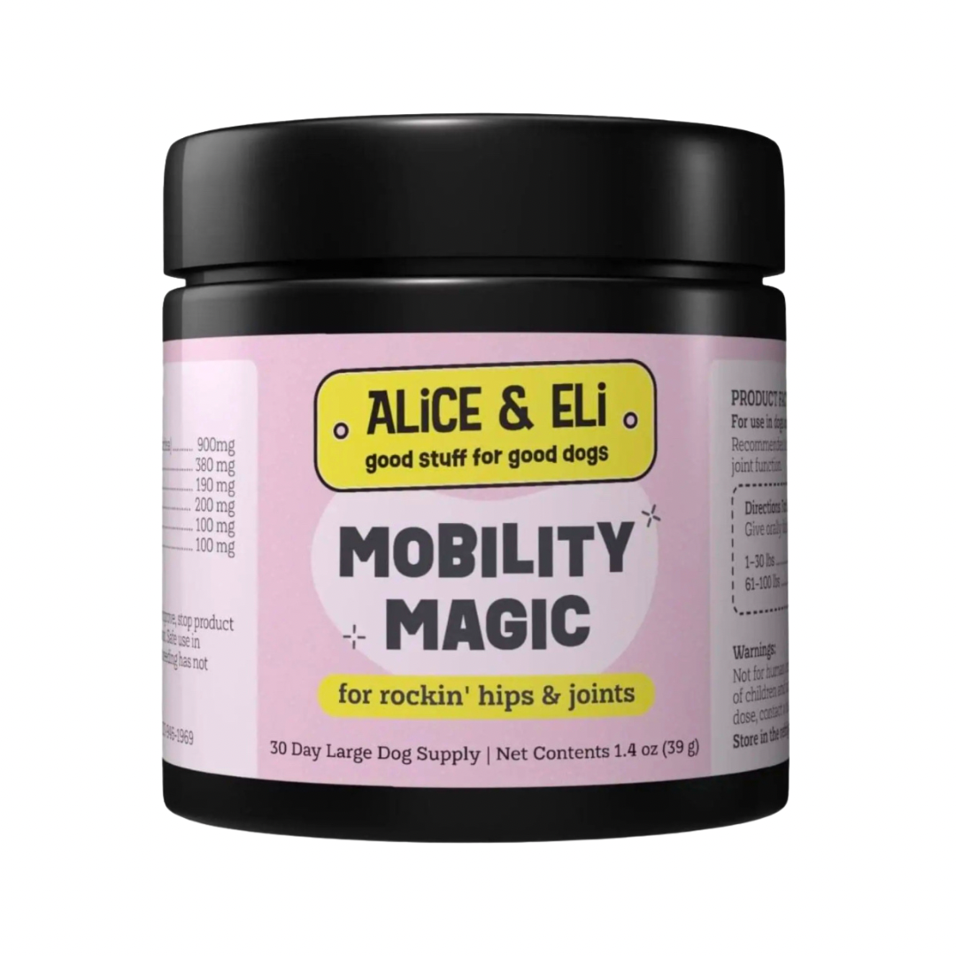 Alice & Eli Mobility Magic offers whole-body joint support that helps your dog move with greater ease and comfort. It’s a gentle, effective way to support healthy aging, active lifestyles, and better mobility at any age.