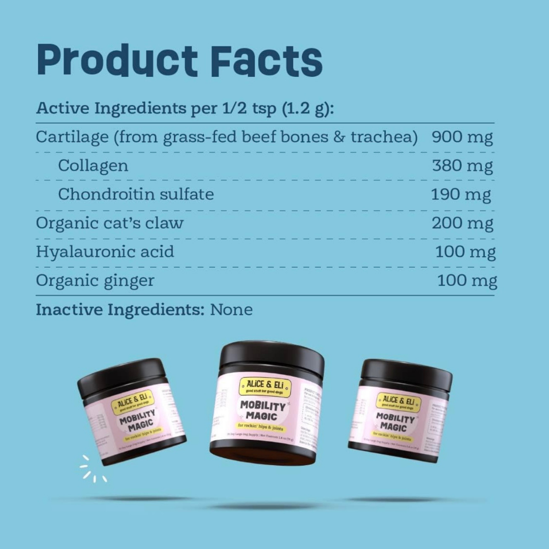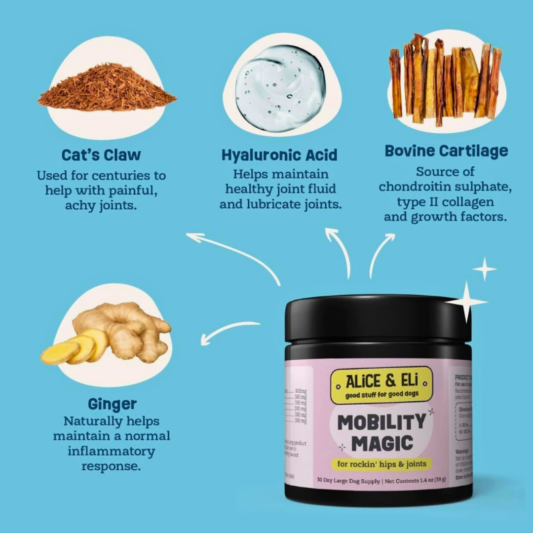 If your dog is slowing down, feeling sore after walks, or showing signs of stiffness, their joints and soft tissues may need extra support. Alice & Eli Mobility Magic is a clean, therapeutic blend of collagen, hyaluronic acid, bovine cartilage, and anti-inflammatory herbs that work together to support joint comfort, flexibility, and healthy movement. It helps ease discomfort while nourishing the tissues that keep your dog active and mobile.
