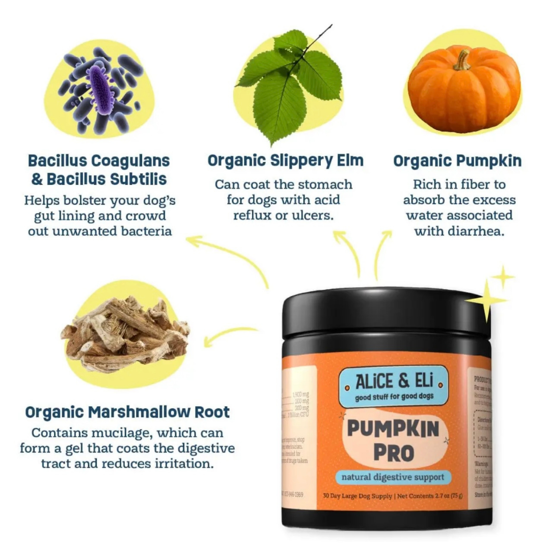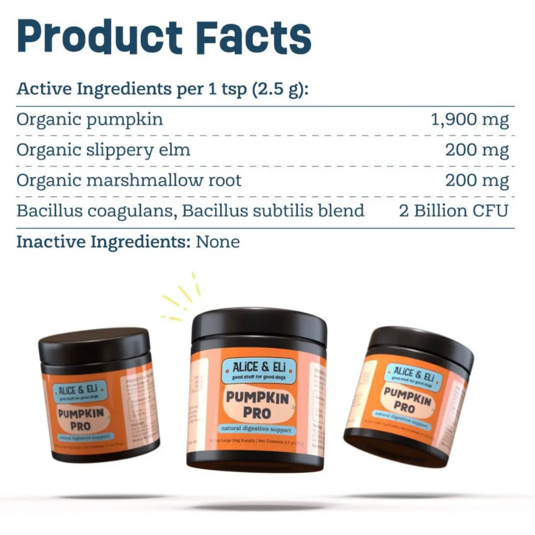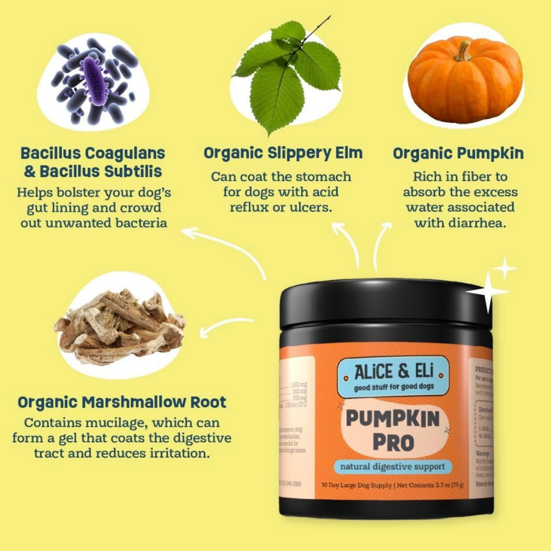 I recently purchased the Alice & Eli Pumpkin Pro for my dog, who has been struggling with digestive issues for a while. I'm absolutely thrilled with the results! This product is a game-changer. It's made with organic pumpkin, which I know is great for digestion, and it also includes beneficial herbs and probiotics. Since starting my dog on this, I've noticed a significant improvement in her digestive health. She seems more comfortable, and her bowel movements are more regular and solid. The addition of slippery elm and marshmallow root seems to soothe her gut effectively, and I'm really impressed with the high probiotic content. It's easy to use, and my dog actually enjoys the taste. Having this product on hand has given me peace of mind, knowing I can help my dog feel better immediately if she has any digestive discomfort. Highly recommend it to any pet owner looking for a natural and effective solution to support their dog's digestive health!