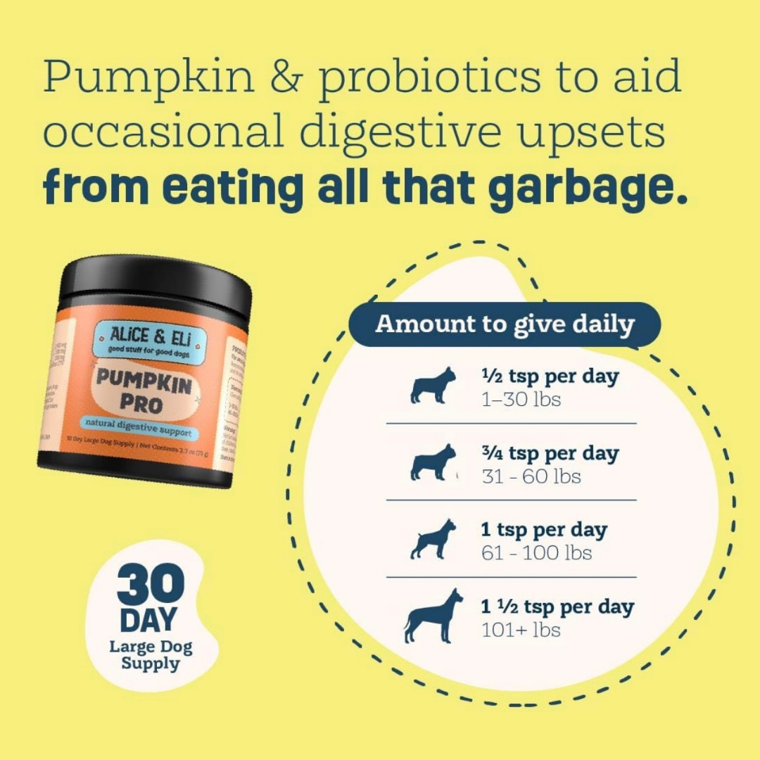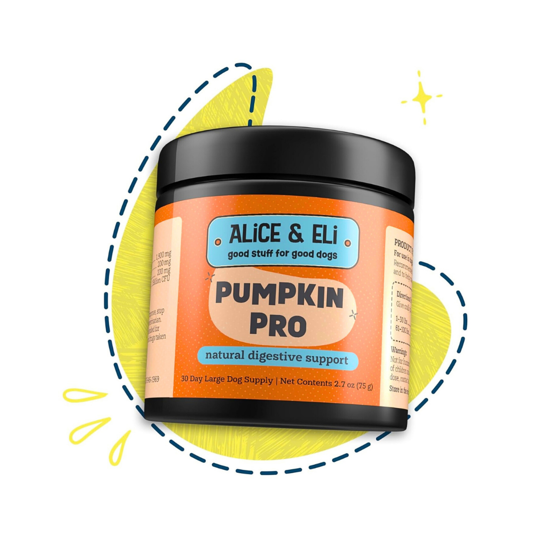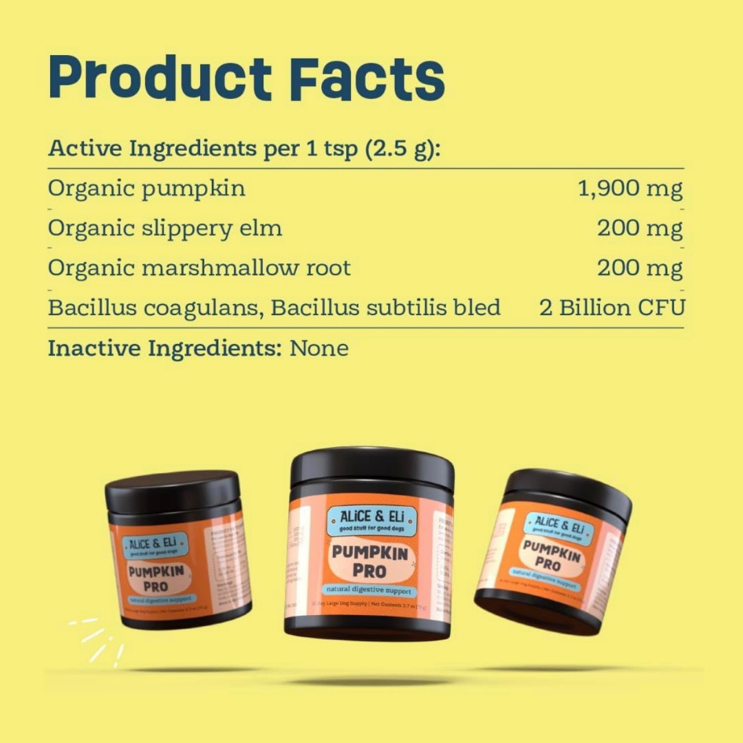 I recently purchased the Alice & Eli Pumpkin Pro for my dog, who has been struggling with digestive issues for a while. I'm absolutely thrilled with the results! This product is a game-changer. It's made with organic pumpkin, which I know is great for digestion, and it also includes beneficial herbs and probiotics. Since starting my dog on this, I've noticed a significant improvement in her digestive health. She seems more comfortable, and her bowel movements are more regular and solid. The addition of slippery elm and marshmallow root seems to soothe her gut effectively, and I'm really impressed with the high probiotic content. It's easy to use, and my dog actually enjoys the taste. Having this product on hand has given me peace of mind, knowing I can help my dog feel better immediately if she has any digestive discomfort. Highly recommend it to any pet owner looking for a natural and effective solution to support their dog's digestive health!