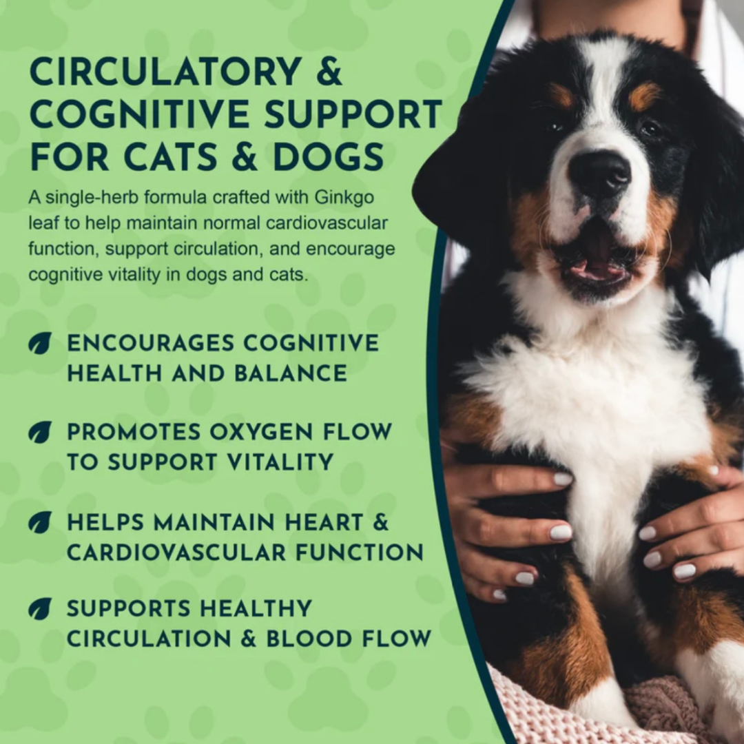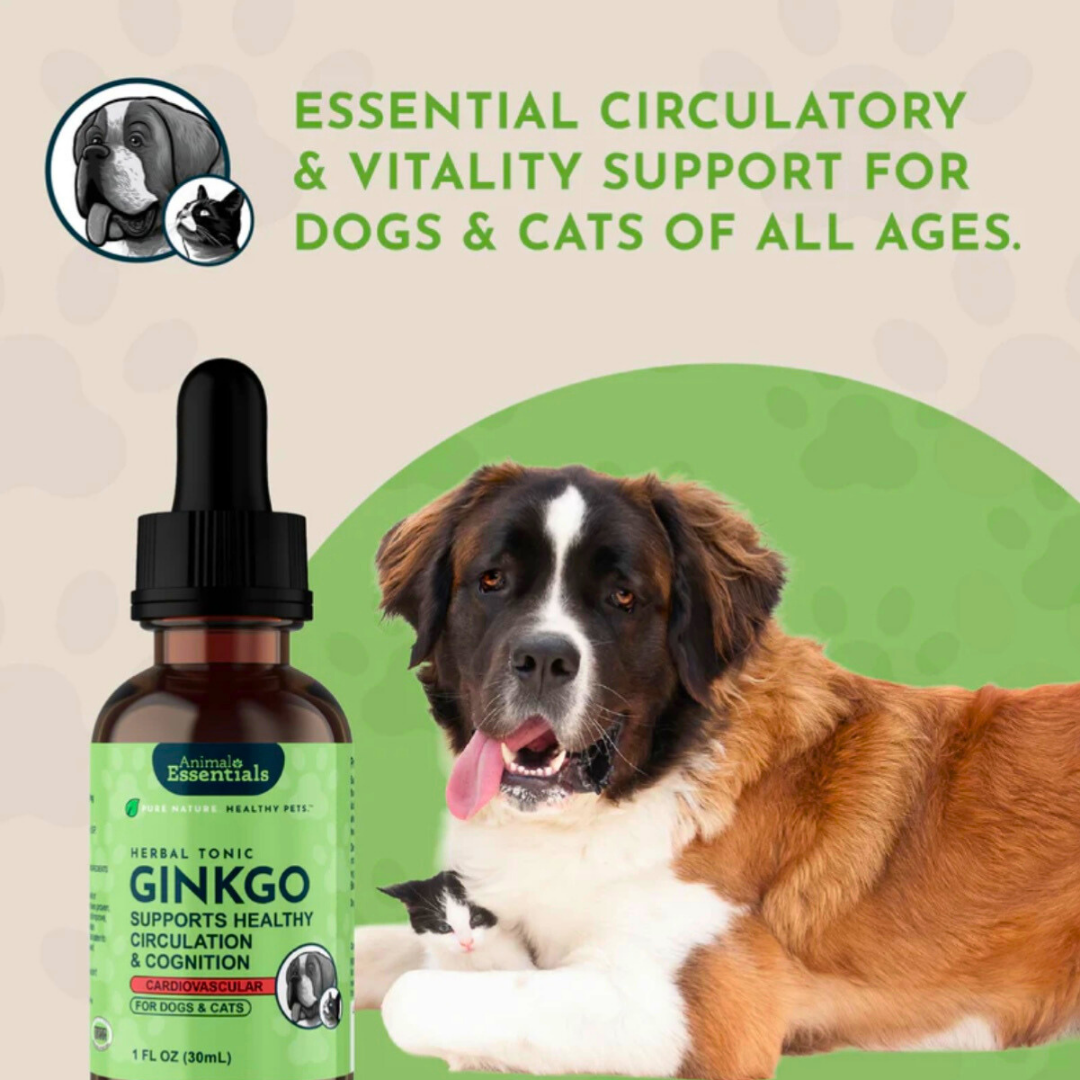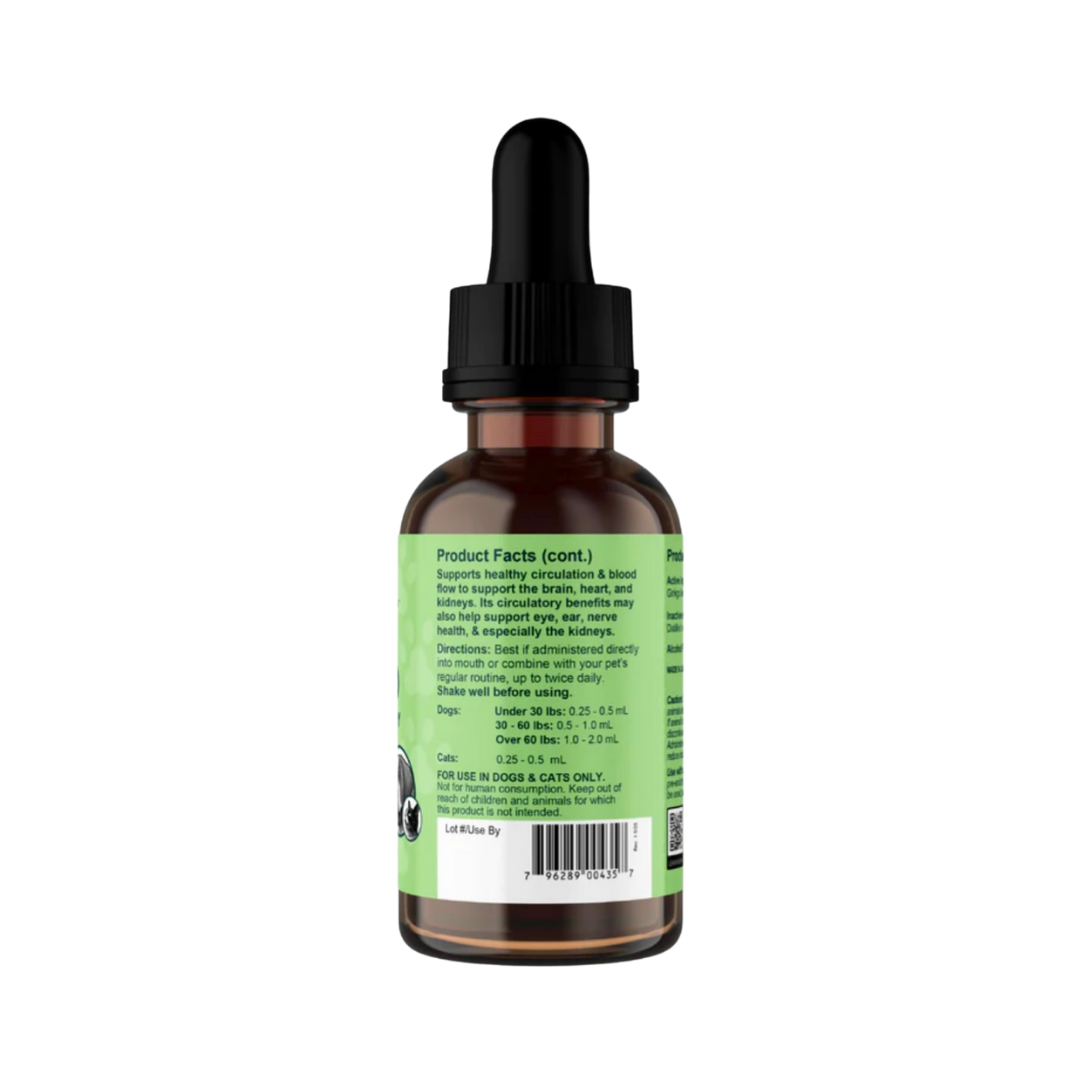 As dogs age, changes in memory, circulation, and mood can become more noticeable. Animal Essentials Ginkgoprovides a gentle, natural way to support both brain and heart health. This USDA Certified Organic, glycerin-based tincture delivers 250 mg of Ginkgo biloba leaf per serving—a well-researched botanical used to support cognitive function, circulation to the brain and limbs, and healthy cardiovascular performance. It's especially beneficial for senior dogs or those with signs of cognitive or circulatory decline.
