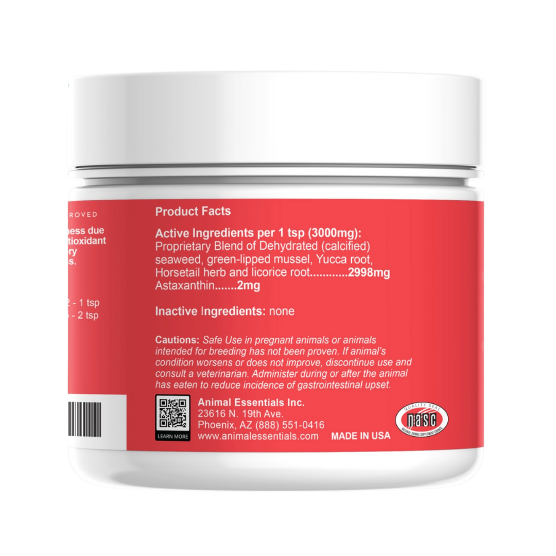 Active Ingredients per 1 tsp (3000mg): Proprietary Blend of Dehydrated (calcified) seaweed, green-lipped mussel, Yucca root, Horsetail herb and licorice root............2998mg Astaxanthin.......2mg
