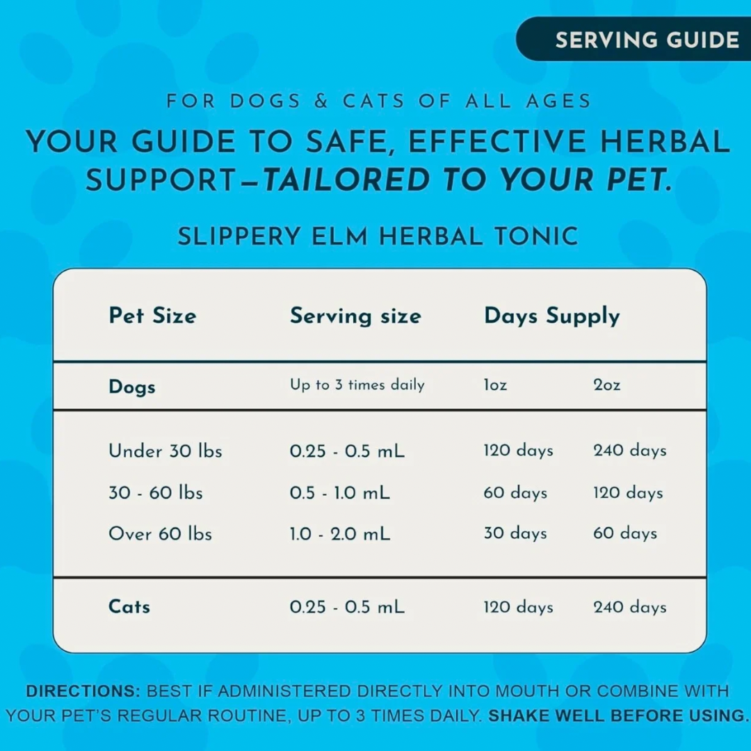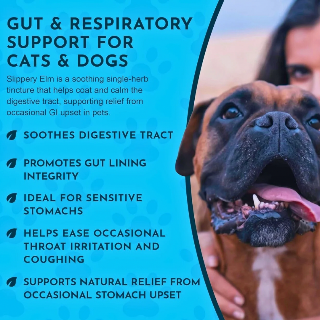 Slippery Elm has been an excellent choice for my dog's digestive health. This simple yet effective tincture formulation of slippery elm bark promotes healthy digestion and aids in normal waste elimination, which has helped my dog feel more comfortable and less stressed. It's also a great support for her respiratory health. The alcohol-free liquid formula makes it easy to administer. I've definitely noticed a positive change in her gut health.