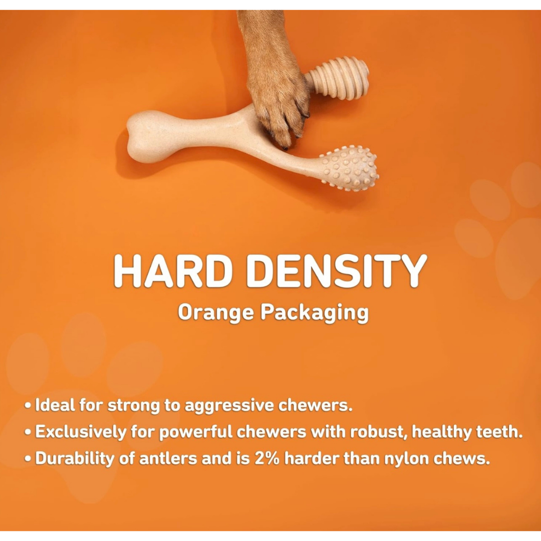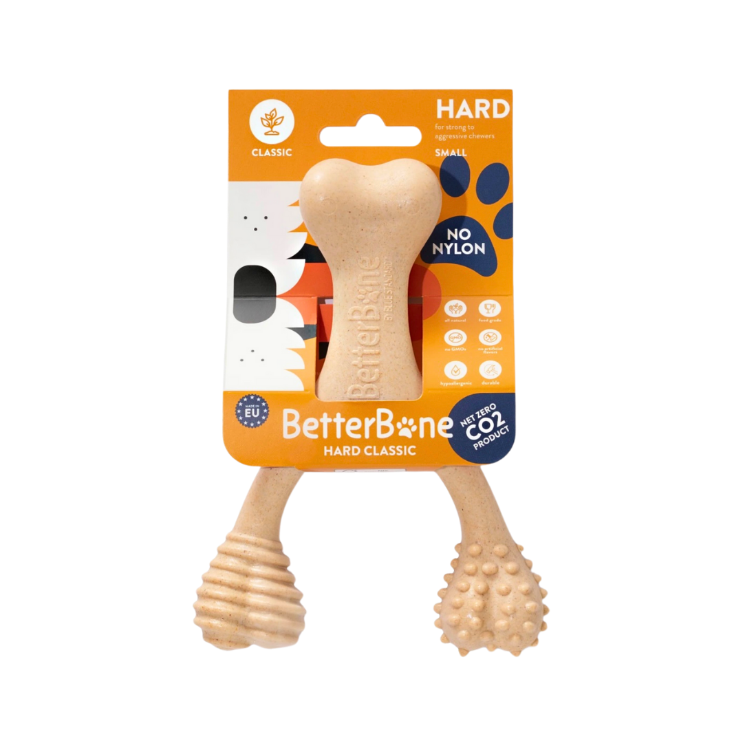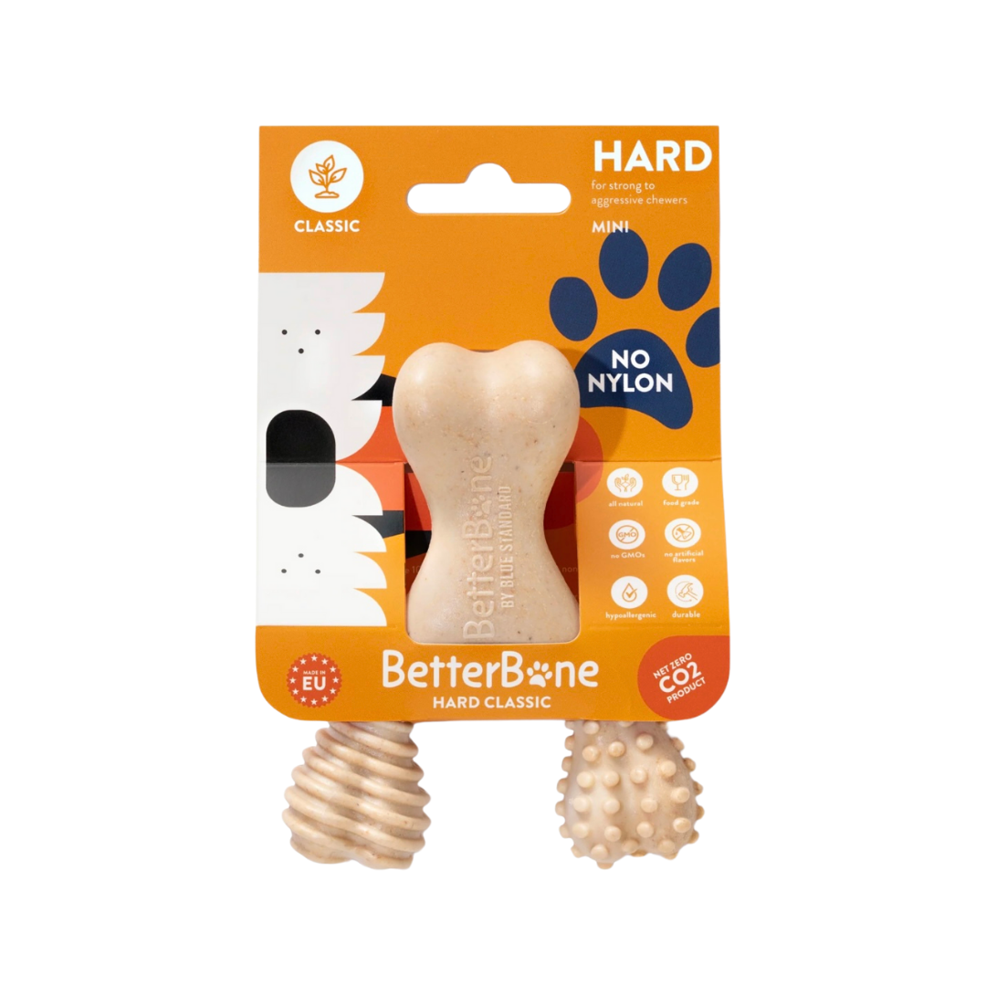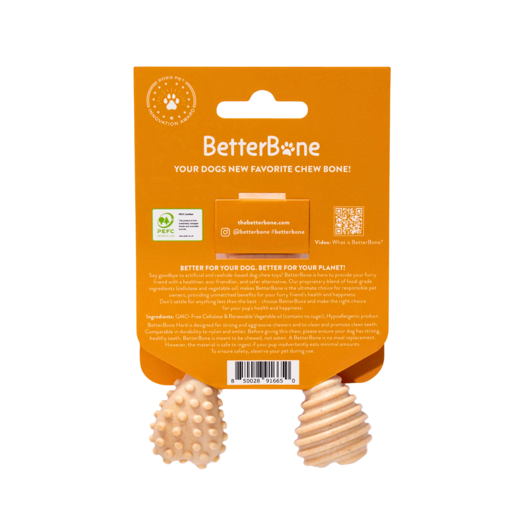 Looking for a long-lasting, eco-friendly dental chew designed for the toughest chewers? BetterBone HARD is the perfect chew toy for the strong and aggressive chewer in your life - Perfect for dogs in their prime with healthy teeth. Made with sustainability and durability in mind, this innovative chew toy not only satisfies your dog’s natural chewing instincts but also helps maintain their dental health, all while being kind to the planet.