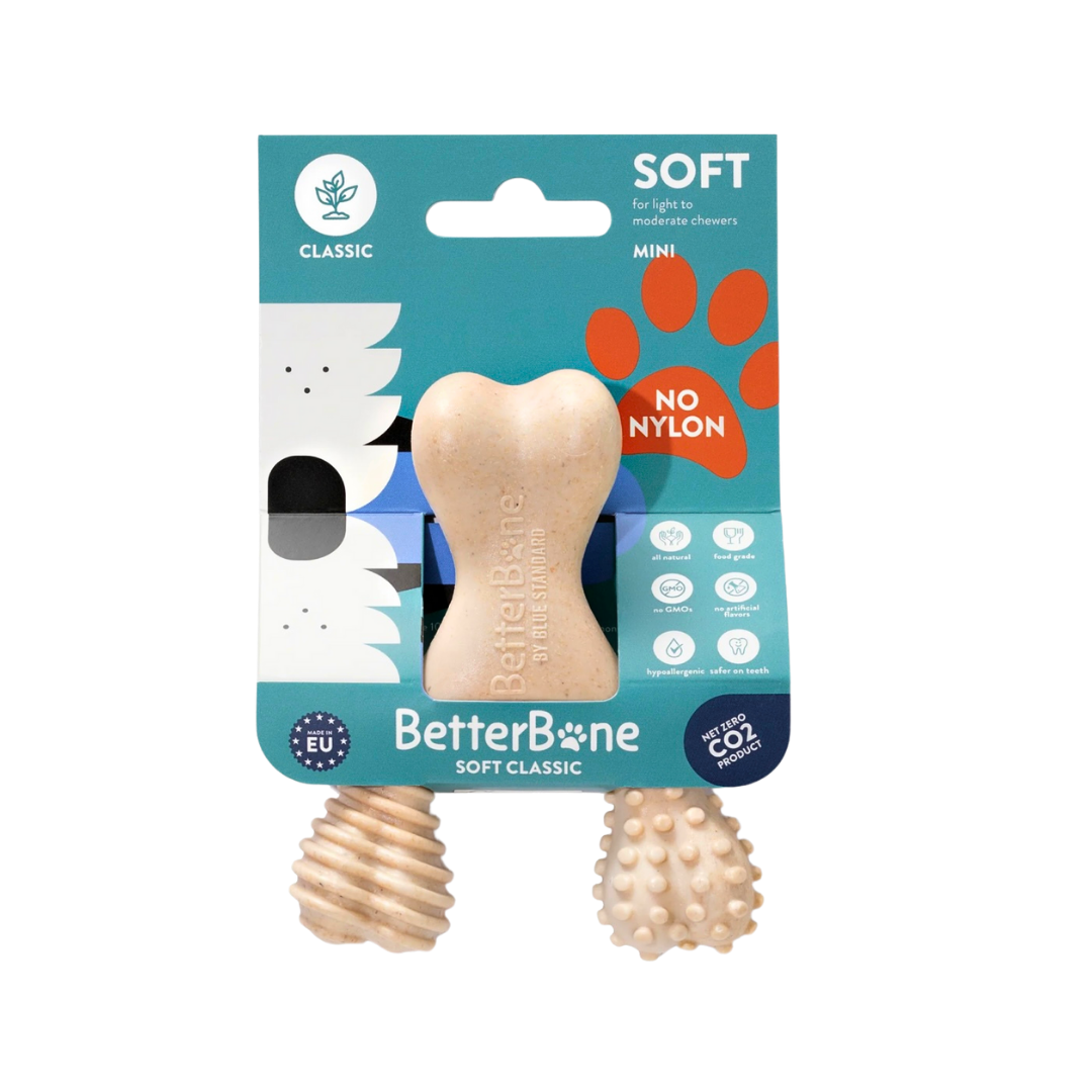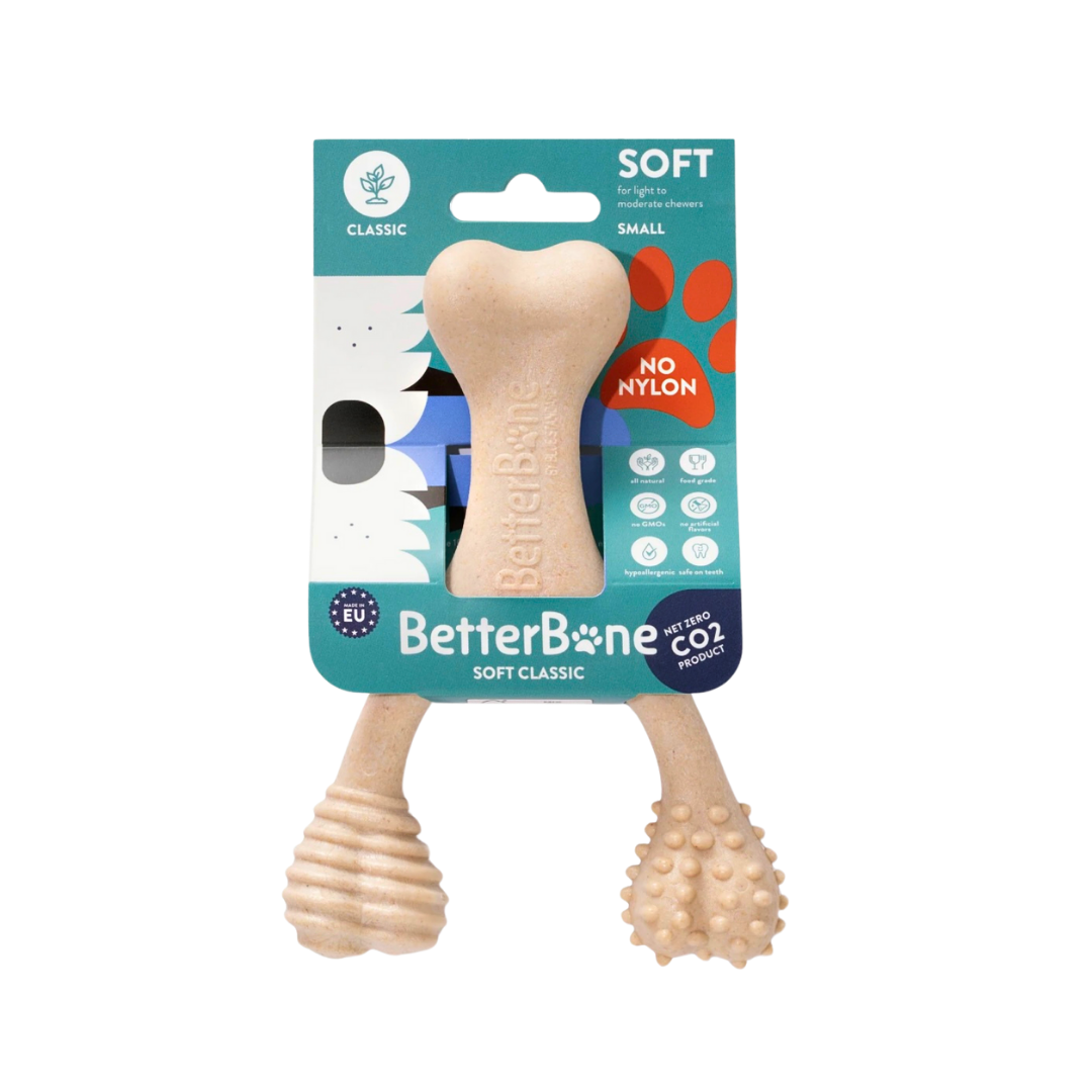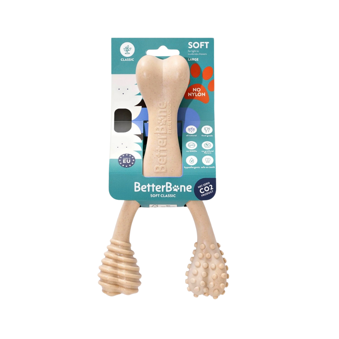 The BetterBone Soft is specially designed for teething puppies, senior dogs, and soft to light chewers who need a gentler, yet satisfying chew. Crafted with a softer material, it offers a safe and effective option that is easier on sensitive teeth and gums. Whether your pup is going through the teething phase or your senior dog needs a more delicate chew, BetterBone Soft provides all the chewing satisfaction without the risk of damaging their teeth. It’s the ideal solution for pet owners seeking a safe, gentle, and eco-friendly chew.