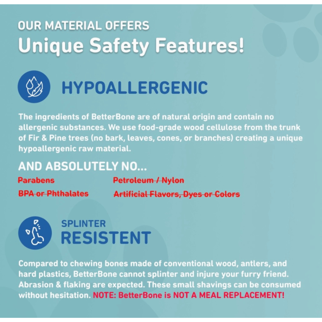 BetterBone is made of 2 simple natural ingredients - Sustainably forested wood flour and renewable sugarcane oil. The wood cellulose is the same found in parmesan cheese & yogurt. Making it both eco-friendly and biodegradable. There are no artificial dyes, flavors, or harmful additives—just simple, sustainable materials designed for maximum durability.