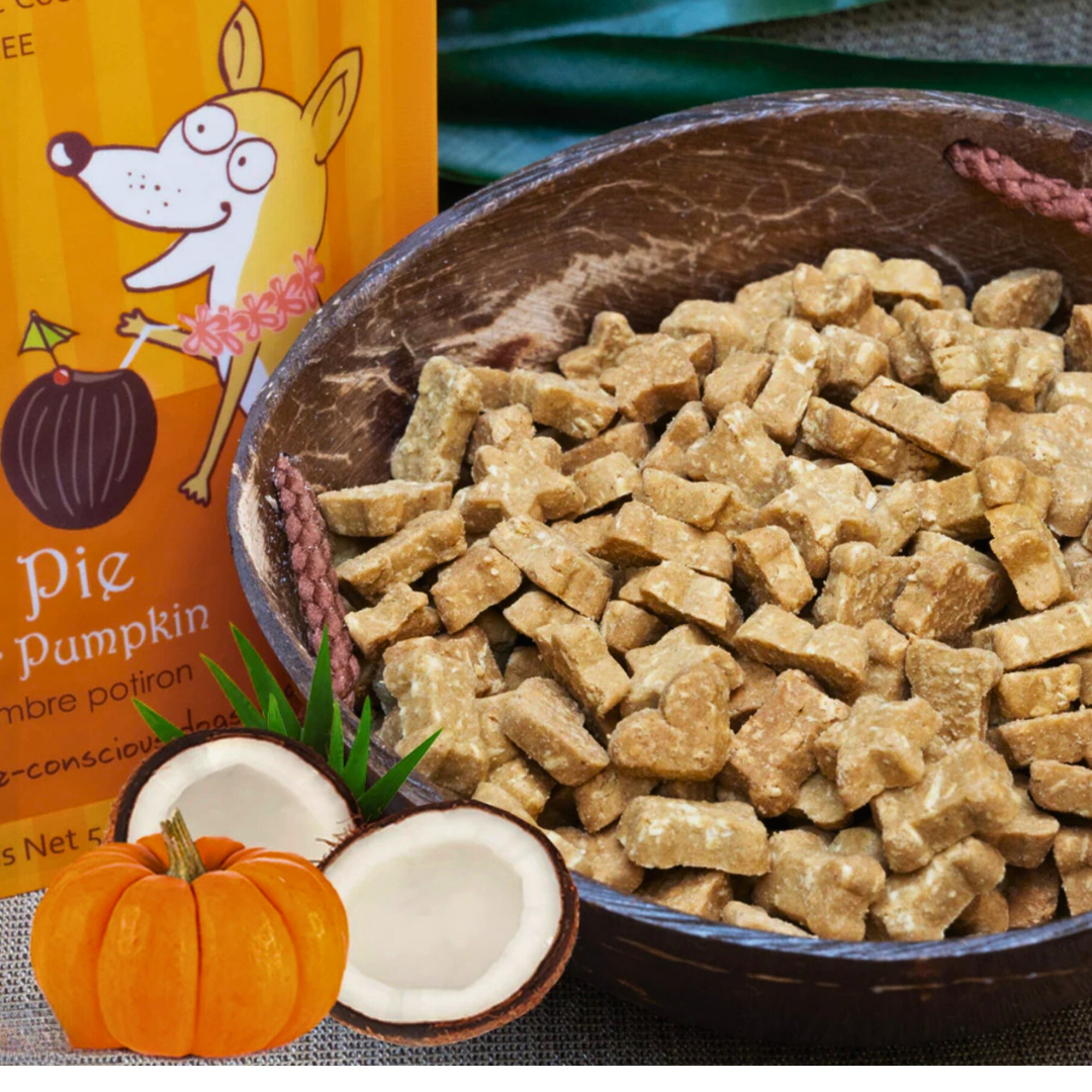 These treats combine the gut-friendly benefits of organic pumpkin and ginger with three forms of therapeutic coconut: coconut meat, coconut nectar, and coconut oil. Pumpkin is rich in prebiotic fiber that supports healthy digestion and stool quality, while ginger helps soothe nausea, gas, and occasional tummy upset. Coconut contributes lauric acid and MCTs (medium-chain triglycerides), which support a healthy gut microbiome, immune function, and skin. It’s a clean, functional treat designed to do more than just taste good.