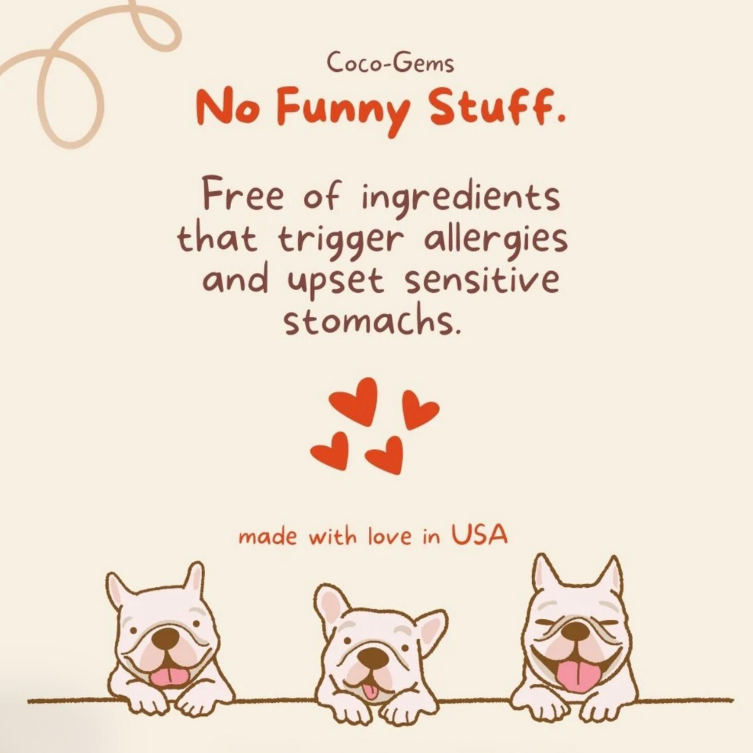 - Grain-Free and Allergy-Friendly: Coco-Gems are made with organic, gluten-free buckwheat flour, making them a suitable option for dogs with food sensitivities or allergies. They are free from grains, gluten, and artificial ingredients, ensuring a clean, healthy treat.