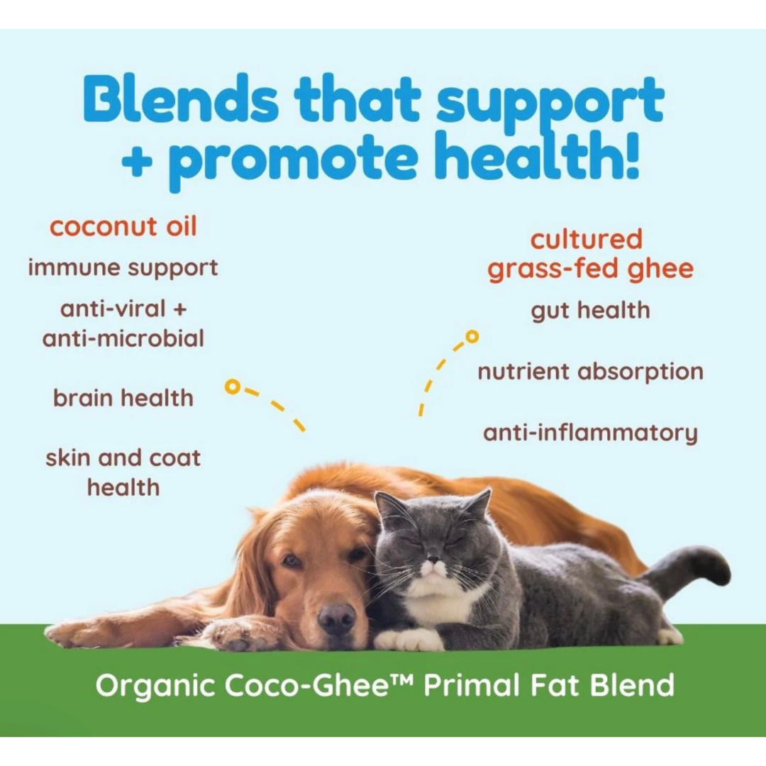 Healthy fats are foundational for optimal dog health—but not all fats are created equal. Coco-Ghee delivers bioavailable, anti-inflammatory fats that nourish the brain, soothe the gut, and support healthy skin and metabolism. Organic Virgin coconut oil is rich in lauric acid and MCTs, which fuel the brain and have antimicrobial properties. Cultured ghee adds butyrate, a short-chain fatty acid that feeds the cells lining the gut and plays a key role in immune balance and inflammation regulation.