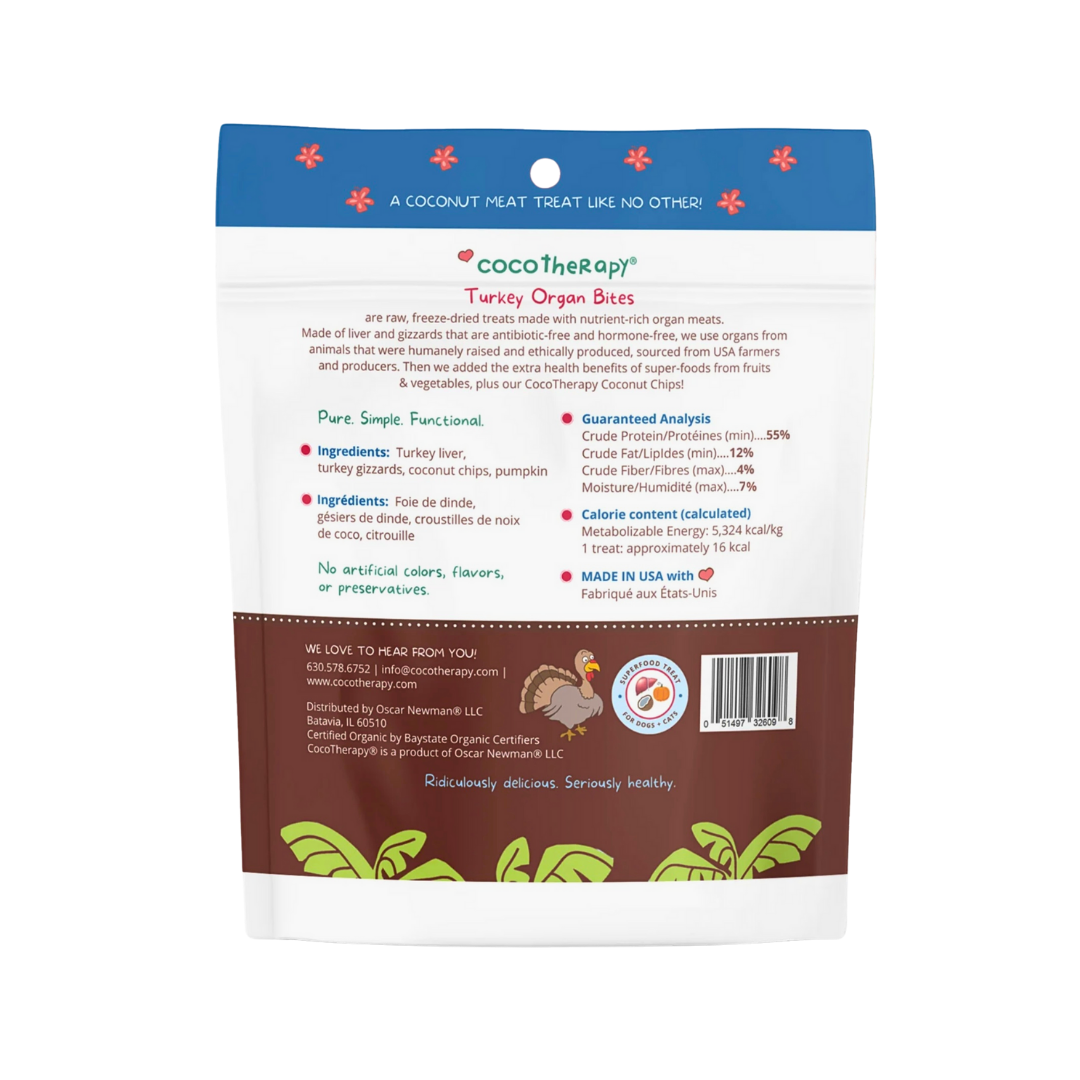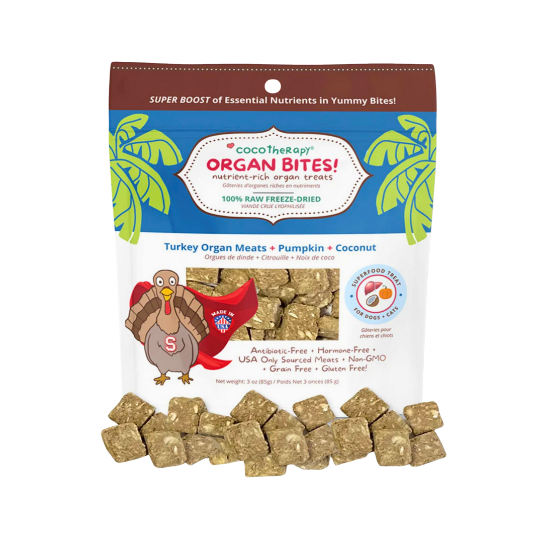 CocoTherapy Organ Treats – Turkey & Pumpkin give your dog the nutrient boost of organ meats with the digestive support of real pumpkin—making every bite both functional and flavorful.