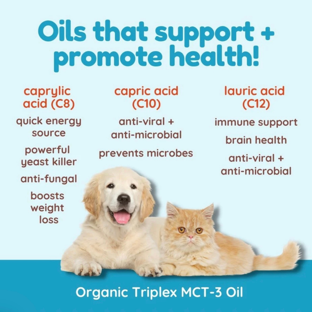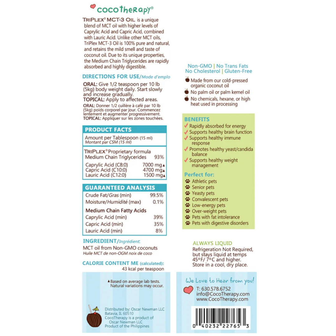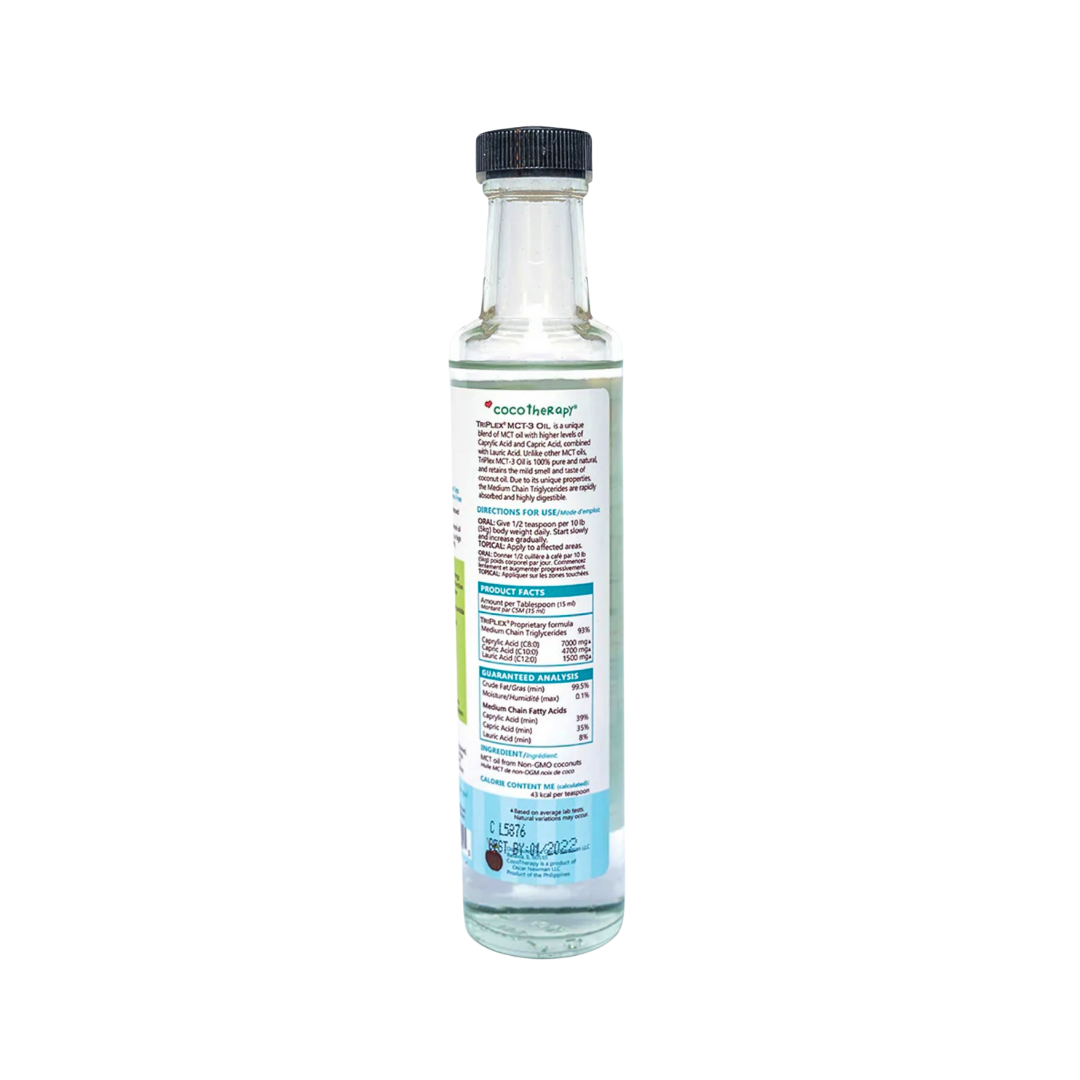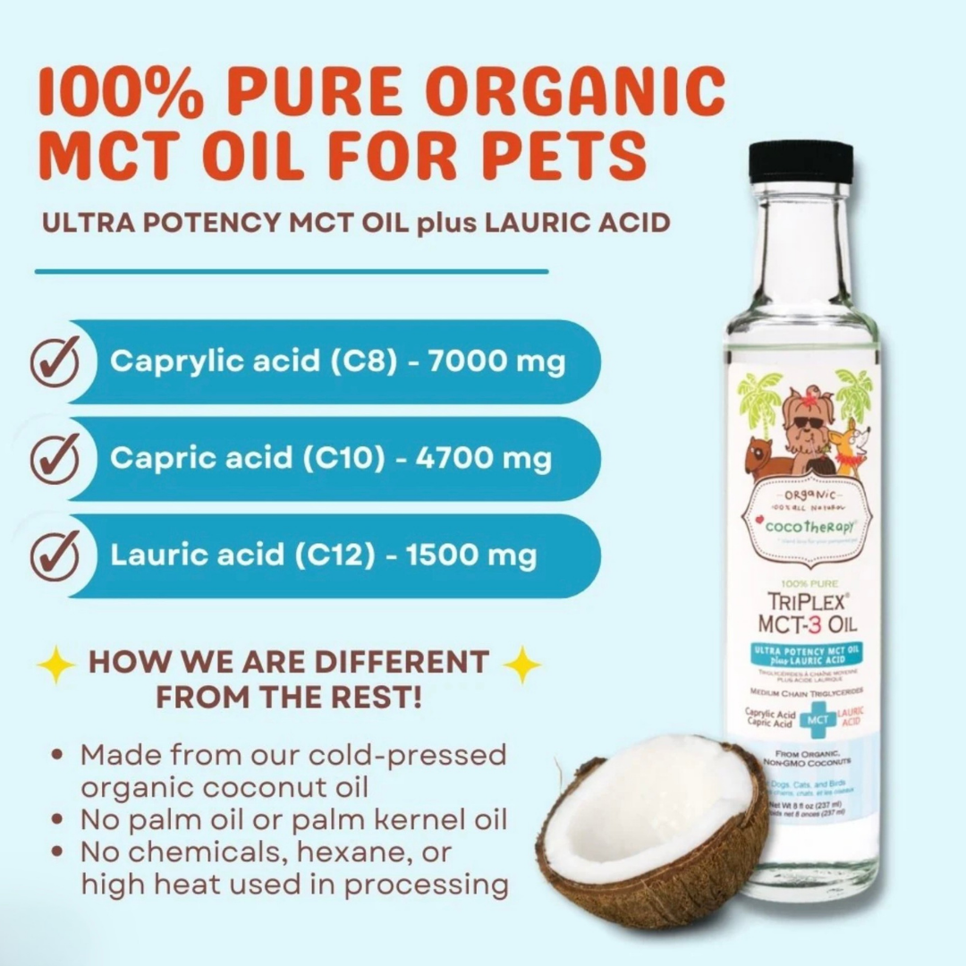 CocoTherapy TriPlex MCT-3 is a highly concentrated, veterinarian-recommended medium-chain triglyceride (MCT) oil made exclusively from USDA-certified organic, non-GMO coconut oil. Unlike generic MCT blends that may include palm oil or lower-quality sources, this formula delivers a clinical ratio of the three most researched MCTs—Caprylic (C8), Capric (C10), and Lauric (C12) acids—for dogs needing neurological, metabolic, or immune support.