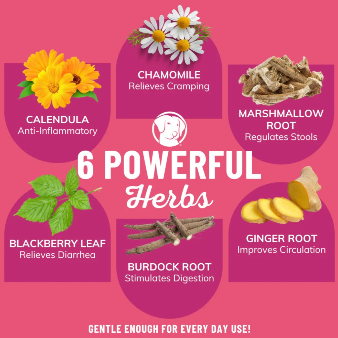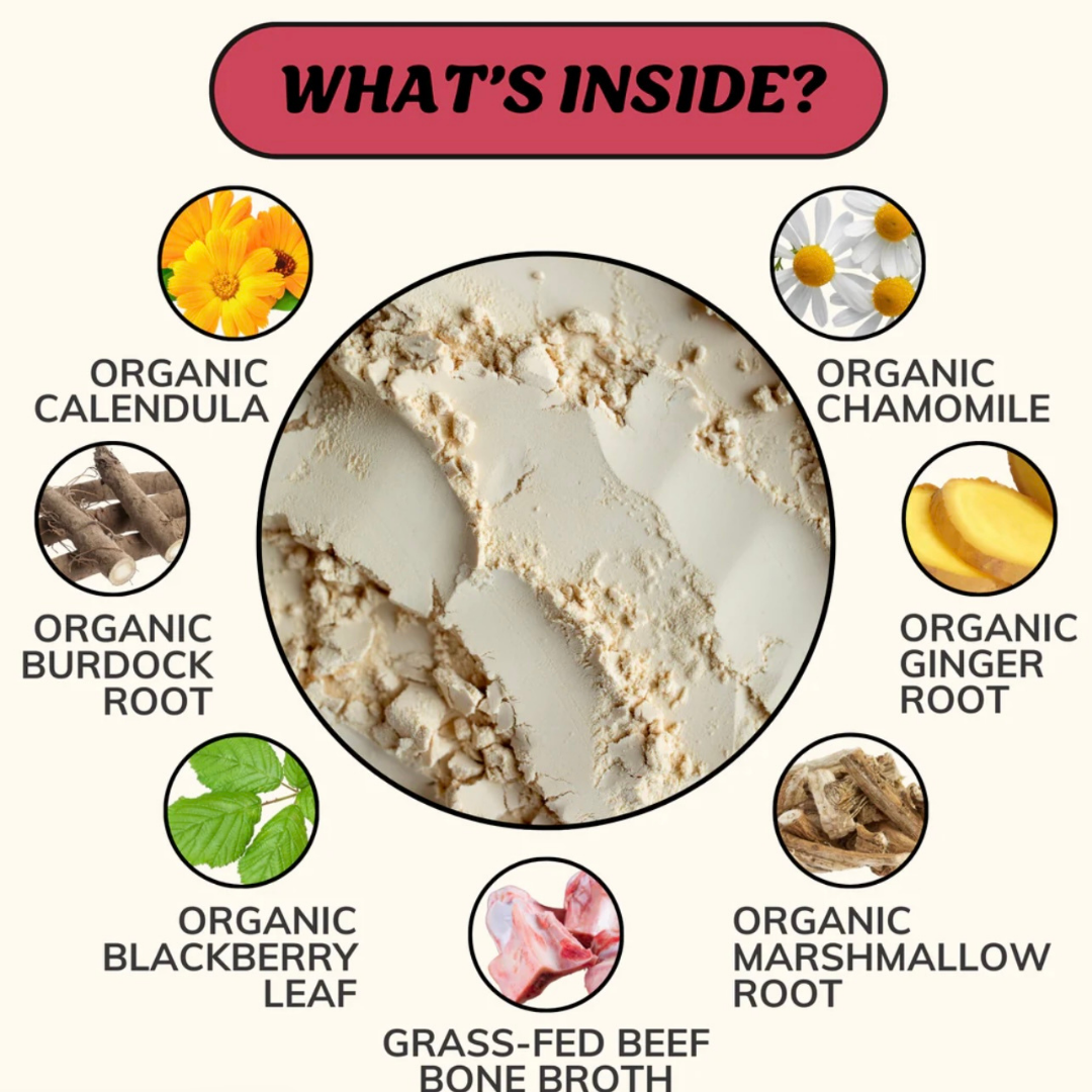 Ingredients: Grass-Fed Dehydrated Beef Bone Broth, Calendula*, Chamomile*, Marshmallow Root*, Blackberry Leaf*, Burdock Root*, Ginger Root* (*Organic)