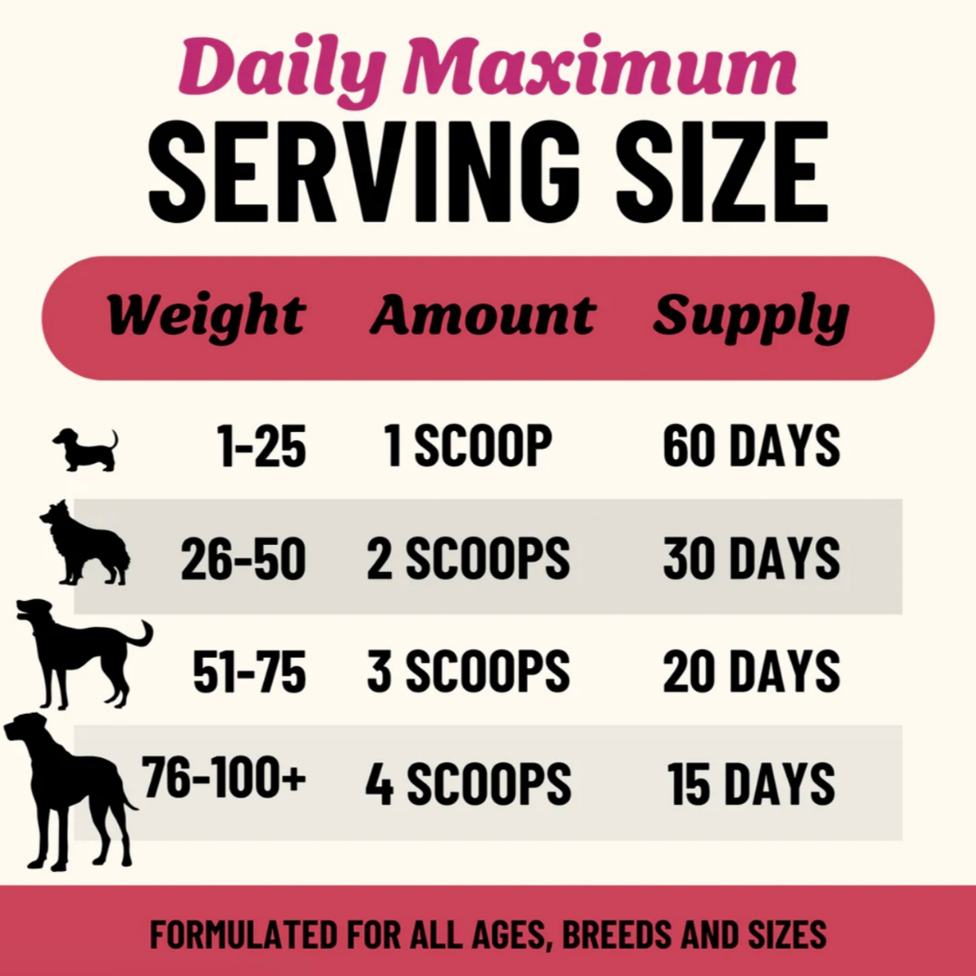 One can of dehydrated bone broth powder contains 60 servings for a 25 lb. dog, 30 servings for a 50 lb. dog, and 15 servings for a 100 lb. dog.