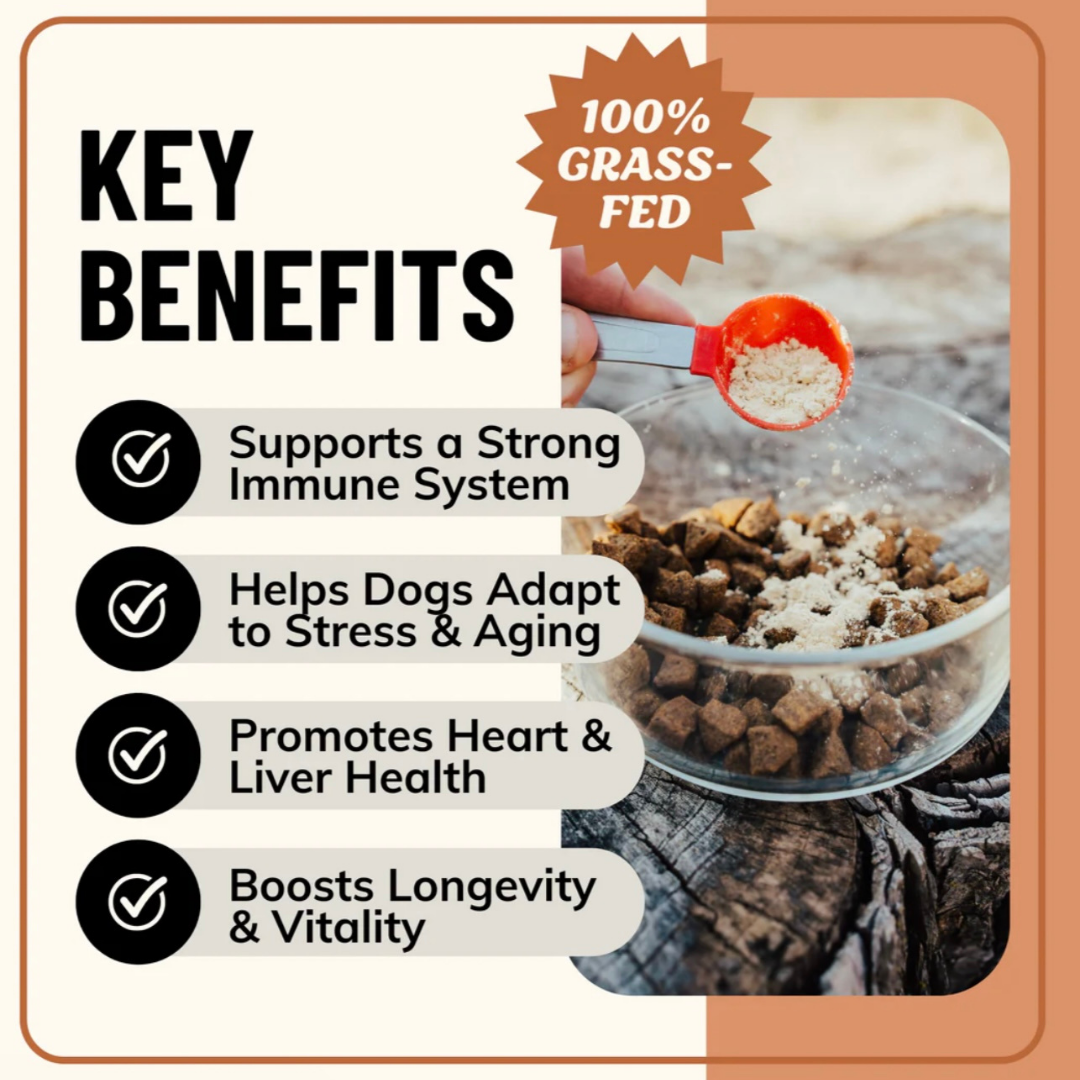 Healthy aging starts with strong foundations—and this functional bone broth is designed to support your dog’s whole-body wellness from the inside out. Fido’s Longevity Formula combines grass-fed beef bone broth with a trio of organic, hot-water extracted medicinal mushrooms to support immunity, cellular repair, and healthy inflammation as your dog ages.