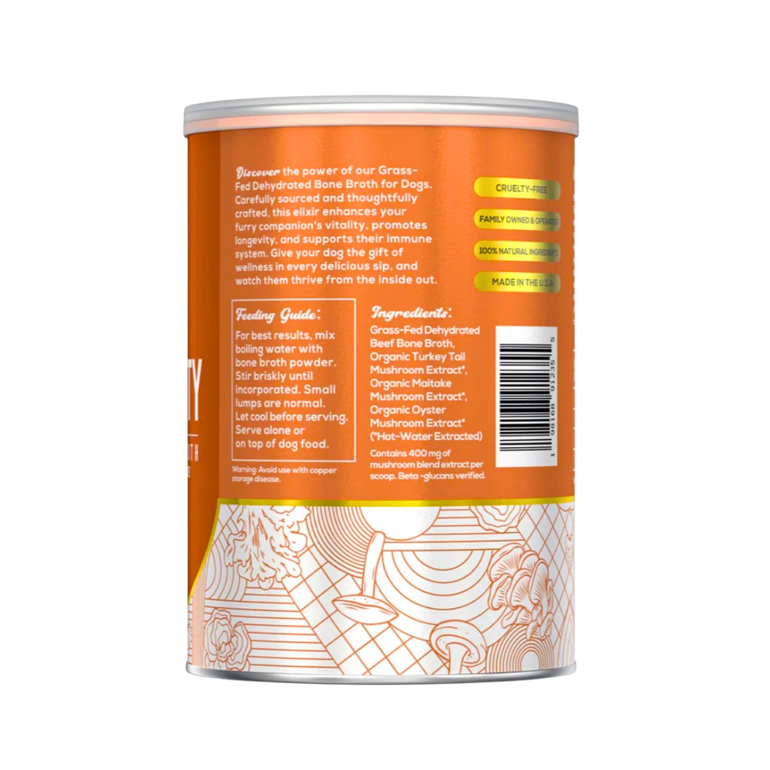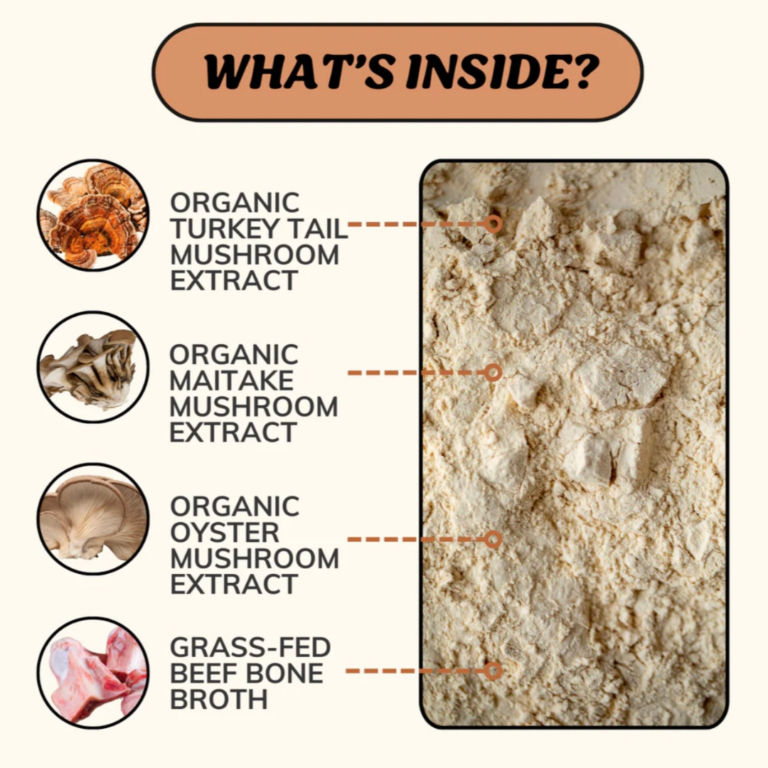 Ingredients: Grass-Fed Dehydrated Beef Bone Broth, Turkey Tail Mushroom Extract*, Maitake Mushroom Extract*, Oyster Mushroom Extract*(*Organic & Hot-Water Extracted)