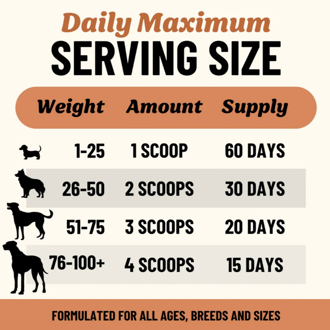 One can of dehydrated bone broth powder contains 60 servings for a 25 lb. dog, 30 servings for a 50 lb. dog, and 15 servings for a 100 lb. dog.