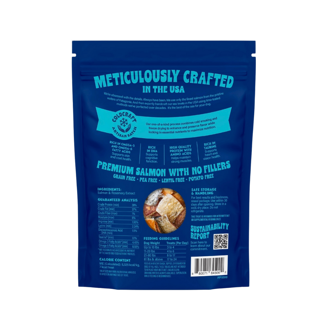 Because they’re freeze-dried, these Salmon Skin Bites retain their full nutrient profile without heat damage, offering your dog a bioavailable source of essential fats and proteins. Their crunchy texture also adds dental benefits by helping reduce plaque buildup while your pup chews. Unlike conventional treats filled with starches or synthetic additives, Finfare Salmon Bites provide pure, functional nutrition straight from the sea.