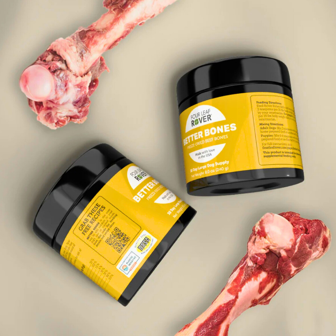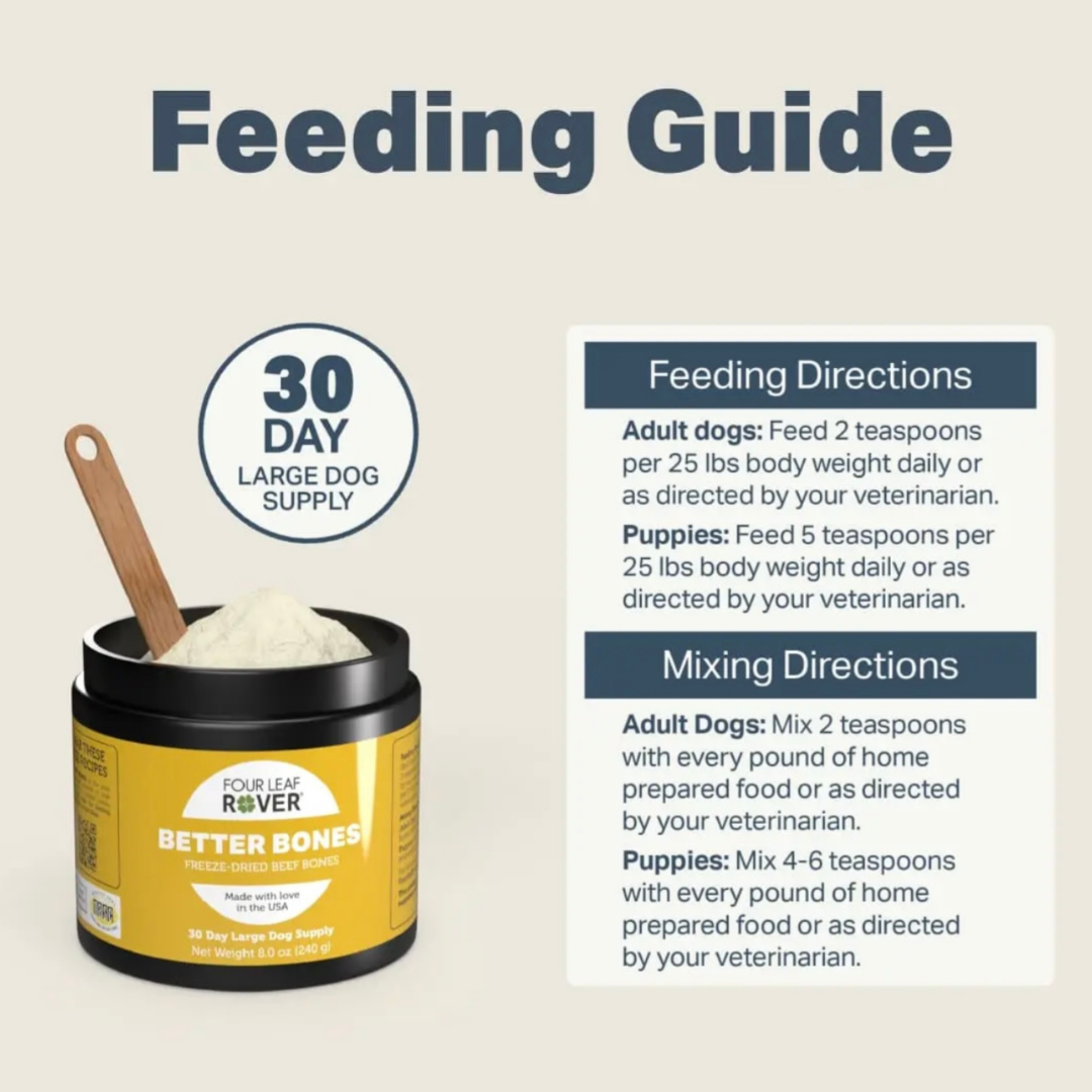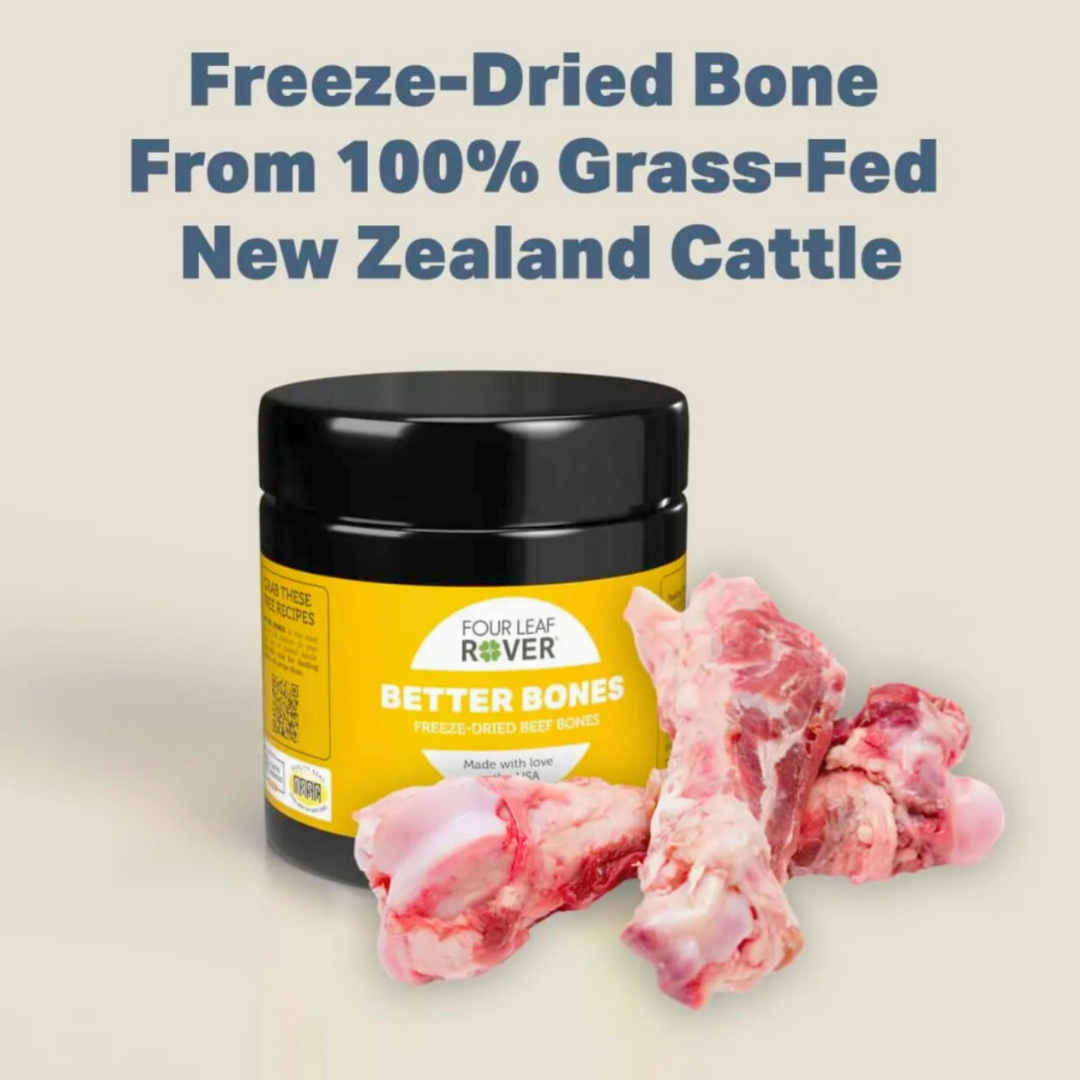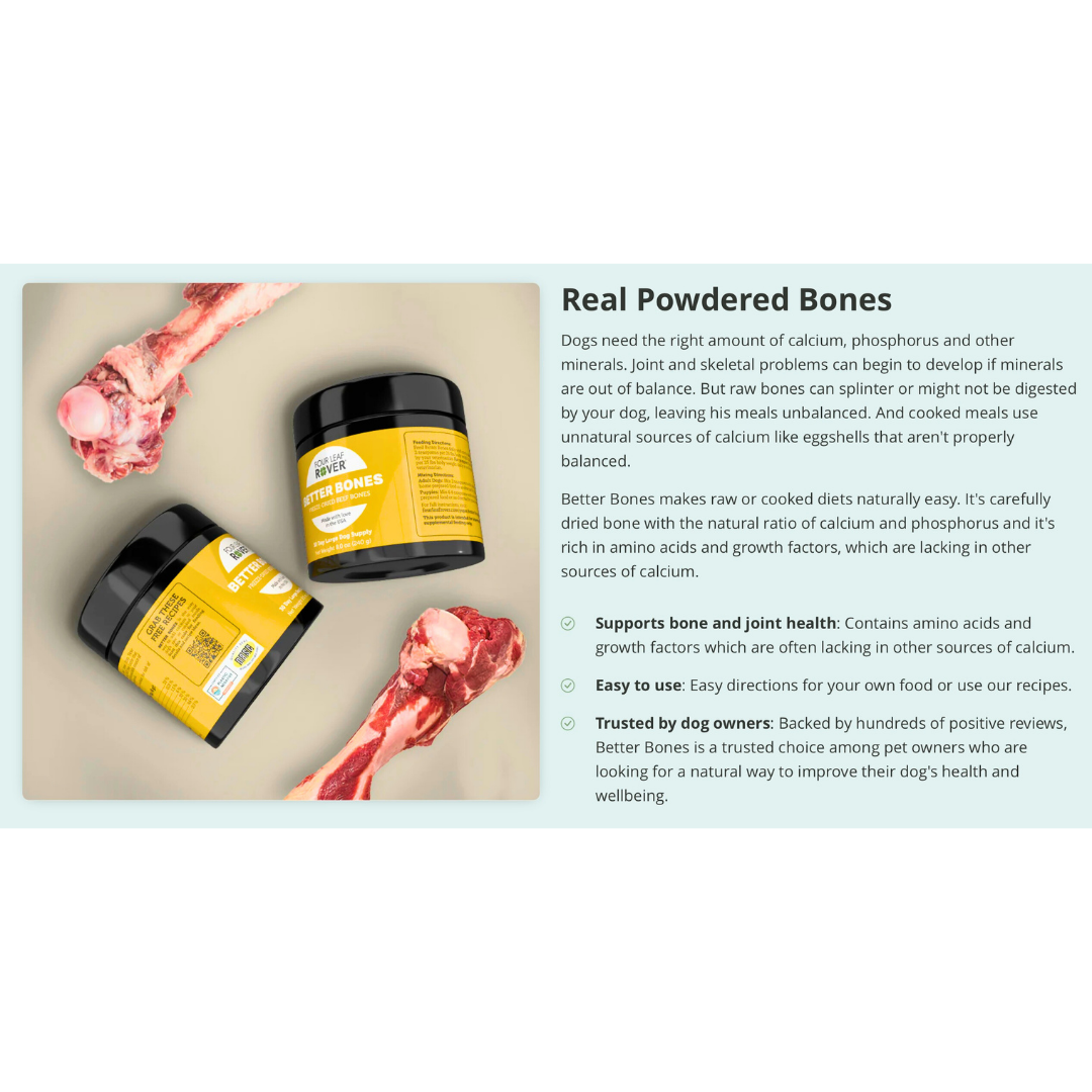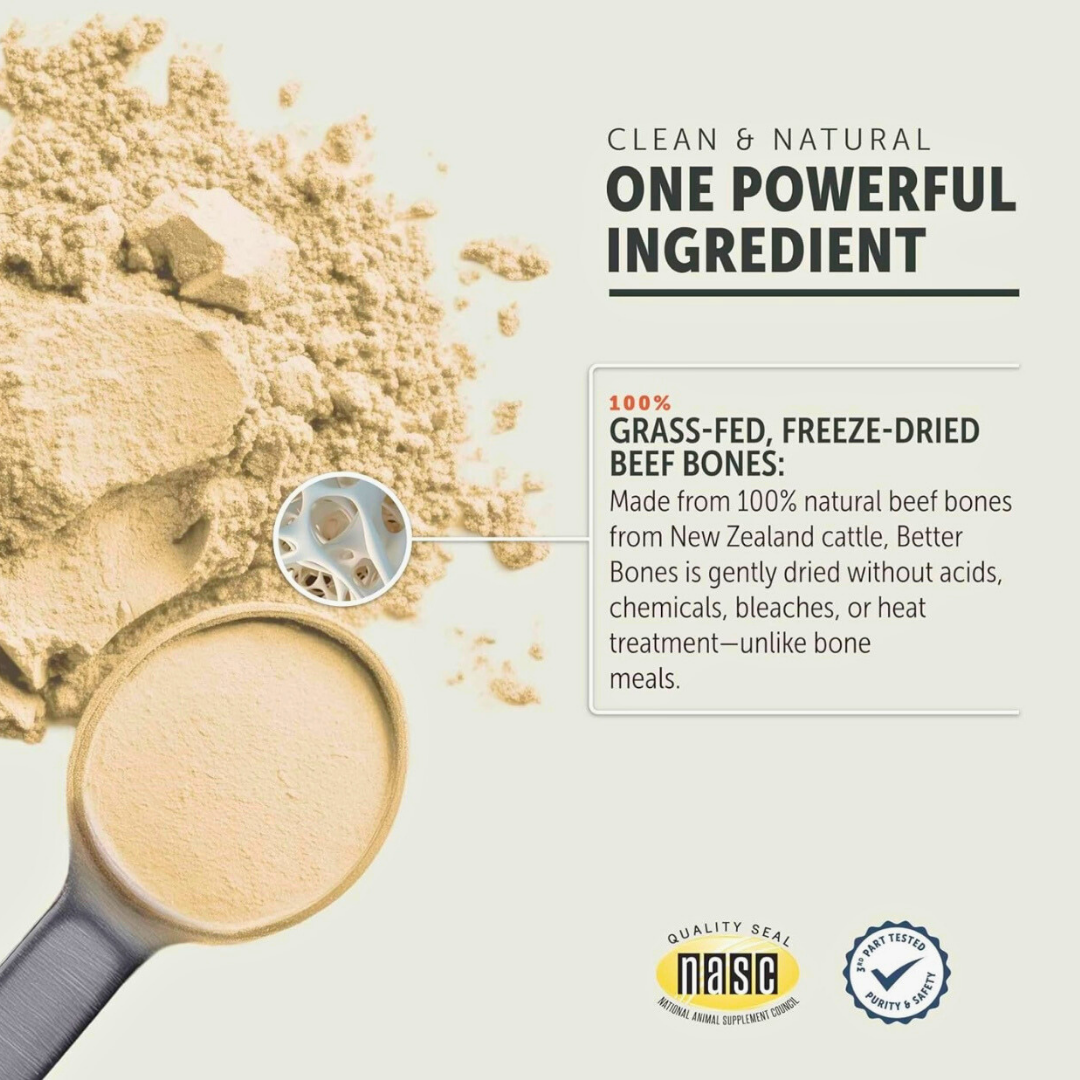 If you’re feeding a homemade or raw diet, your dog needs a safe, balanced source of calcium. Better Bones makes it simple! This gently dried bone meal is made from grass-fed, pasture-raised beef bones and provides calcium, phosphorus, magnesium, and trace minerals in their natural, food-based form. It’s a clean, easy way to support strong bones, teeth, and joints without relying on synthetic calcium or chalky mineral powders.
