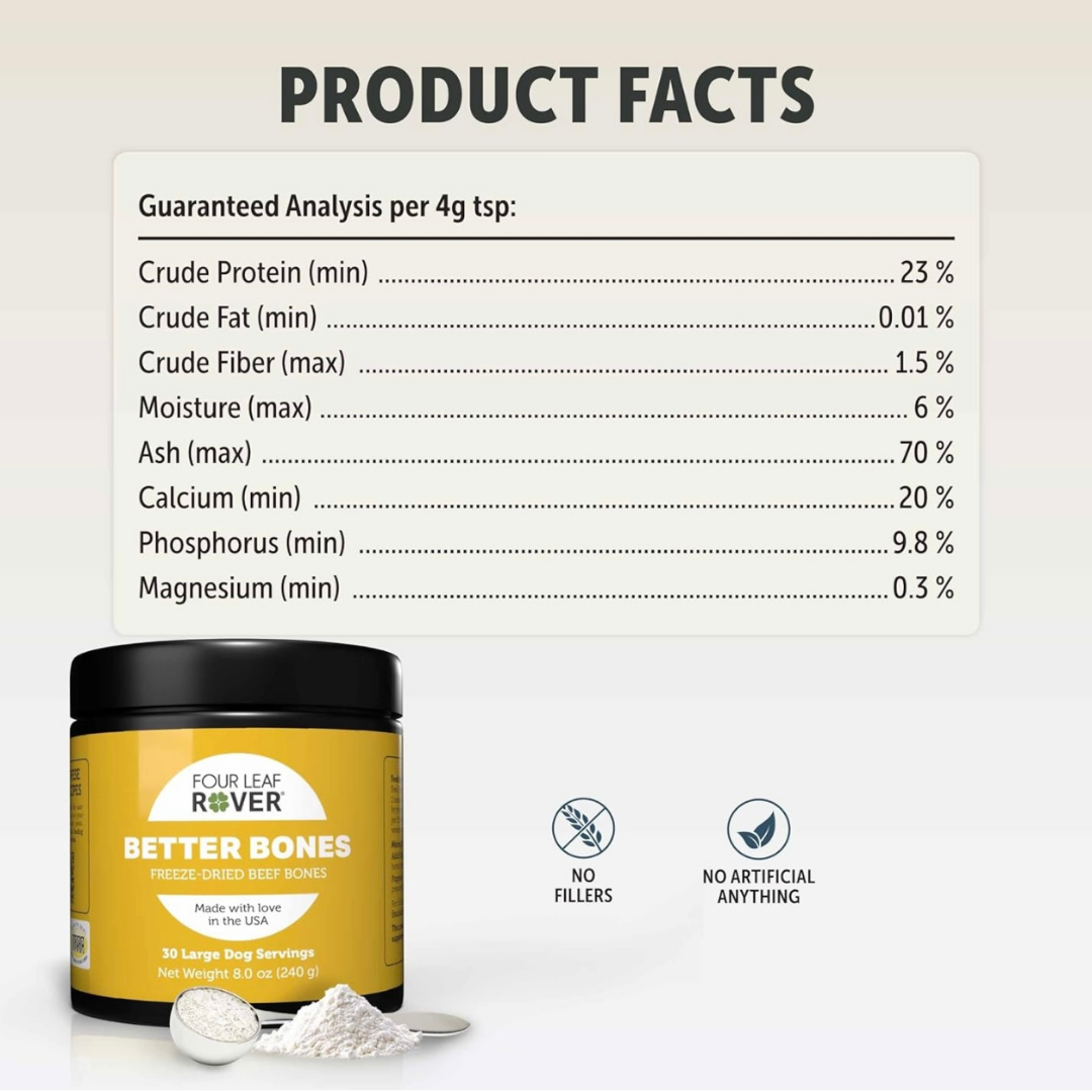 Better Bones delivers minerals the way nature intended, straight from whole bone. Unlike many calcium powders that use heat or synthetic ingredients, this bone meal is dried at low temperatures to keep the nutrients intact and easy to absorb. That makes it a safe choice for growing puppies, adult dogs, seniors, and pregnant or nursing females. It’s gentle on digestion and helps maintain a healthy mineral balance without the risks of over-supplementation.