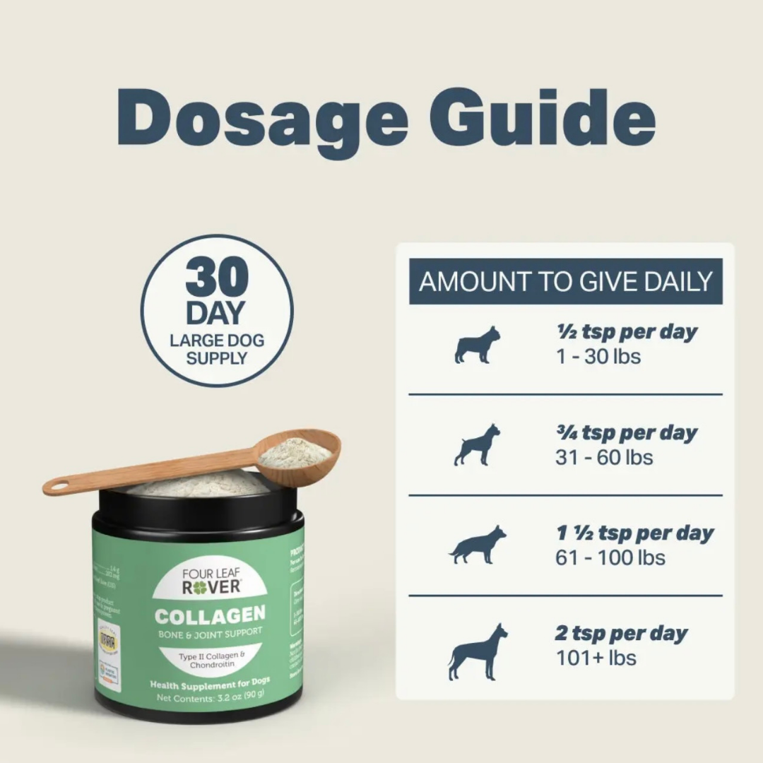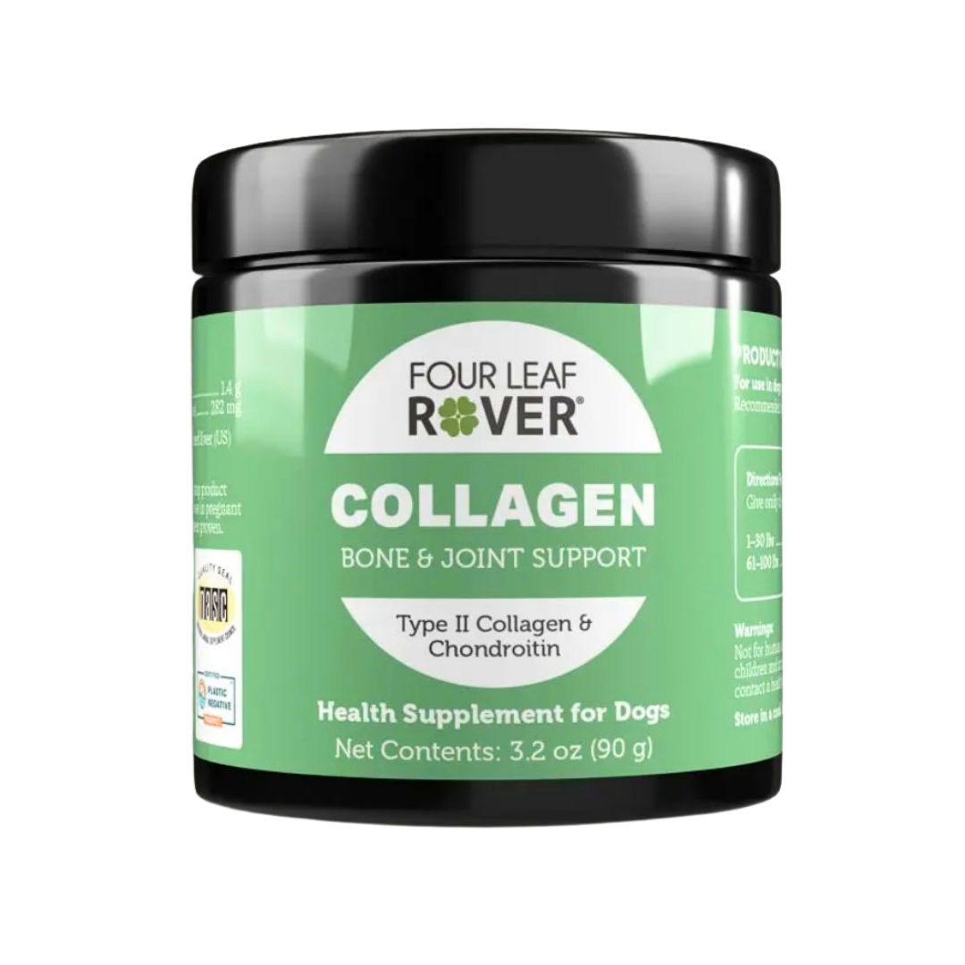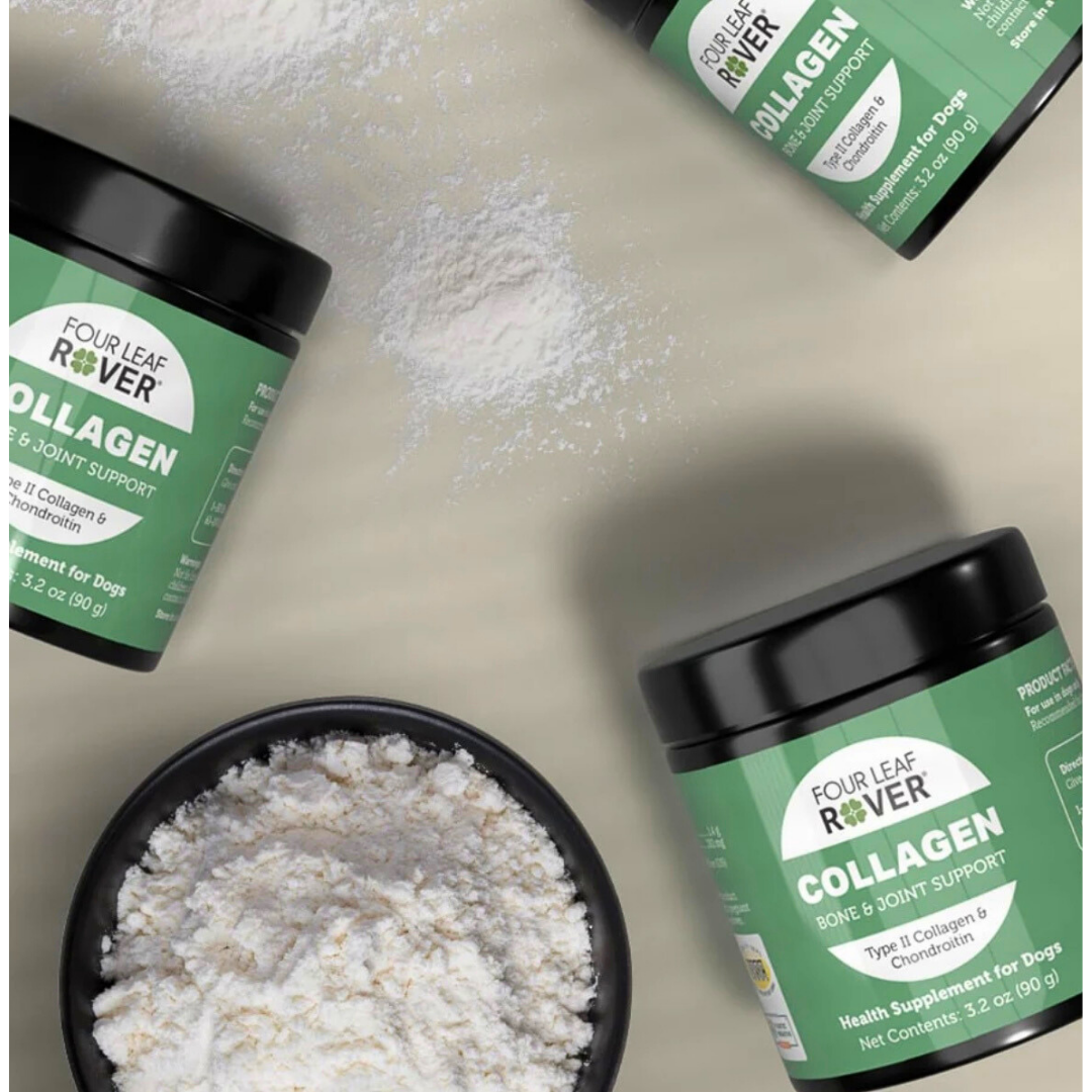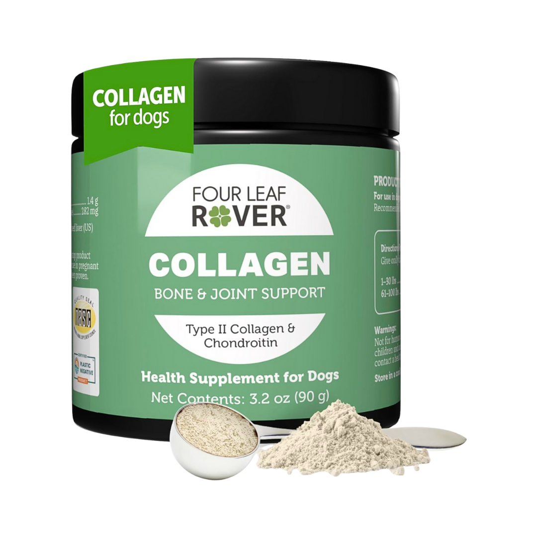 Collagen is one of the most important proteins in your dog’s body. It helps keep joints flexible, the gut lining strong, and the skin and coat healthy. But as dogs age (or face ongoing inflammation) natural collagen levels start to drop. This can lead to stiffness, gut issues, skin dryness, and slower healing. Four Leaf Rover Collagen provides a powerful blend of grass-fed, pasture-raised collagen with both Type I and Type II collagen for targeted support from nose to tail.