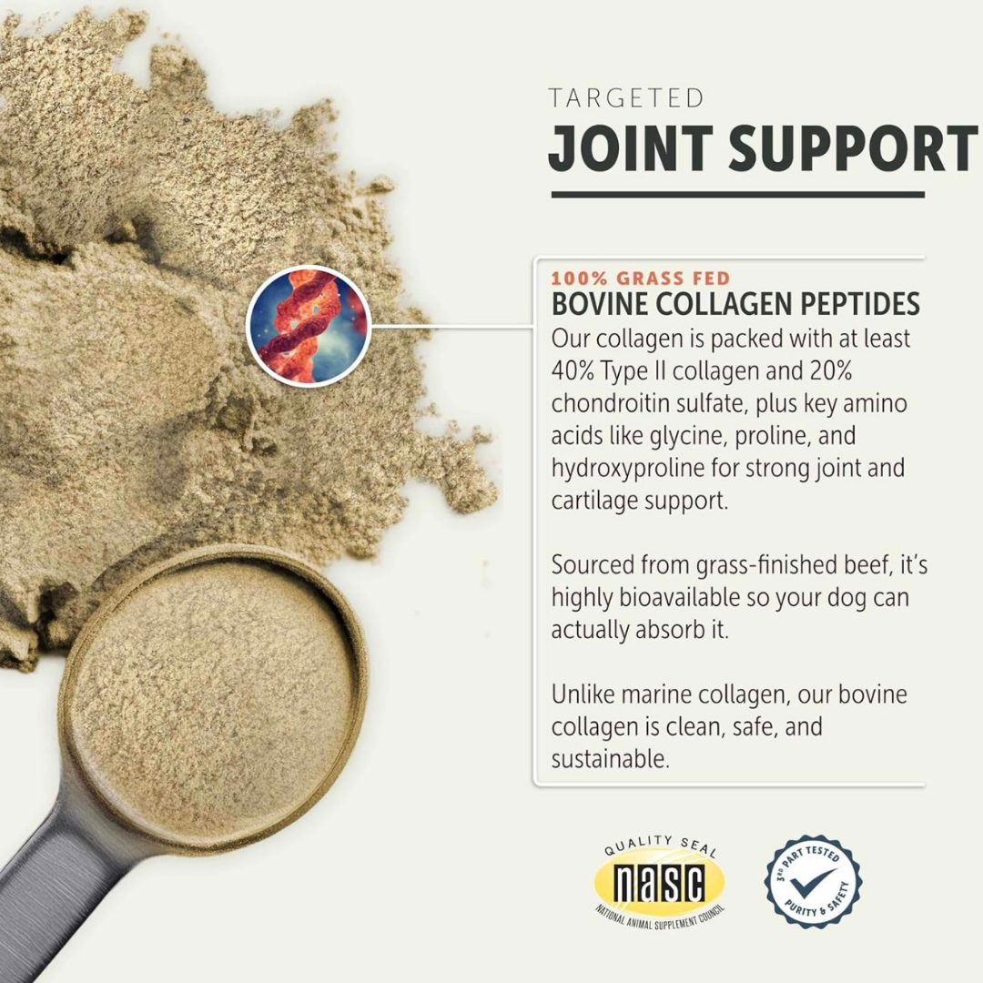 Collagen is the framework that holds your dog’s body together. Type I collagen helps support the skin, tendons, and digestive tract. Type II collagen is found mainly in joint cartilage and helps cushion and protect the joints during movement. This formula delivers both types, so your dog gets targeted support for the areas that often break down first with age - joints, digestion, and skin.