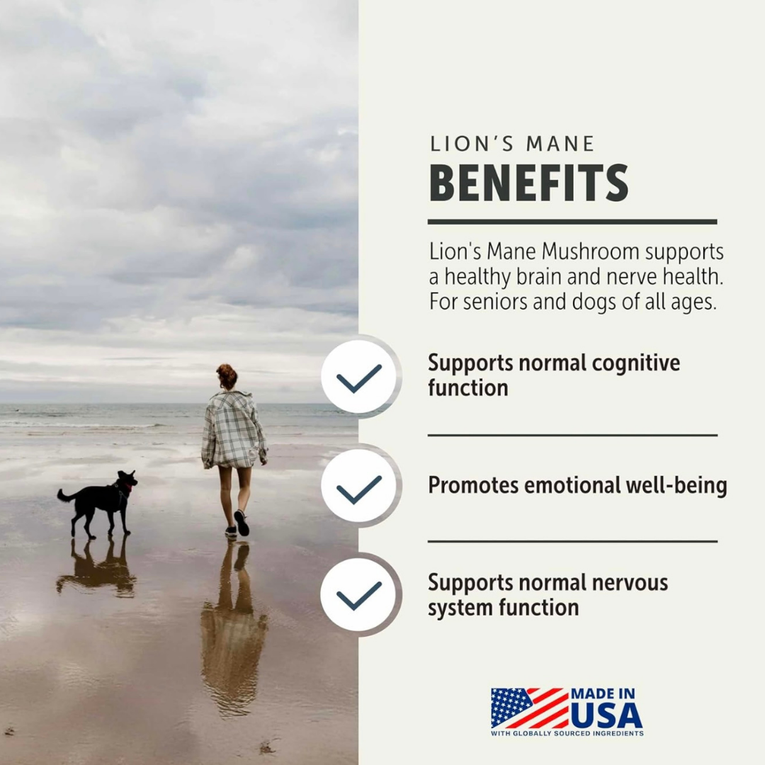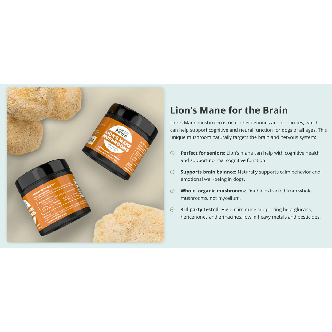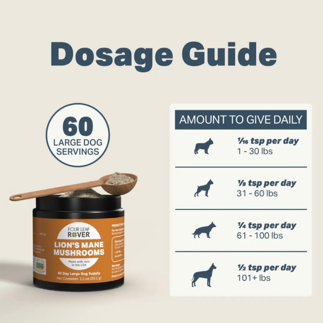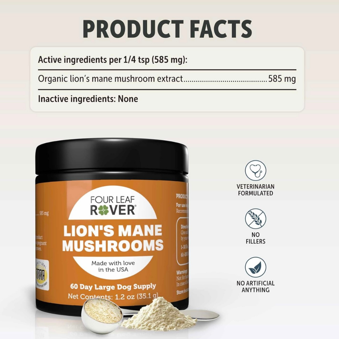Looking to support your dog’s brain, nerves, and focus especially as they age? Lion’s Mane is one of the most powerful natural ingredients for cognitive and neurological health. Sourced from 100% organic fruiting bodies and dual-extracted for maximum potency, Four Leaf Rover’s Lion’s Mane Mushroom Extract helps keep your dog mentally sharp, neurologically strong, and better able to handle stress, aging, or recovery from injury.