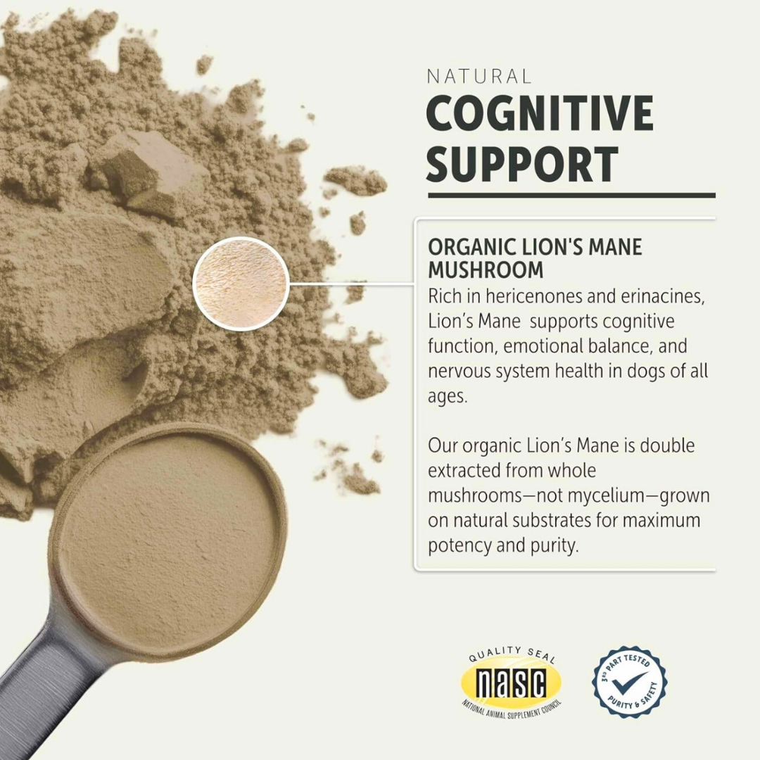 Lion’s Mane mushroom (Hericium erinaceus) is known for its ability to support the nervous system, thanks to compounds called hericenones and erinacines. These naturally help increase Nerve Growth Factor (NGF), a protein that plays a key role in repairing nerves, building new brain connections, and protecting cognitive function. This makes Lion’s Mane especially useful for senior dogs showing signs of confusion, dogs with seizures or neurological conditions, and dogs recovering from spinal injuries or inflammation affecting the brain and spine.