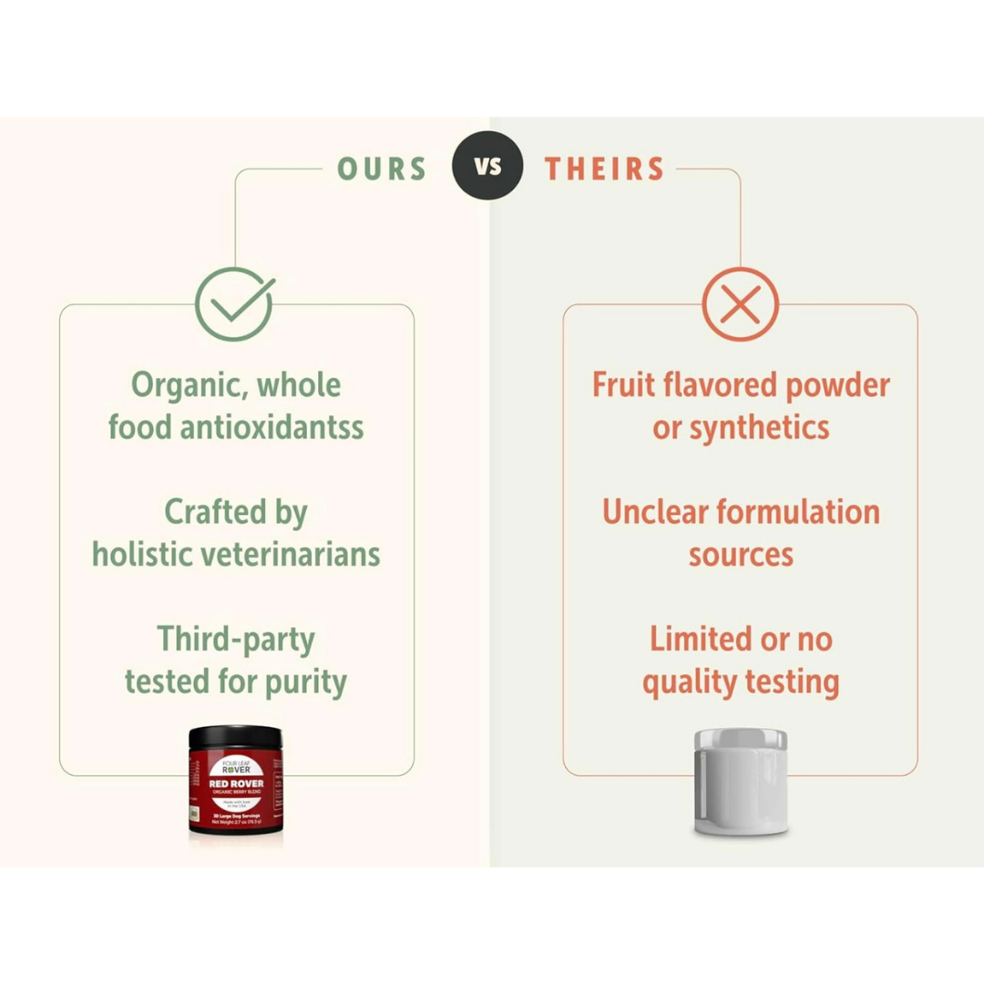 Red Rover uses whole-food sources of antioxidants that are easy for dogs to absorb. These include quercetin, anthocyanins, ellagic acid, and proanthocyanidins - plant compounds shown to support immune function, reduce inflammation, and protect the brain, heart, and tissues.