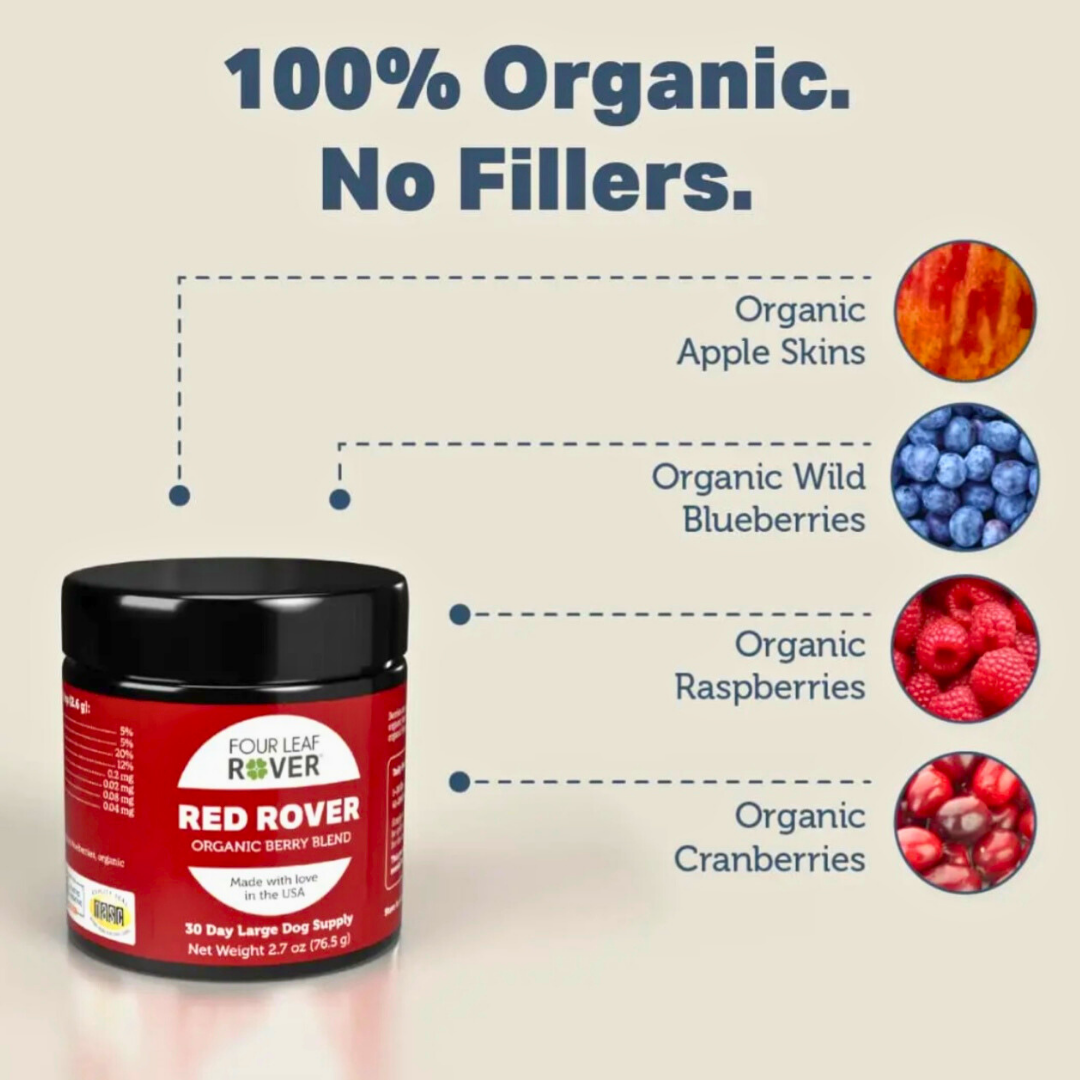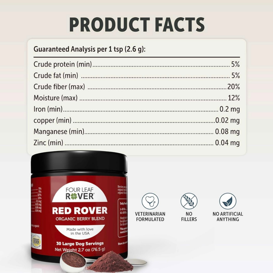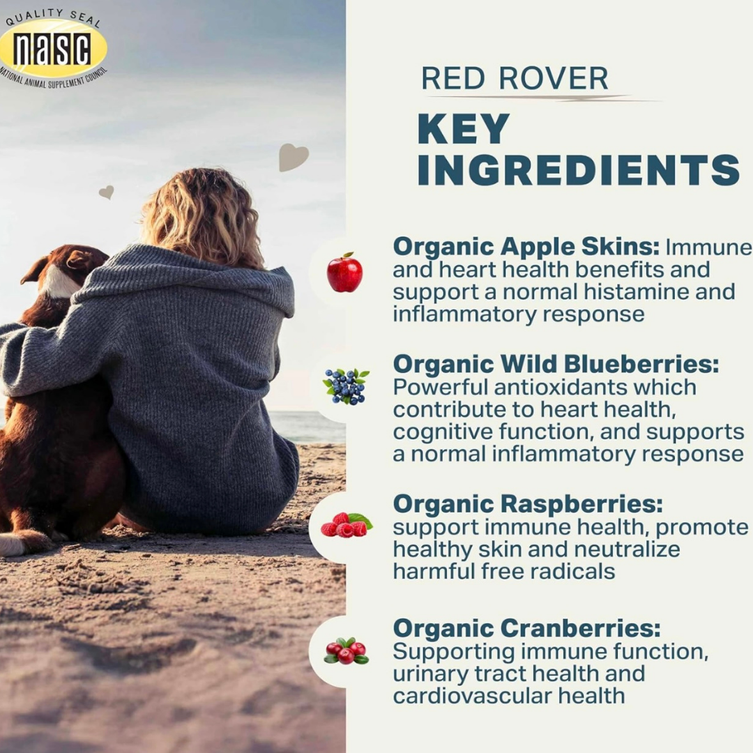 Red Rover is an excellent supplement packed with organic berries like blueberries, raspberries, and cranberries, each rich in antioxidants that support immune health and cognitive function. The addition of organic apple skin provides a natural source of quercetin, helping to maintain normal histamine levels, which is especially beneficial for dogs with allergies like mine. It's easy to use and my dog loves the taste.