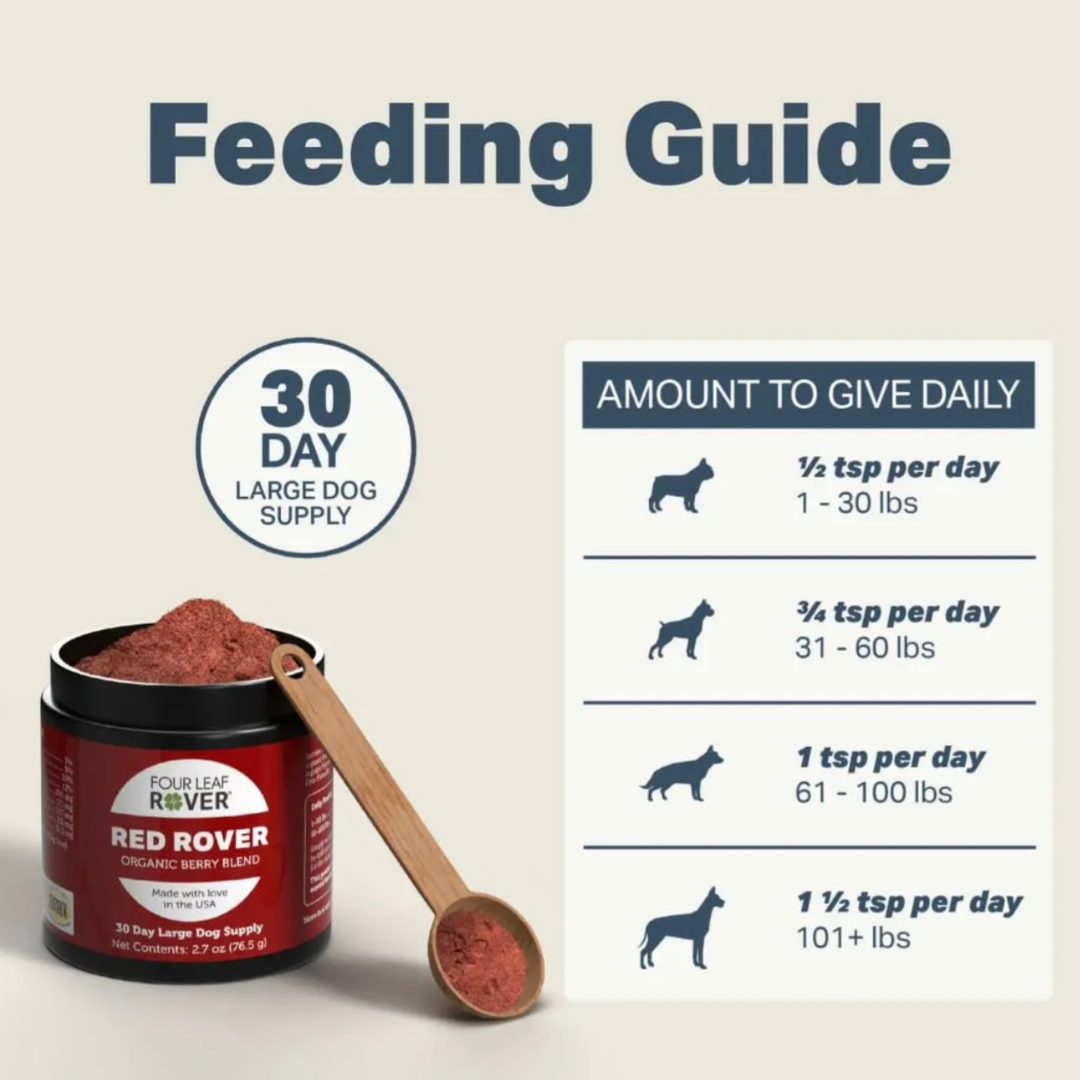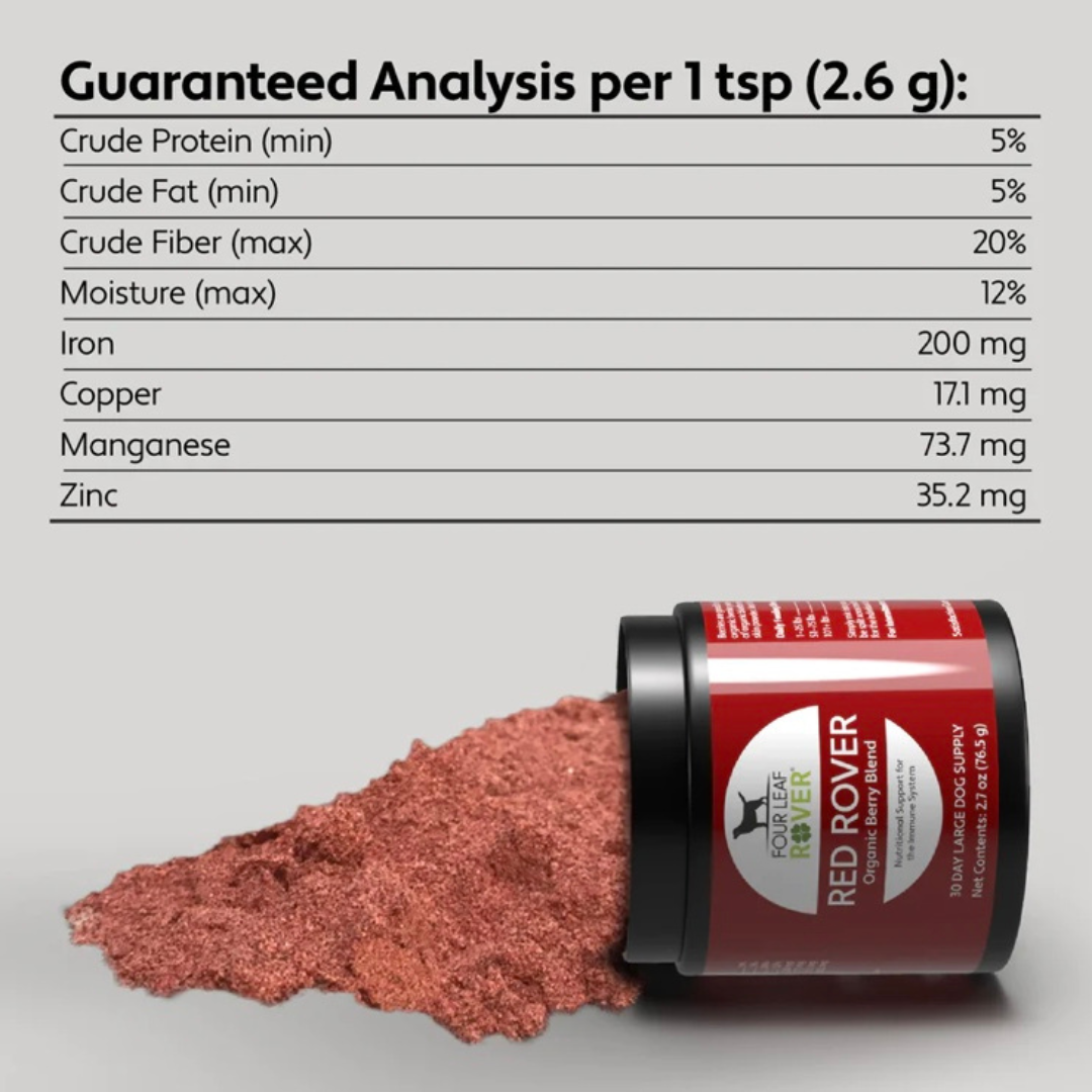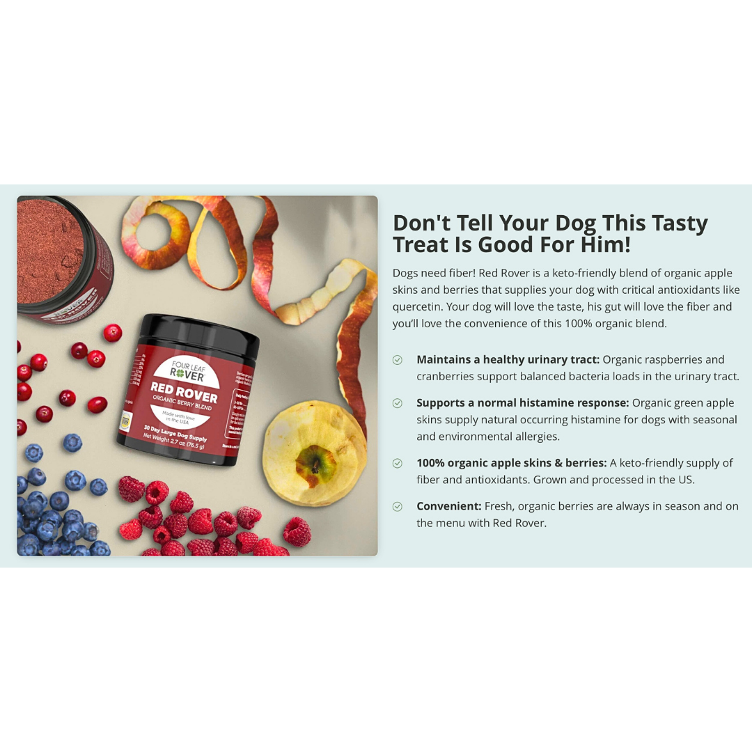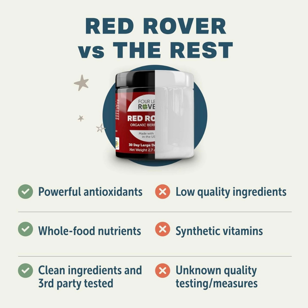 Red Rover is an excellent supplement packed with organic berries like blueberries, raspberries, and cranberries, each rich in antioxidants that support immune health and cognitive function. The addition of organic apple skin provides a natural source of quercetin, helping to maintain normal histamine levels, which is especially beneficial for dogs with allergies like mine. It's easy to use and my dog loves the taste.