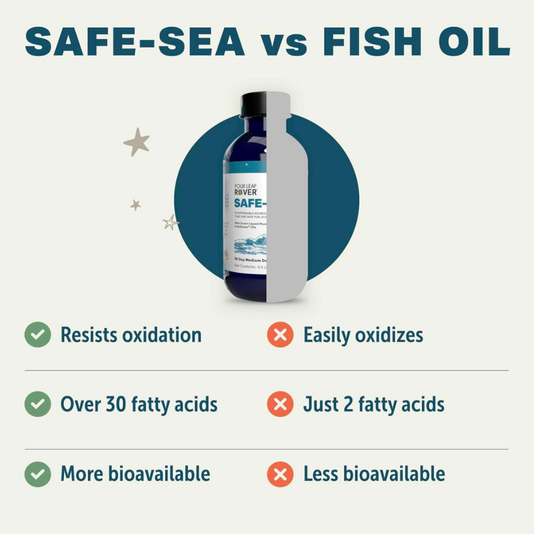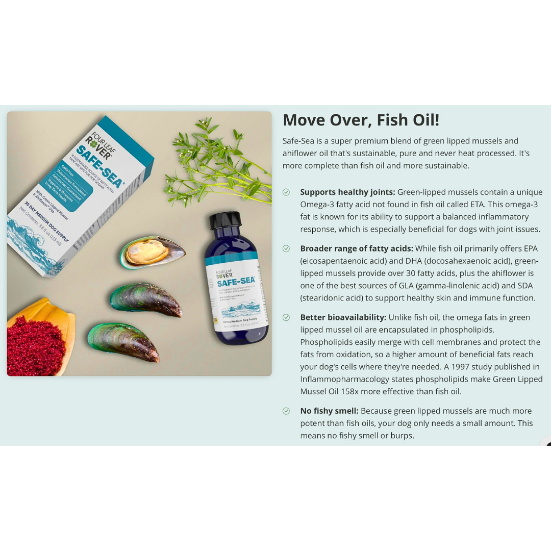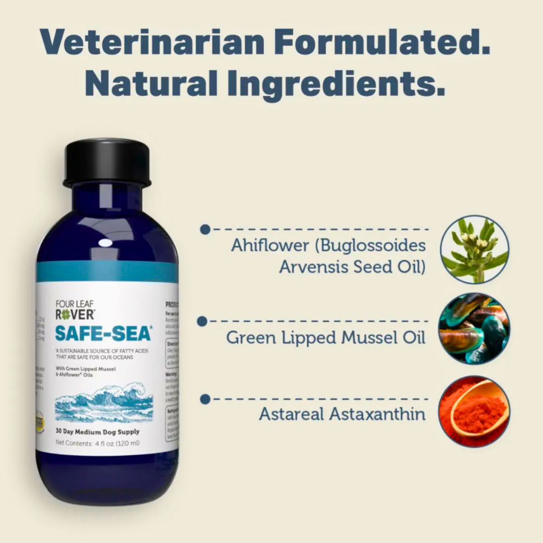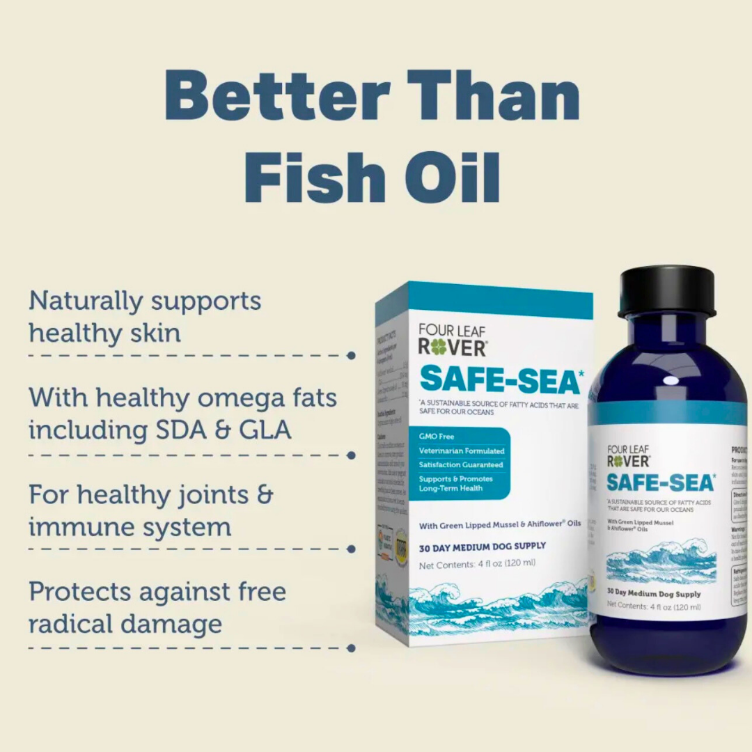 Omega-3s are essential for every dog, but quality matters. They are one of the most important nutrients for dogs but not all sources are clean, balanced, or effective. Four Leaf Rover Safe-Sea offers a smarter, more sustainable solution. It combines green lipped mussel oil, Ahiflower oil, and astaxanthin into one powerhouse supplement that helps reduce inflammation and support your dog’s joints, brain, heart, skin, and immune system.