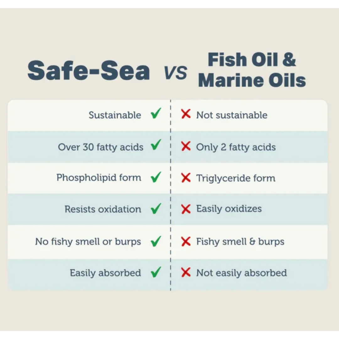 Unlike fish oil, which can oxidize quickly and may contain heavy metals or environmental toxins, Safe-Sea is a clean and eco-conscious alternative with naturally balanced omega-3s, 6s, and 9s - no fish required.