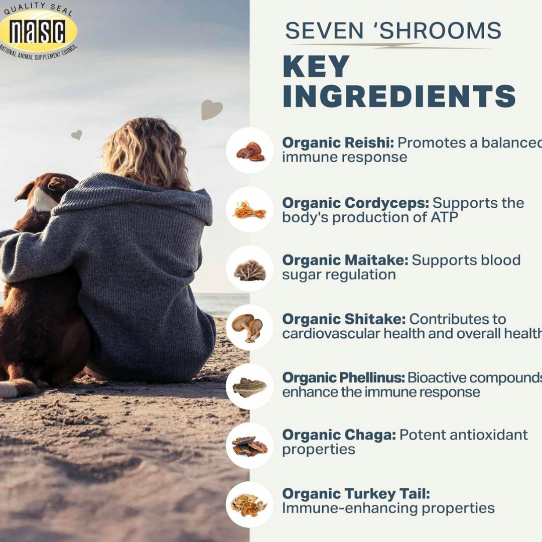 With a thoughtfully formulated blend of 7 organic mushrooms, Seven Shrooms delivers comprehensive support for your dog’s immune system, cellular health, and long-term wellness helping them stay strong and supported from the inside out.