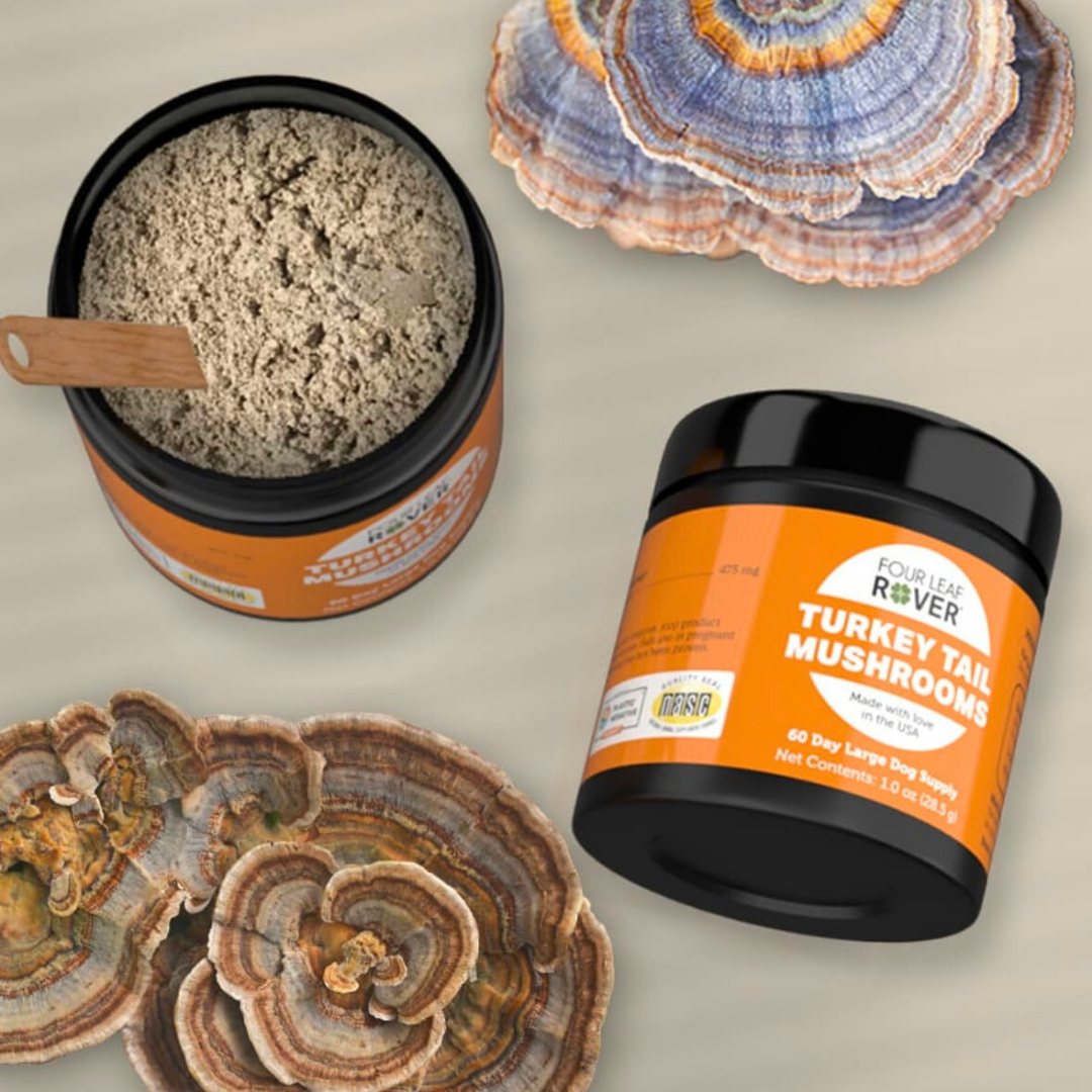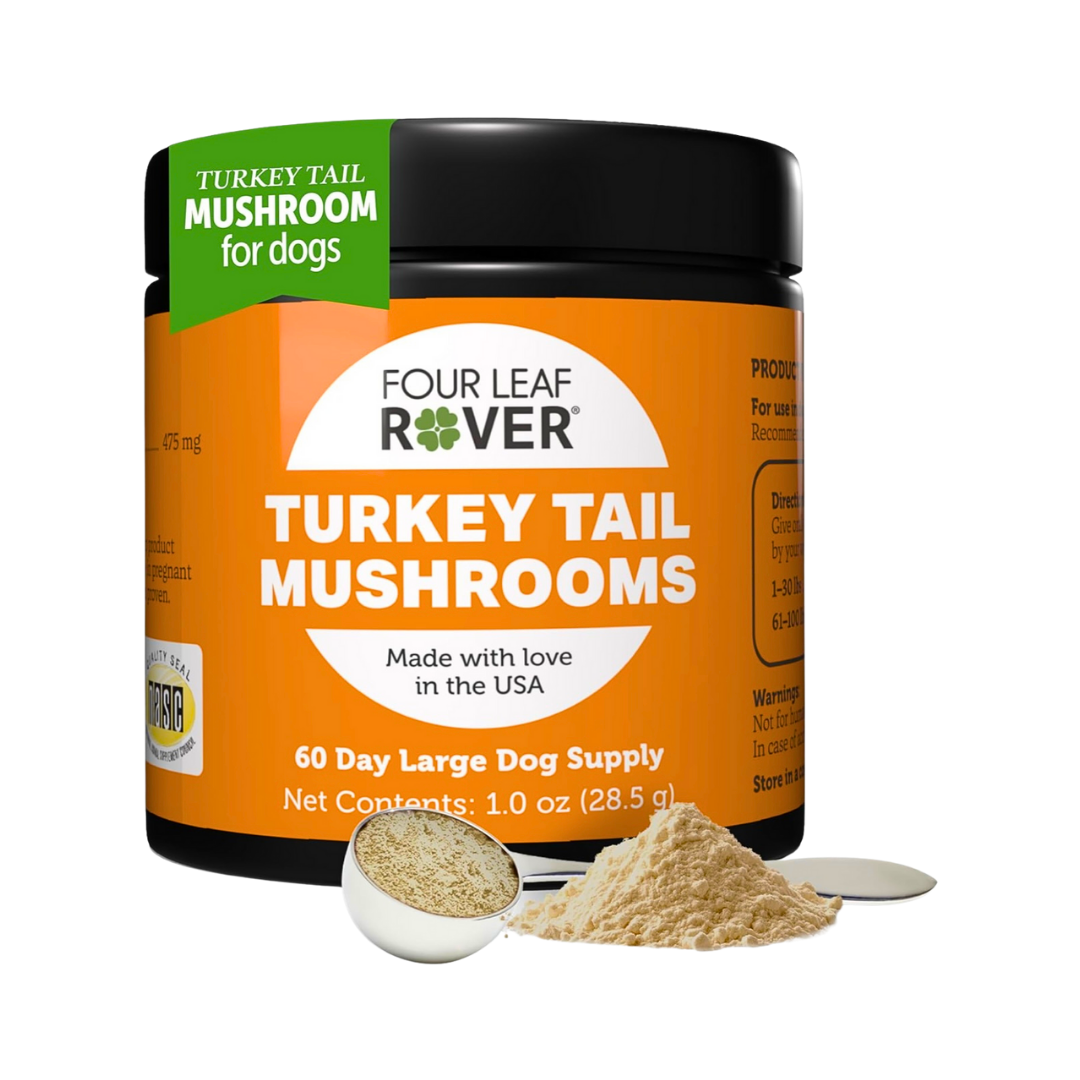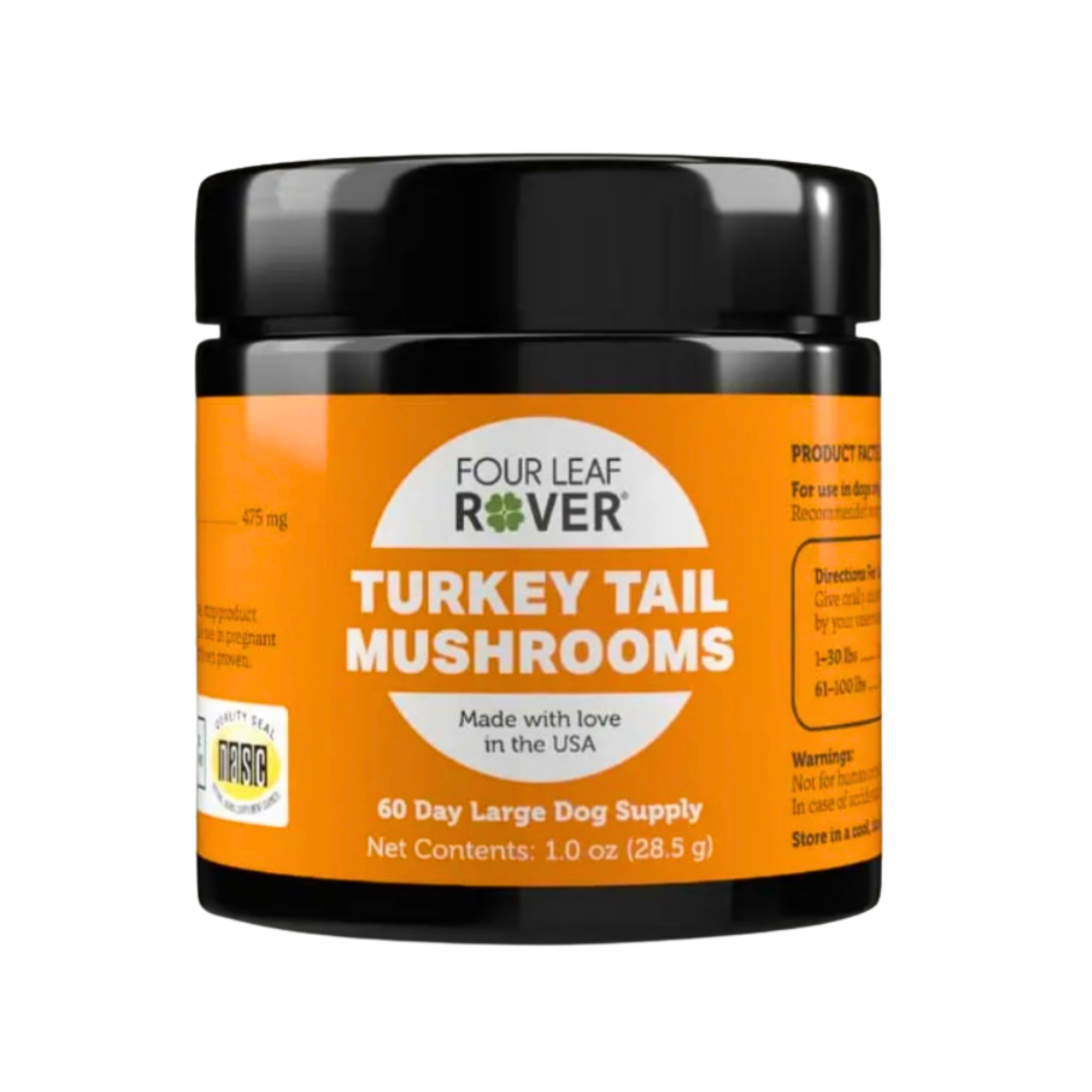 Four Leaf Rover Turkey Tail is made from 100% organic fruiting bodies, never mycelium, and is dual-extracted to preserve the full spectrum of its beneficial compounds. It’s rich in immune-modulating beta-glucans (≥50%) to support dogs with chronic illness, allergies, cancer, or gut issues.