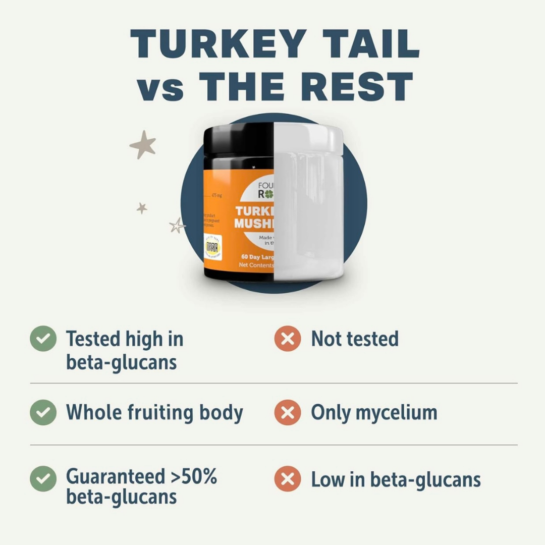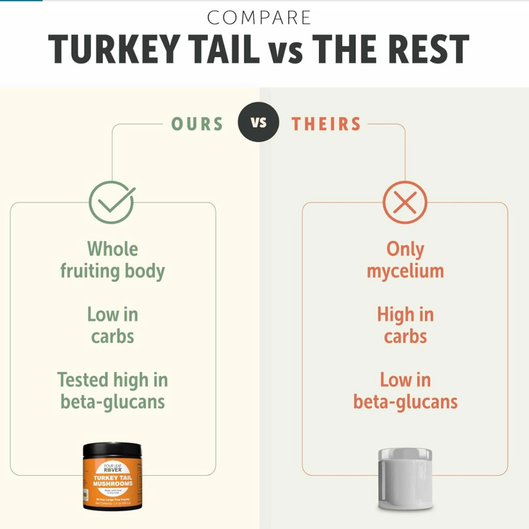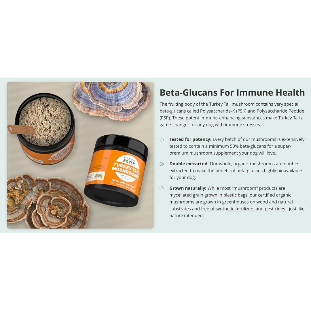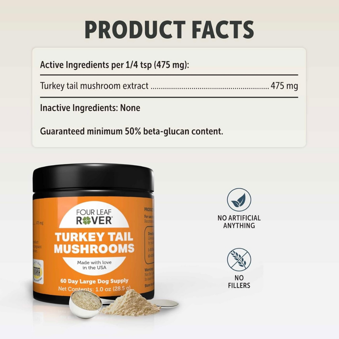 Four Leaf Rover Turkey Tail is made from 100% organic fruiting bodies, never mycelium, and is dual-extracted to preserve the full spectrum of its beneficial compounds. It’s rich in immune-modulating beta-glucans (≥50%) to support dogs with chronic illness, allergies, cancer, or gut issues.