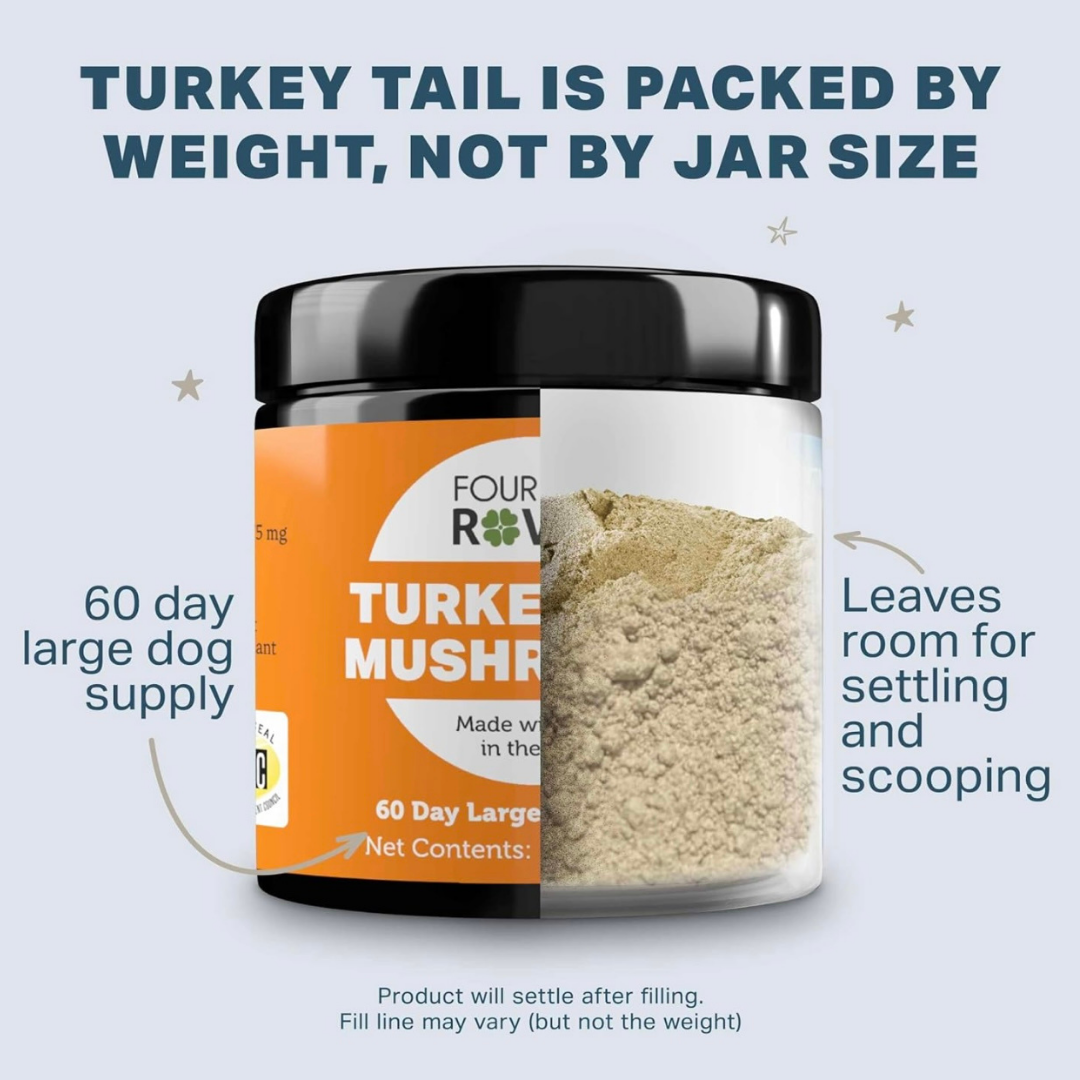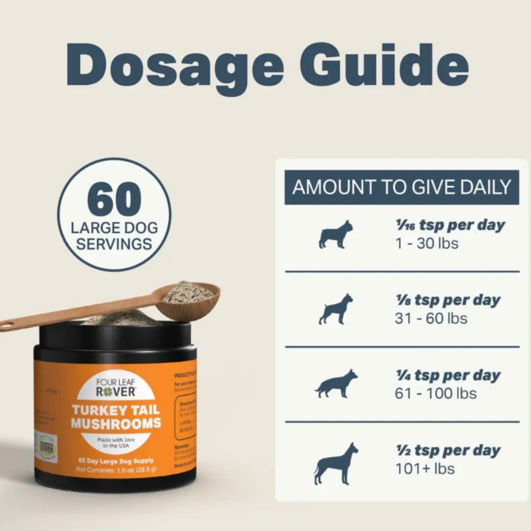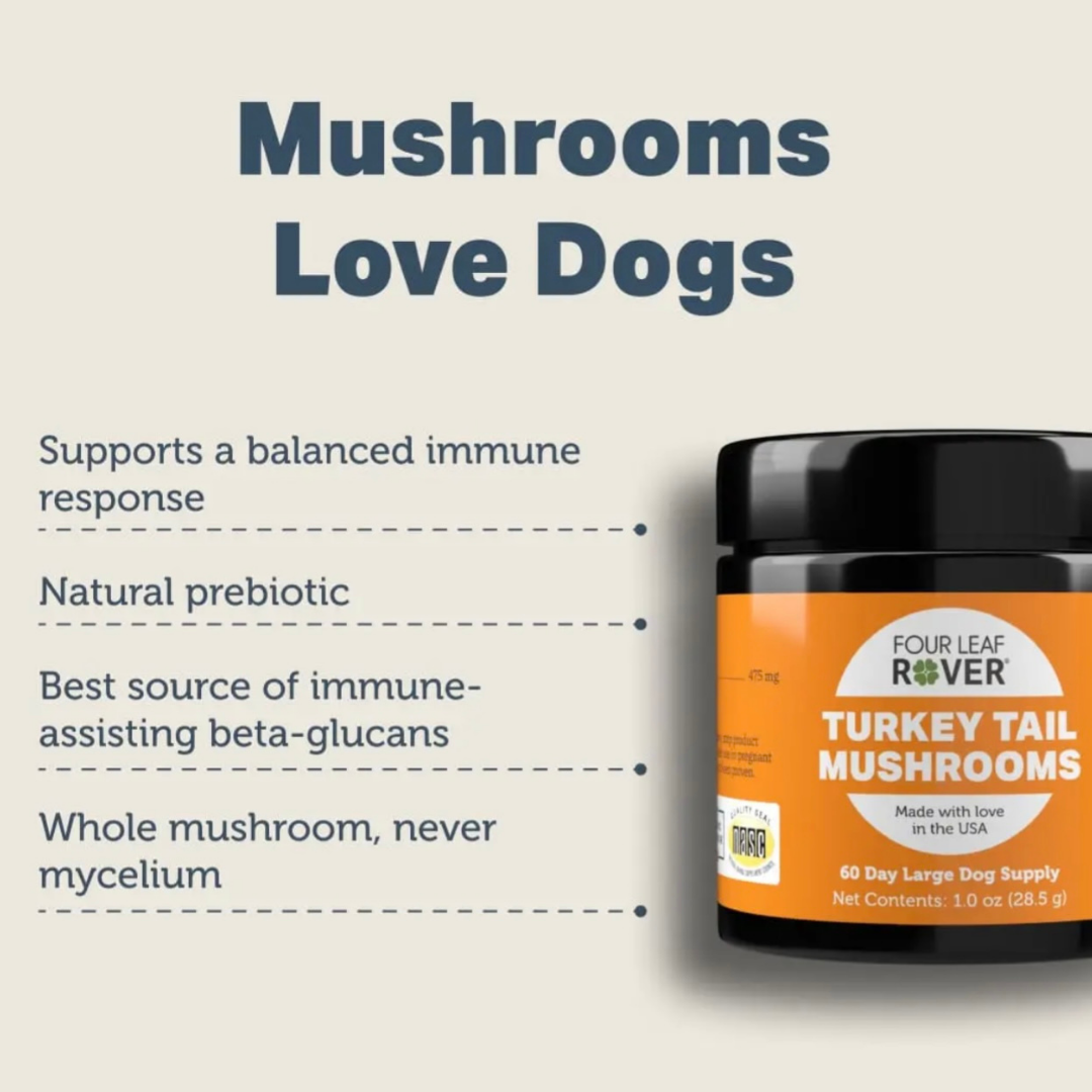With powerful beta-glucans and gut-balancing compounds, Four Leaf Rover Turkey Tail helps your dog build a stronger immune foundation, support healthy digestion, and recover more easily - naturally and effectively.
