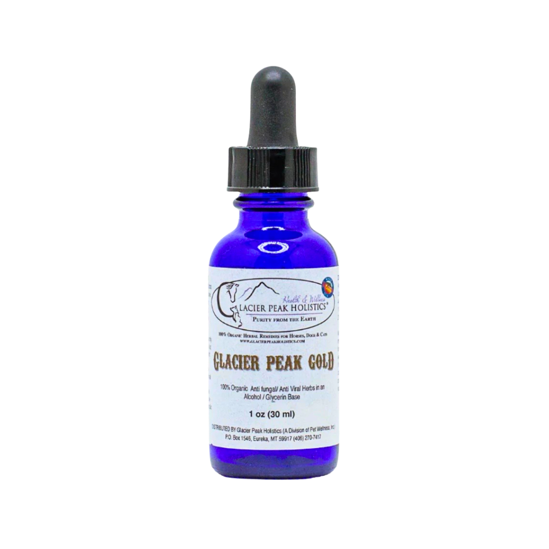 When your dog’s body is out of balance, yeast can thrive—especially in the gut, ears, paws, and skin.Glacier Peak Gold is a potent herbal tincture designed to support dogs dealing with chronic yeast, itching, musty skin odor, paw licking, ear gunk, and digestive upset. This carefully crafted formula blends antifungal, immune-modulating, and mucosal-supportive herbs to help your dog restore balance from the inside out.