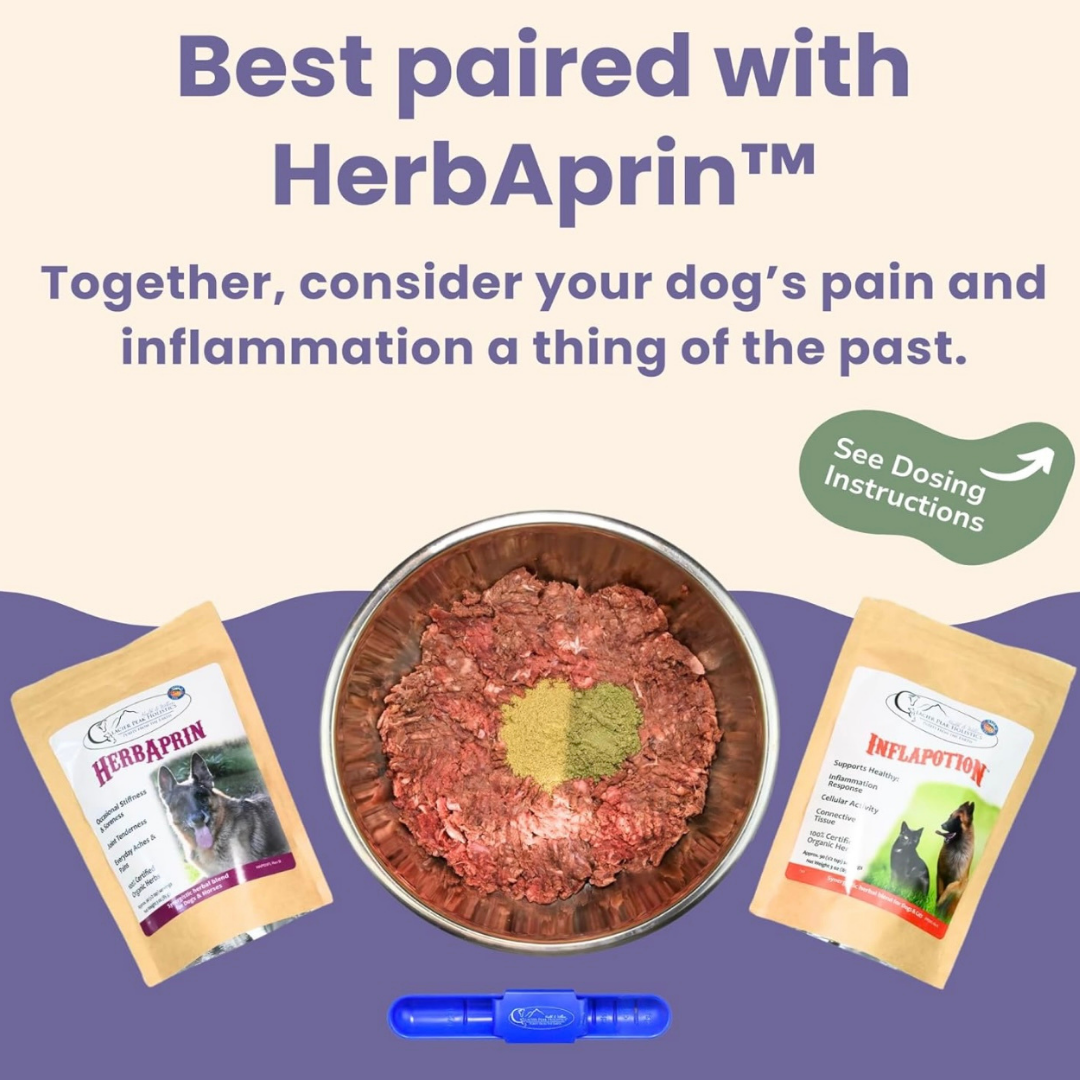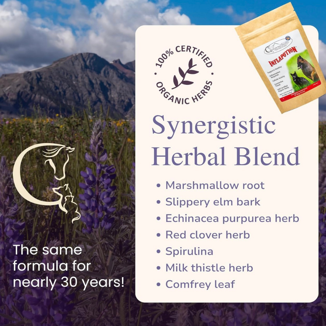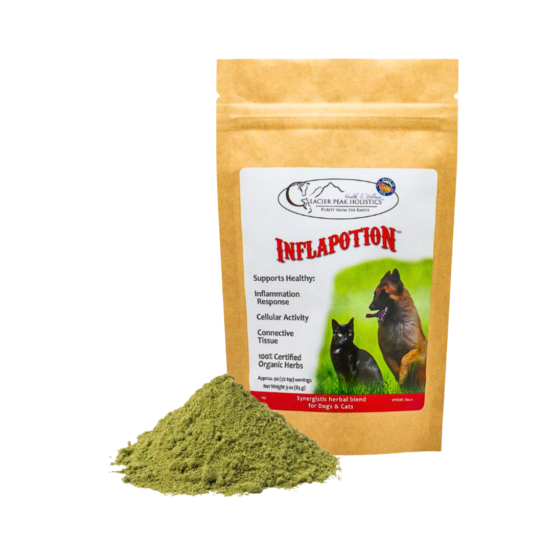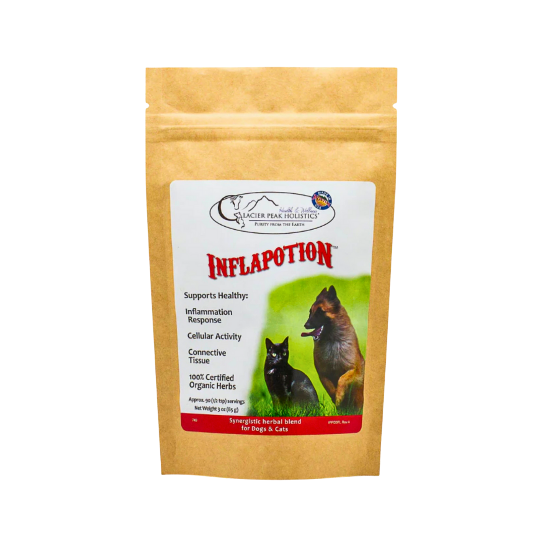 Chronic inflammation is at the root of many common dog health issues—from joint stiffness and digestive upset to skin irritation and immune dysregulation. Inflapotion is a thoughtfully formulated blend of anti-inflammatory herbs that help calm the inflammatory response naturally for a more comfortable, mobile, and happy life.