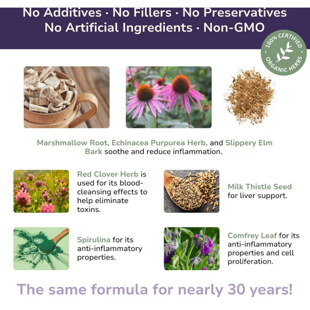 → Red Clover Herb – Rich in phytonutrients and antioxidants, supports detoxification and blood flow to help clear inflammatory byproducts