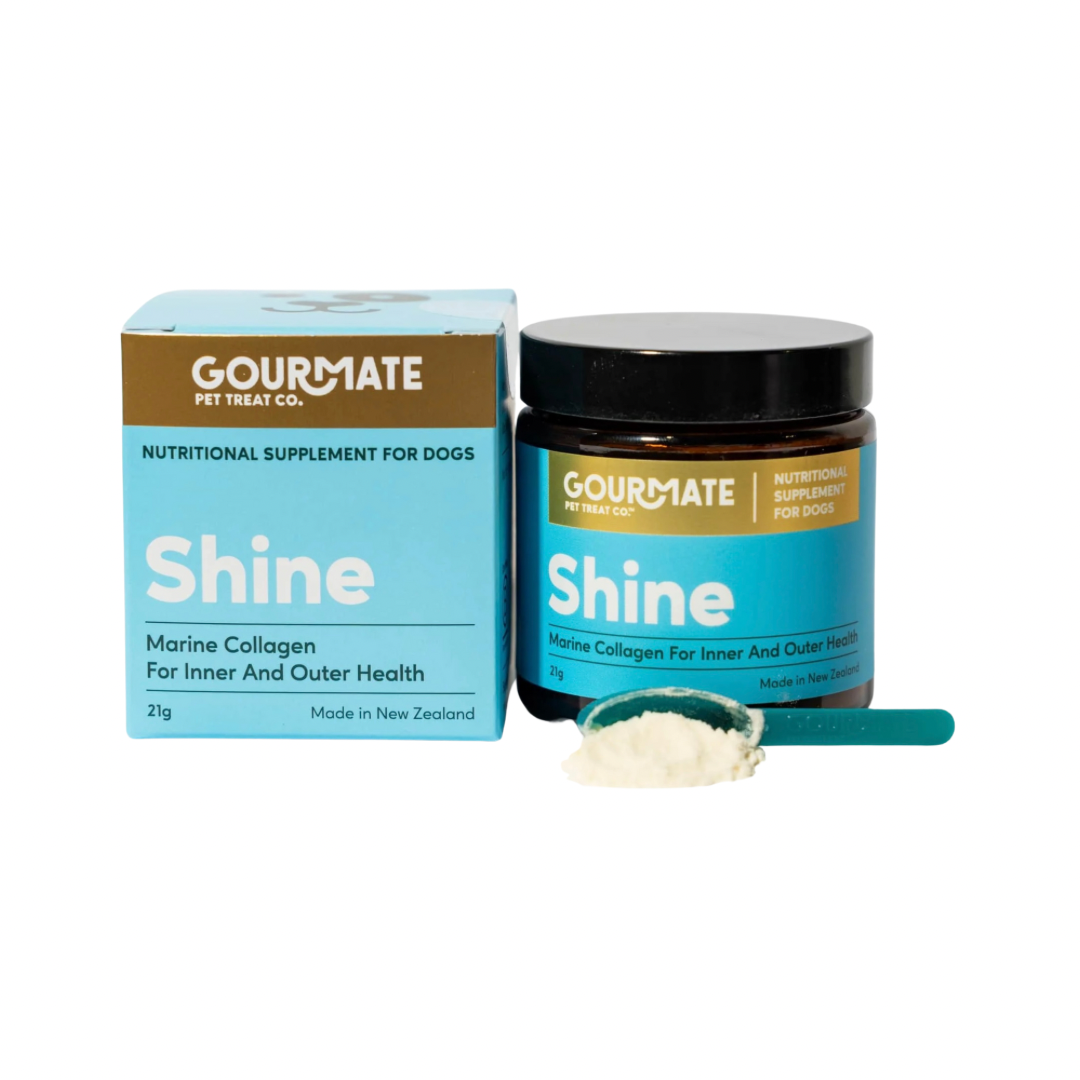 Gourmate Shine offers clean, powerful collagen support from the sea—helping your dog feel better, move easier, and look healthier, one scoop at a time.