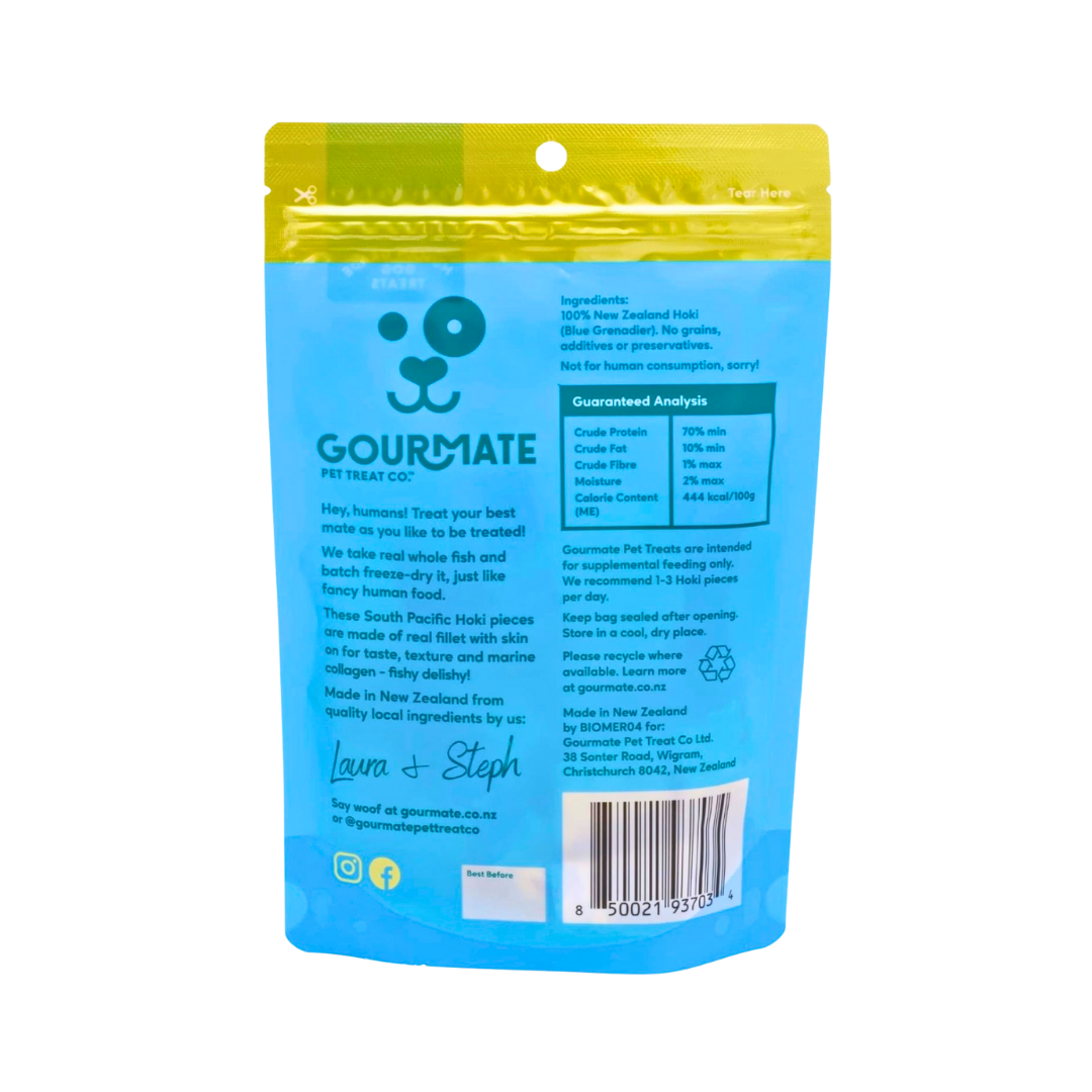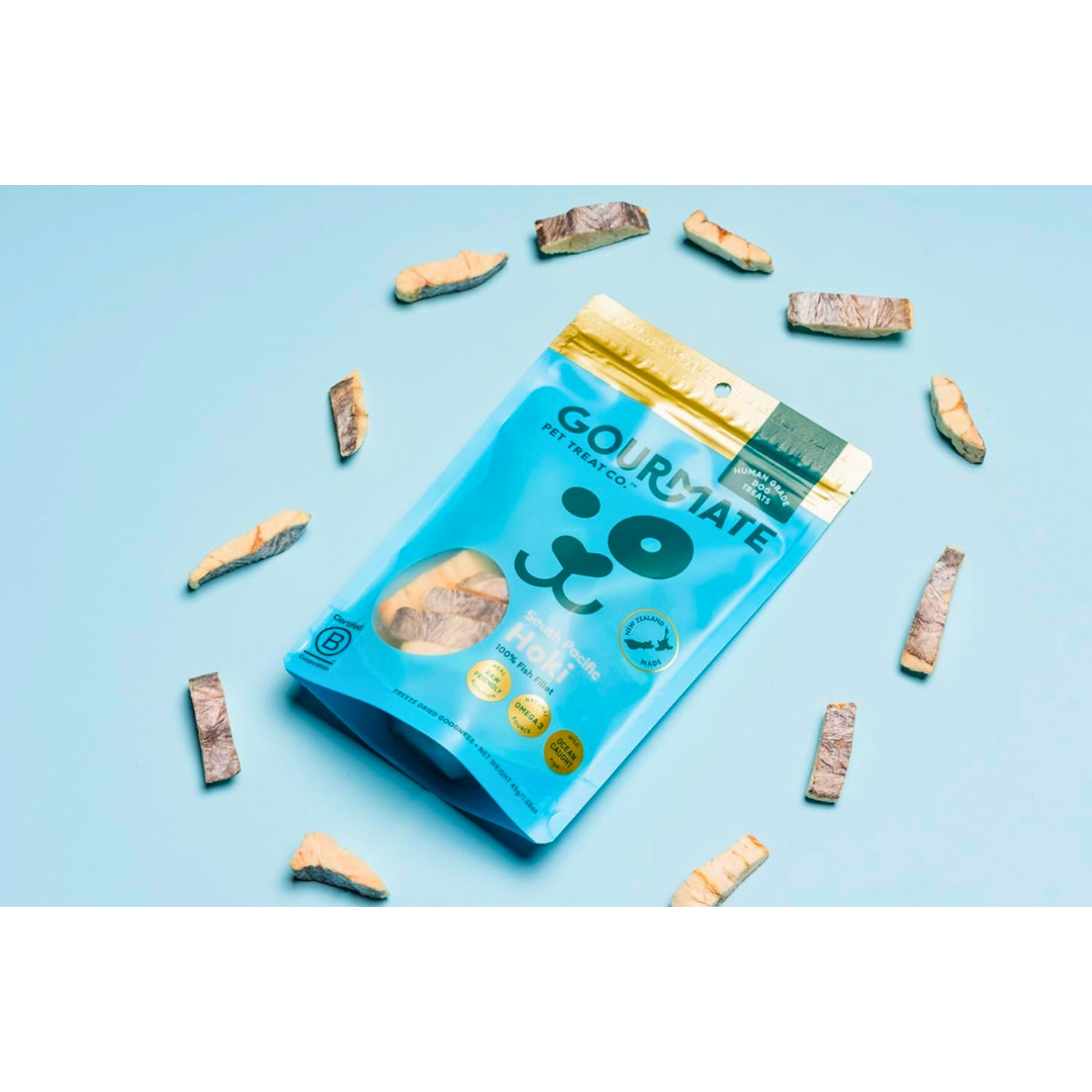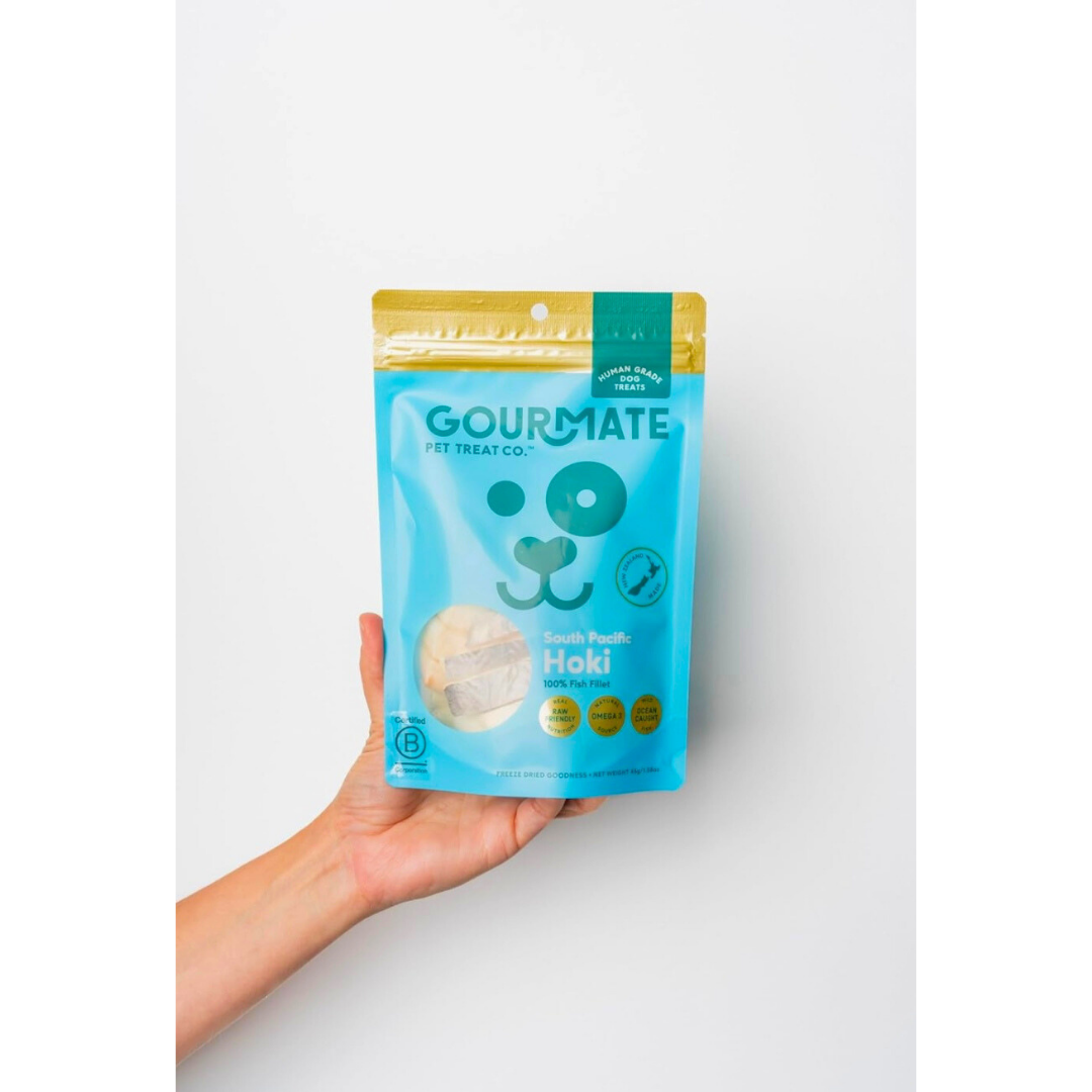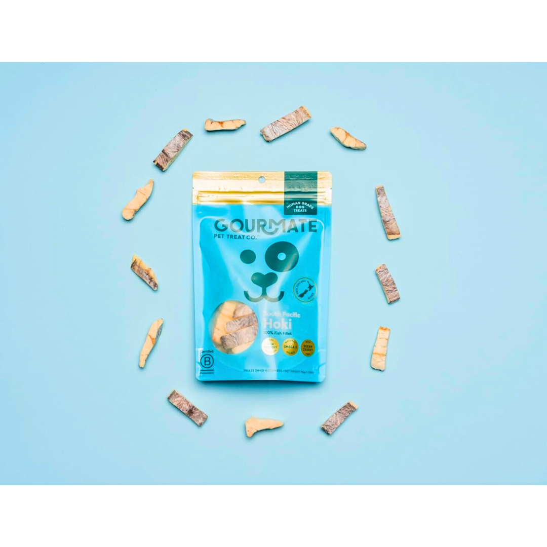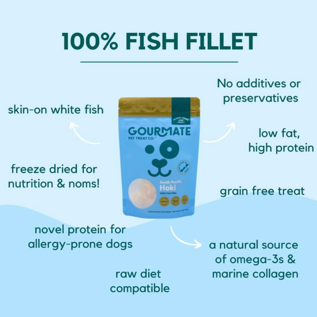 Gourmate South Pacific Hoki delivers clean, freeze-dried nutrition from the sea—supporting your dog’s skin, brain, and joints with every bite.