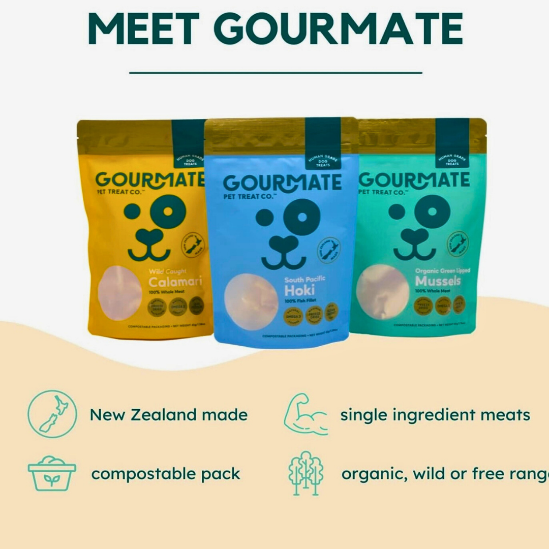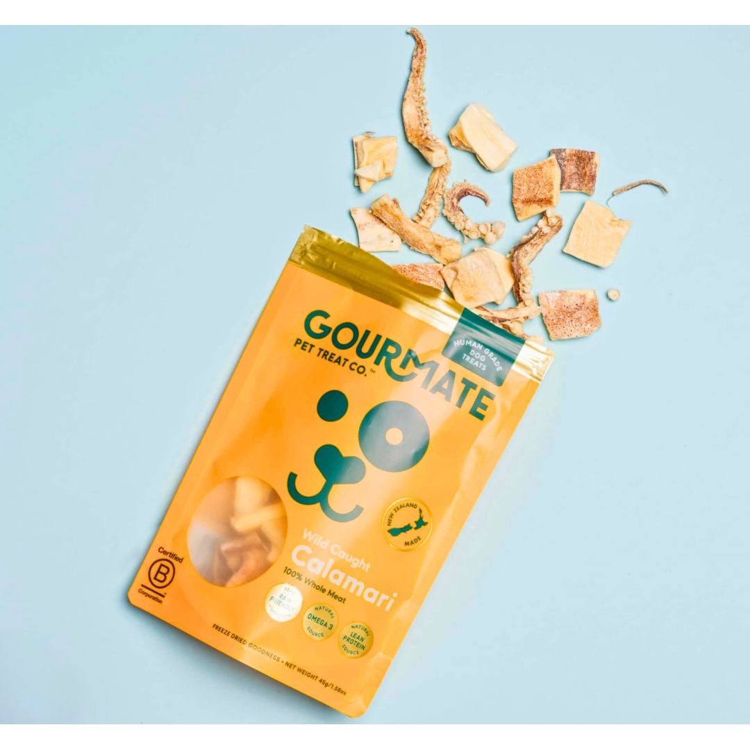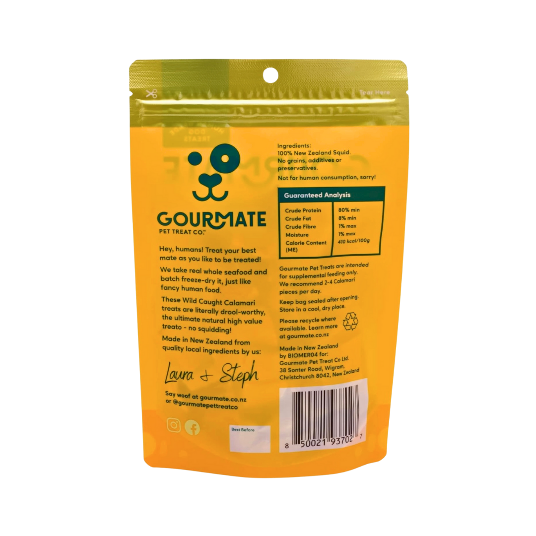 Gourmate Pet Treat Co. sources its squid from the pristine waters of New Zealand, ensuring the highest quality and sustainability standards. By choosing sustainably caught squid, these treats support your dog’s health while contributing to environmentally friendly fishing practices and marine conservation efforts.