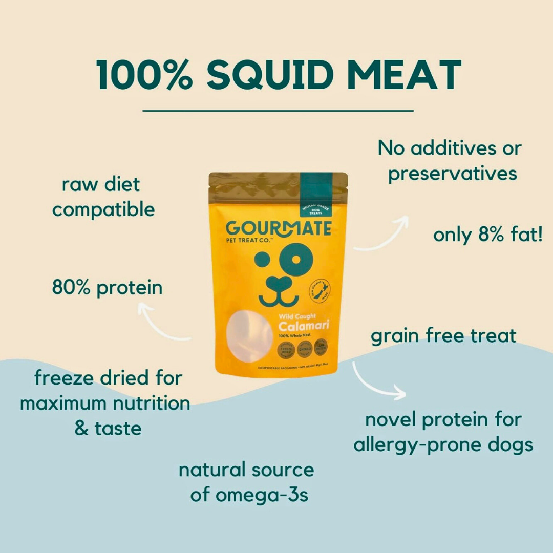 These are fantastic. They are cut in little squares and don’t look like squid ( I hate that at restaurants when my calamari labs tentacles 😂) All of my dogs are OBSESSED and I can rest easy knowing it won’t bother any of their intolerances. Plus, I really like the owners of Gourmate. They make sure every is of the highest quality!