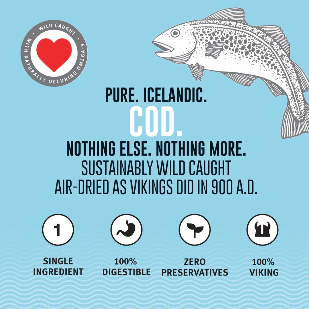 - Made from 100% wild-caught Icelandic cod, rich in Omega-3s for healthy skin, coat, and joints
